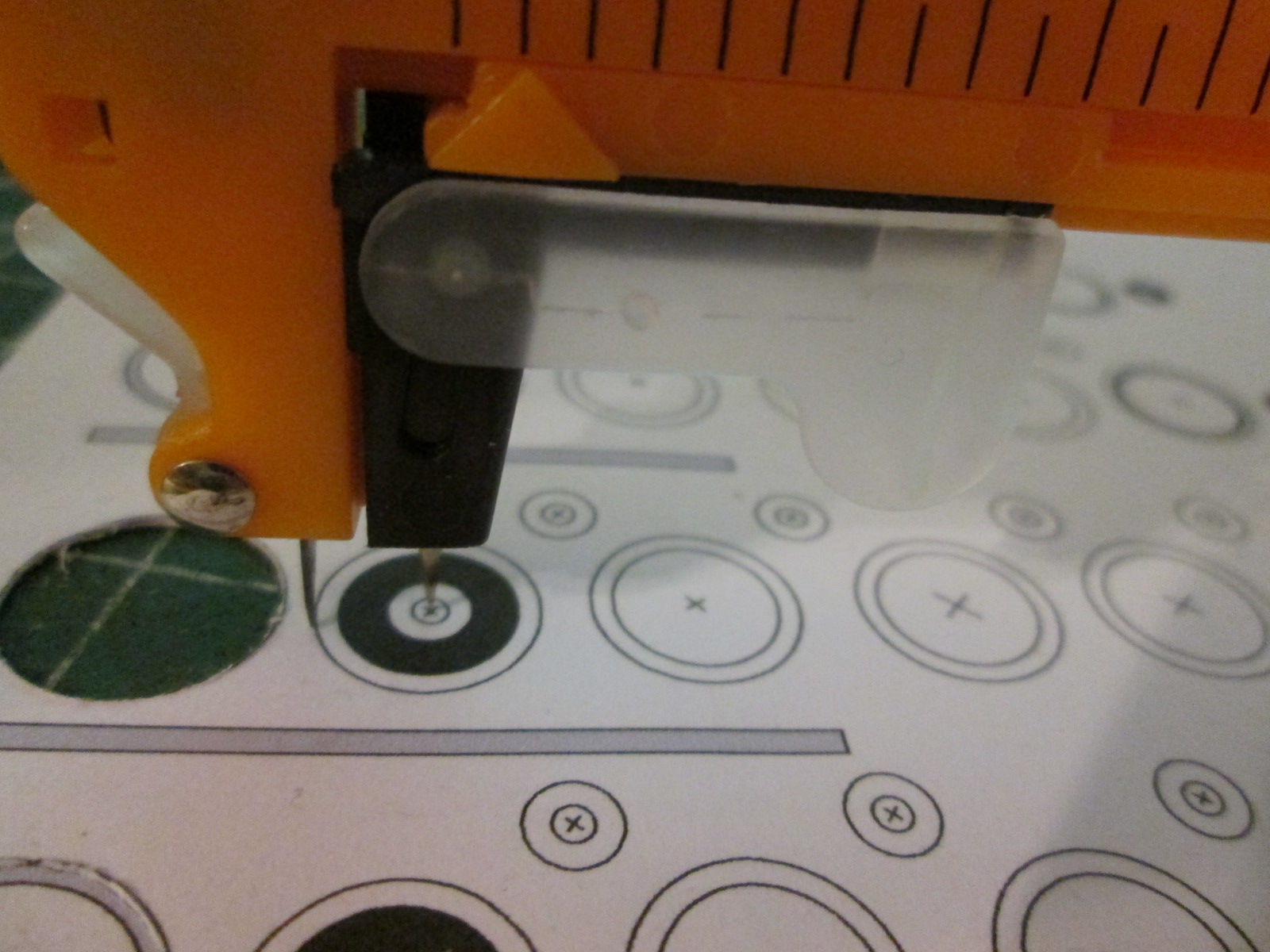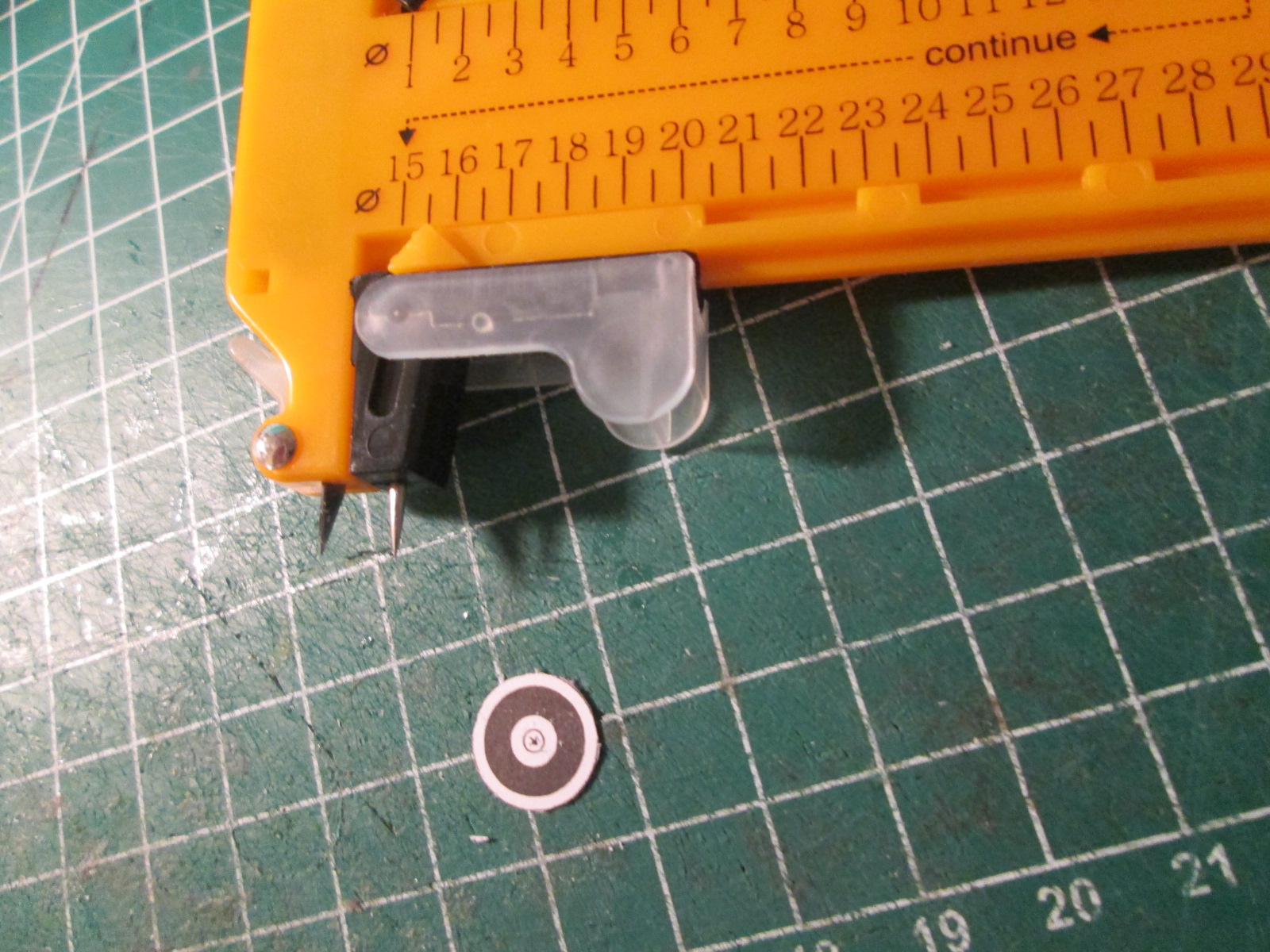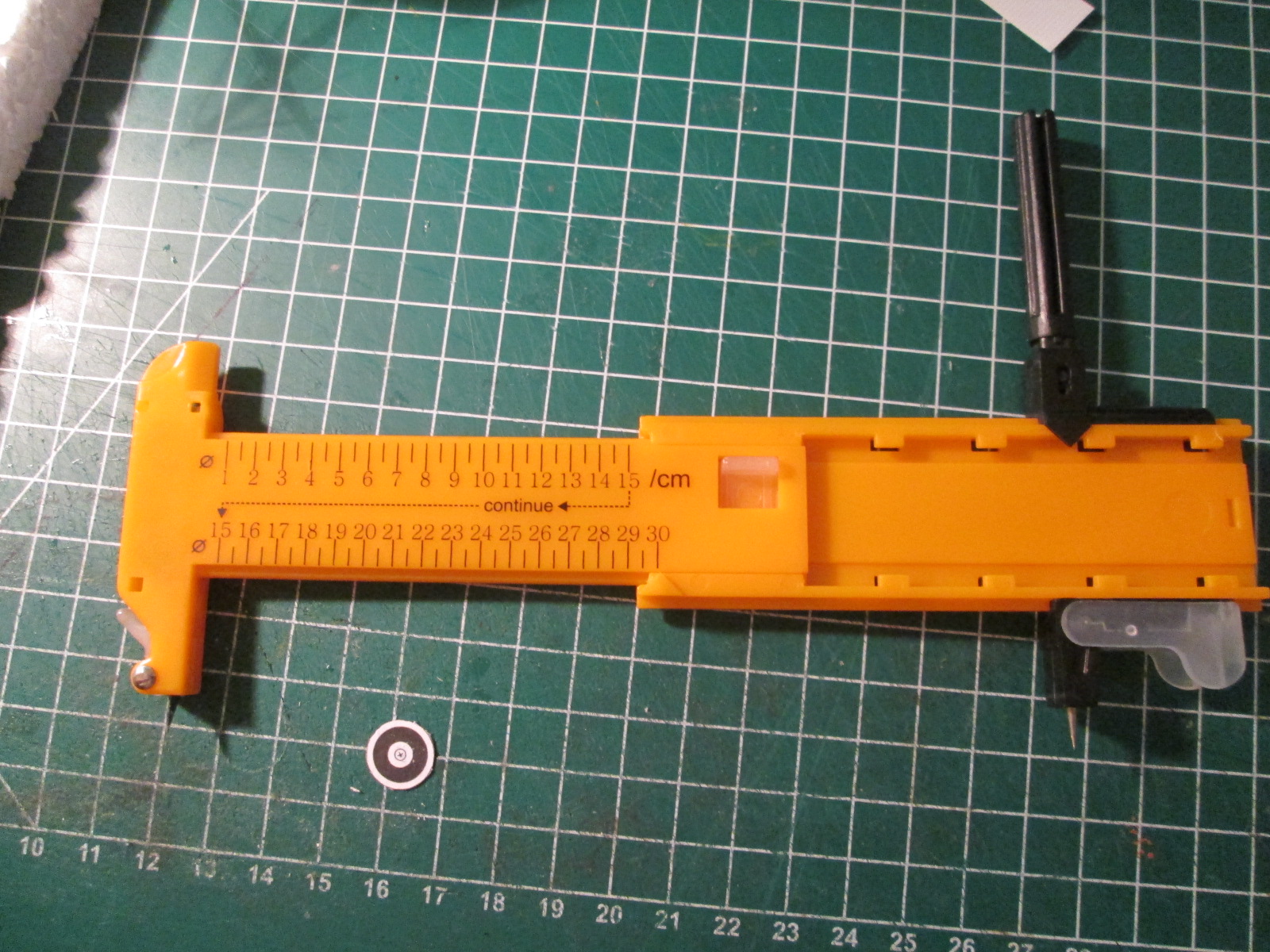 в собранном виде в рабочем состоянии вырезание колеса из бумаги минимального радиуса, который позволяет инструмент результат можно вырезать и радиусом 15 см и радиусом 30 см (максимальное значение) пробовал резать и на пластике, тоже вполне годится, но нужно приноровиться. сразу сильно давить не рекомендую. лучше легонько много раз провести по кругу и будет тогда все нормально