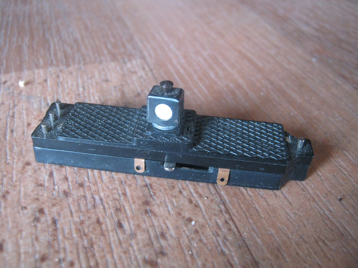 В принципе, производитель всё задумал правильно и просто - напряжение нужной полярности должно поступать на остряки и крестовину исключительно за счёт надёжного прижатия остряков к рельсам, никакой дополнительной коммутации не требуется. Стрелка имела крепления для установки штатного внешнего привода. В своей версии эти крепления удалил, а изначально стрелка выглядела так. И вот так выглядит штатный привод. Проблема в том, что штатный привод не обеспечивает должного усилия прижатия остряка и нет надёжного контакта. Коллеги решают вопрос установкой мощного моторного привода.