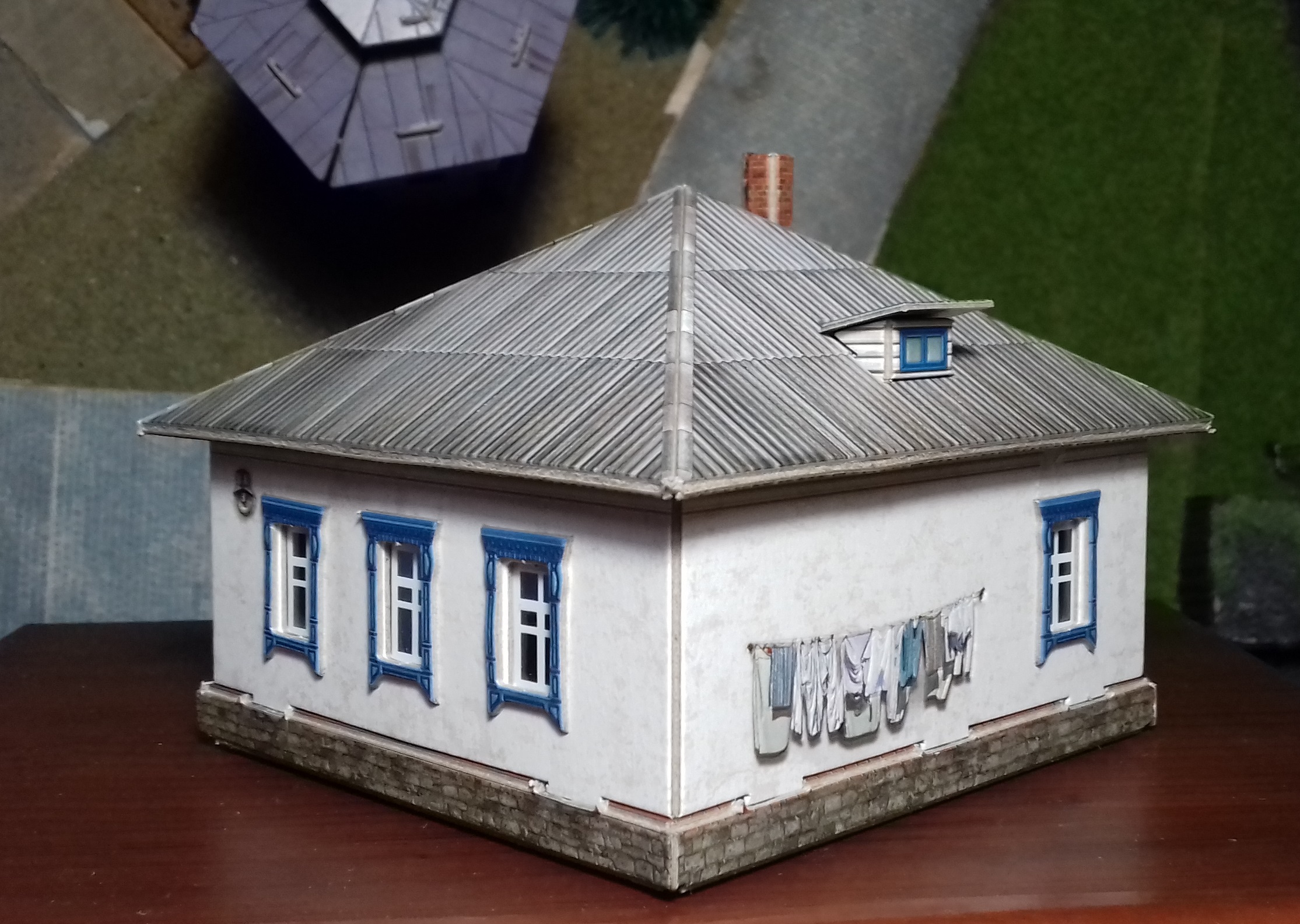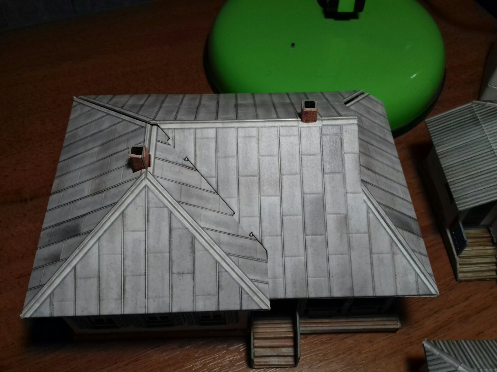 Затем нарезаем на сегменты и клеим на домик получившийся "шифер": Вот такие строящиеся дачки вышли: Шифер крупноват. Но тут та же ситуация, что и с углем в паровозных тендерах: если делать куски угля в масштабе, он будет выглядеть как черный песок. Шифер правильного размера есть на домиках "Умбум", и лично для меня он выглядит невзрачно.