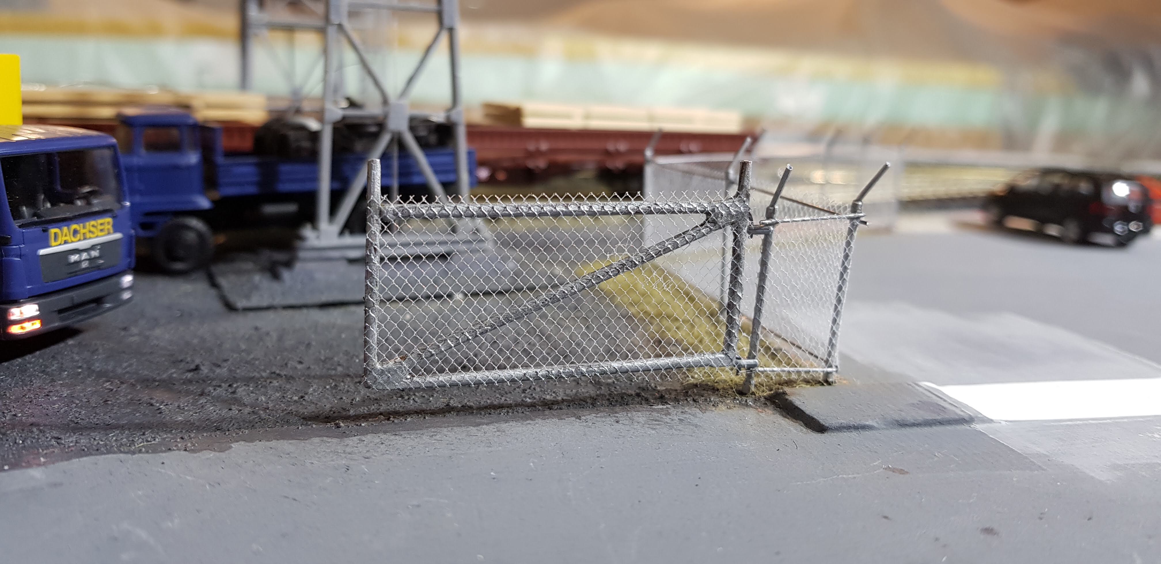 Ограда производства Walthers, стойки и прутики красил маркёром, в комплекте идёт кусок ткани для имитации сетки. Ткань не красил, на ограде выглядит как металлическая.