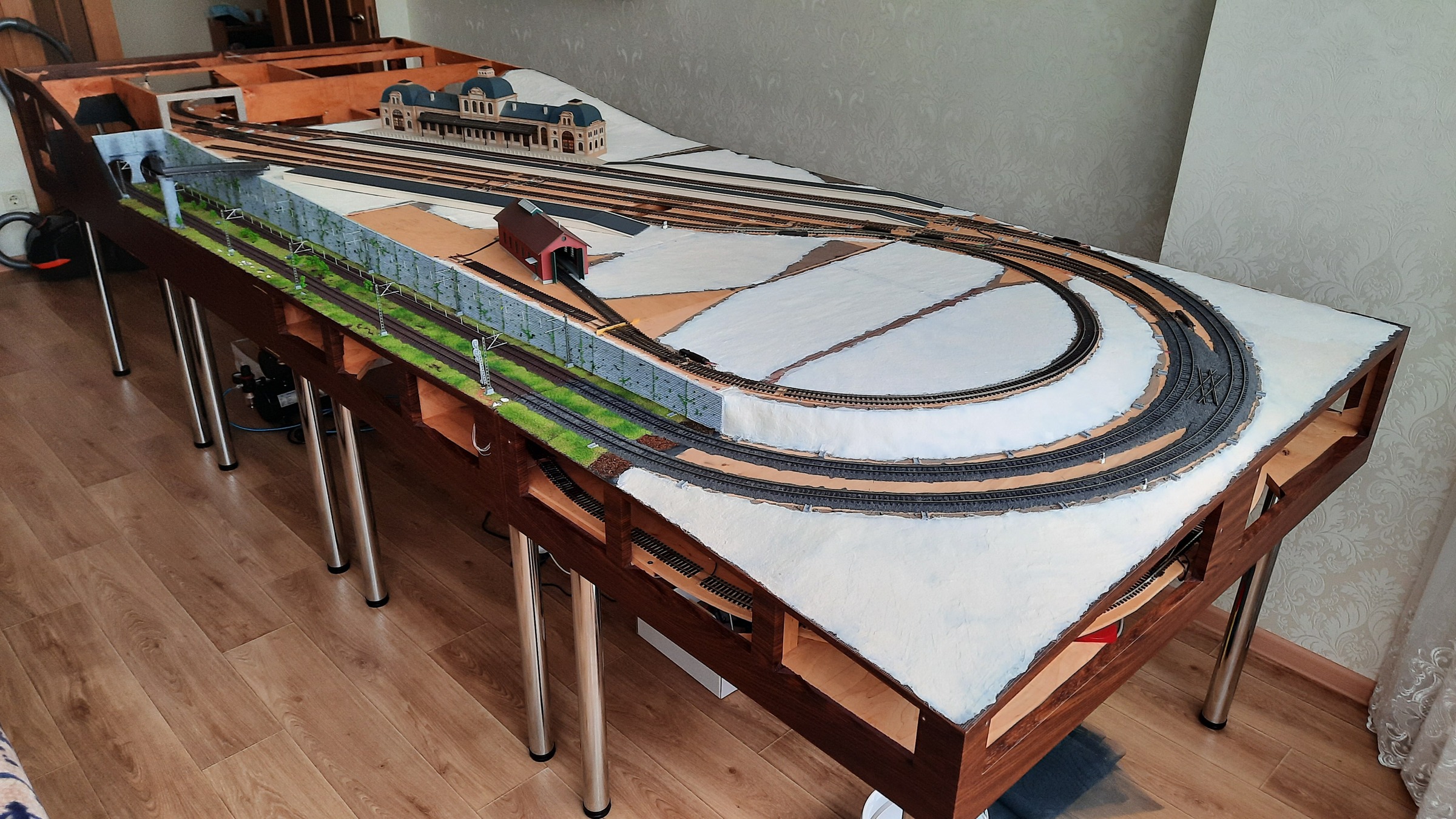 Там будет типа ремонт съездов)) Просто лично мне эти съезды не особо нужны, вот и решил обойтись без 4 стрелок на макете. Основная задумка макета - прибываюшие и уезжающие поезда, скрытые от глаз, и создающие эффект более широкого, чем макет, пространства.Stinky писав:Длина станции впечатляет.А между кривыми что за глухое пересечение лежит?