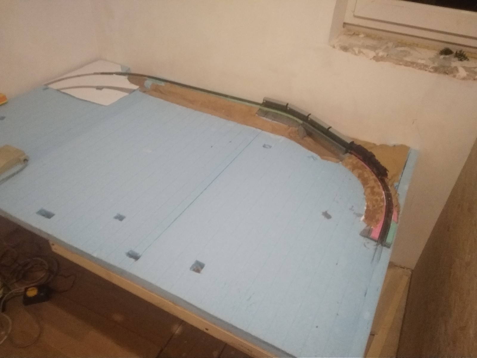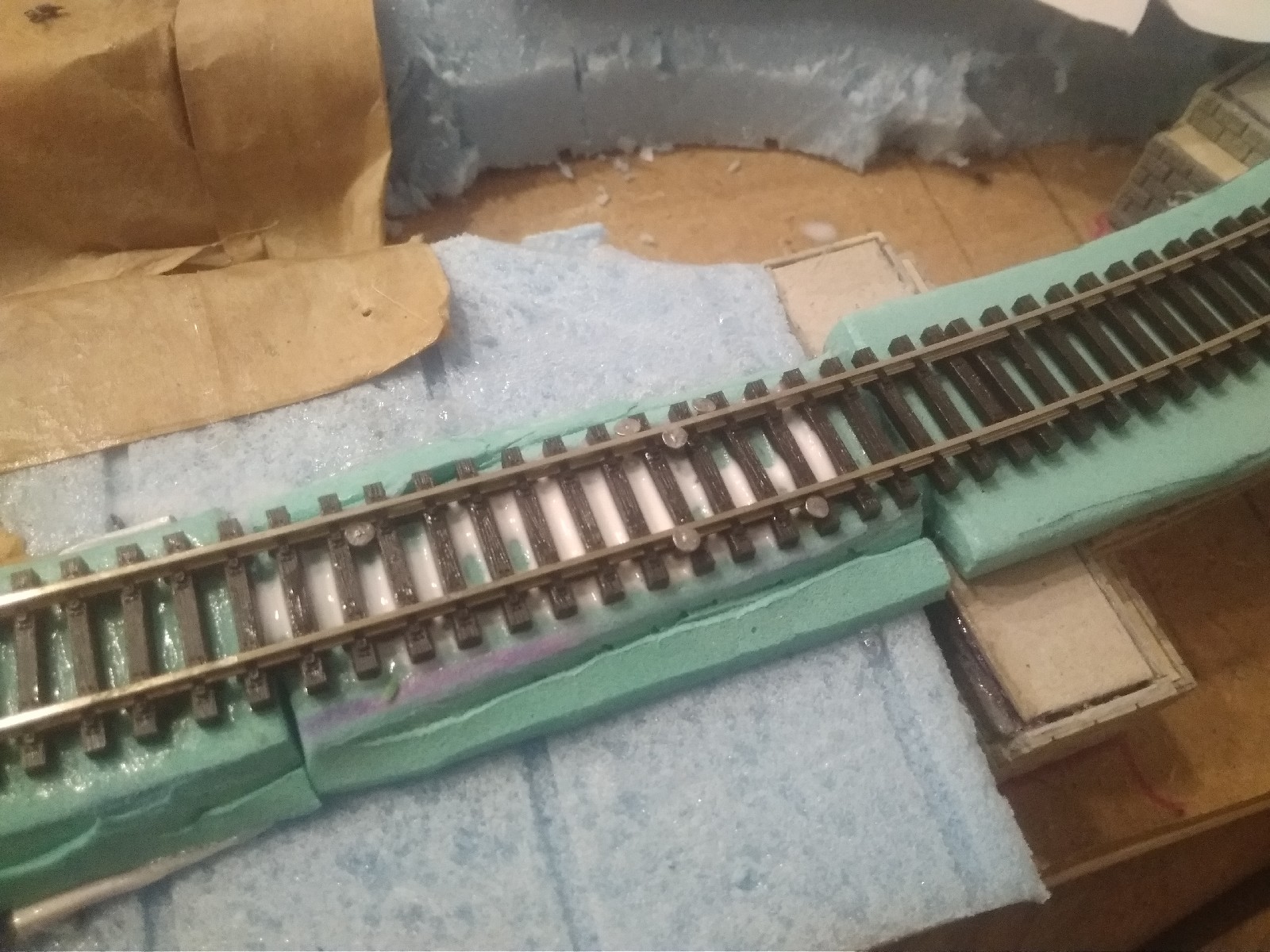Но основная мысль моего поста была несколько в другом. Я считаю, что сразу приклеивать шпальную решетку неправильно, особенно если использовать флексы. Крепление на гвоздиках как раз и дает возможность исправить ошибки. А уже после полноценной обкатки можно балластировать и клеить.