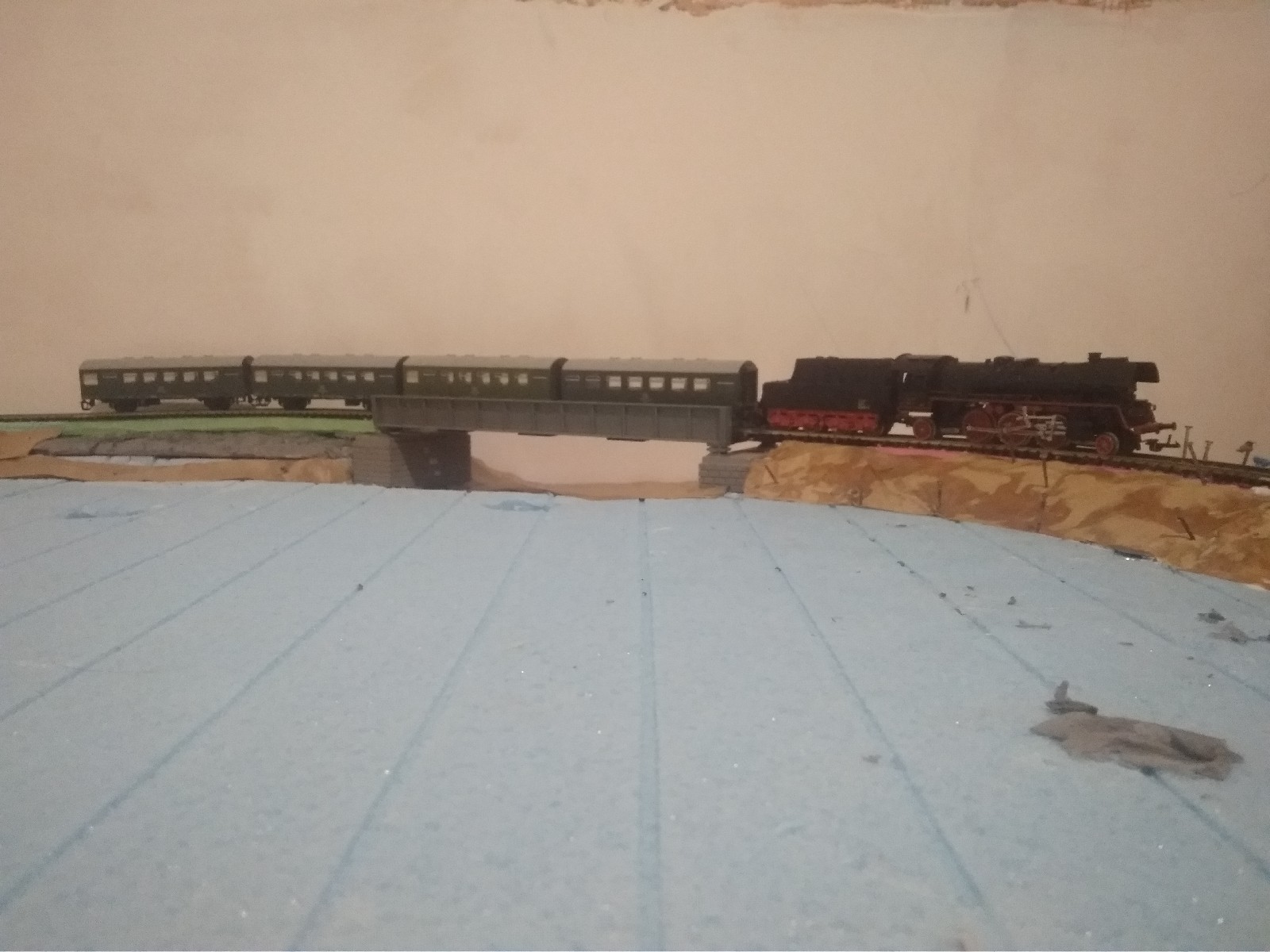 Ну що ж, перший сезон серіалу про мій макет добіг кінця. Завтра він переїде в гараж, де чекатиме наступного наскоку. Але це не означає що тема заглохне - думаю зайнятися будівлями, заготовкою матеріалів, а також теорією :) А зараз поставив його на місце де він має жити. Здоровий, падло :) Перегон на насипі над руслом ріки думаю буде круто виглядати, я, як любитель пофотографувати поїзди, думаю що це місце в реалі забаянили б вздовж та поперек. Пару фото додається, вибачте за якість, темно. Цього разу в головній ролі древній"цойкозавр" BR23.