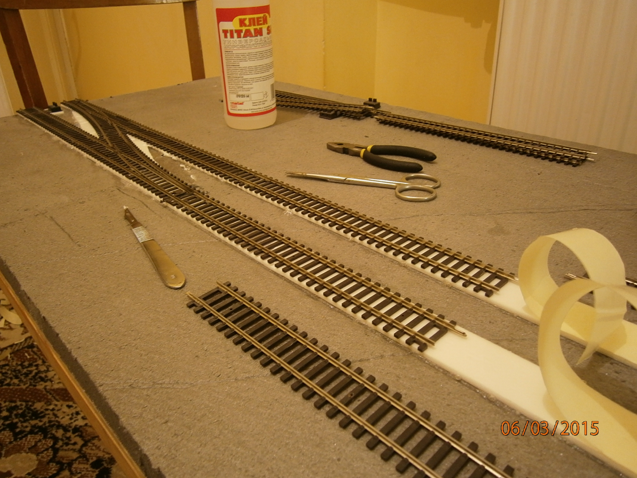 Одна сторона у неї липка як скотч, на неї кріплю рельси. Іншу приклеюю до основи клеем. Не 120 а 218