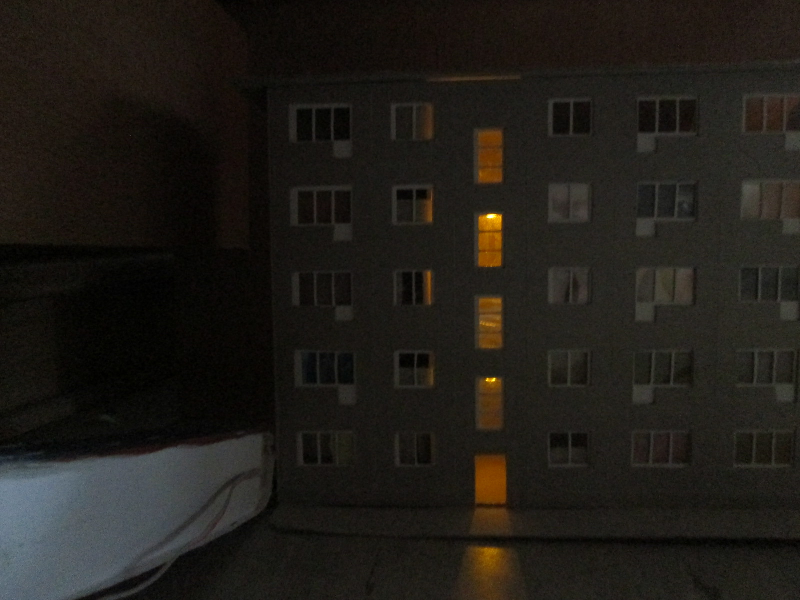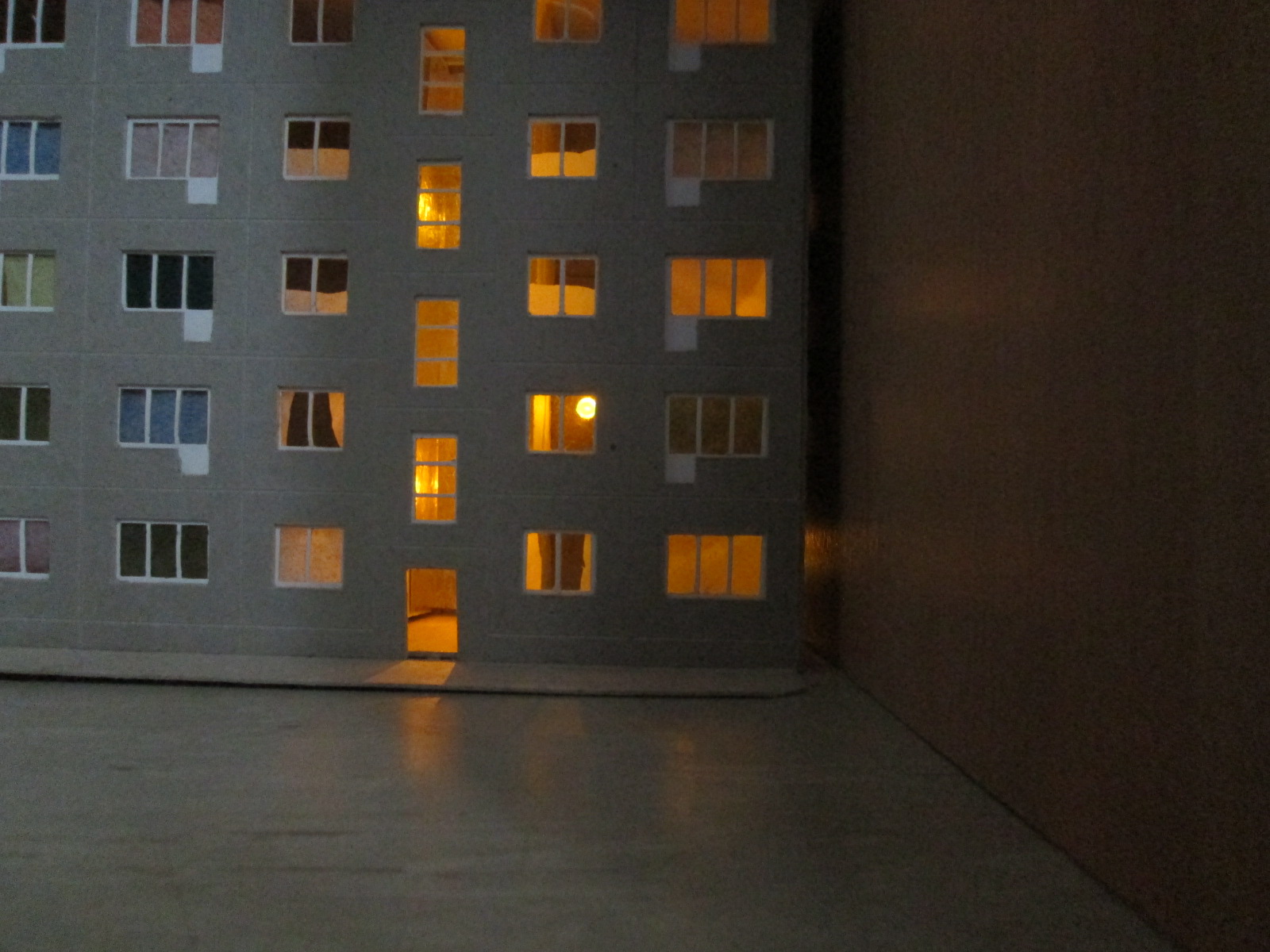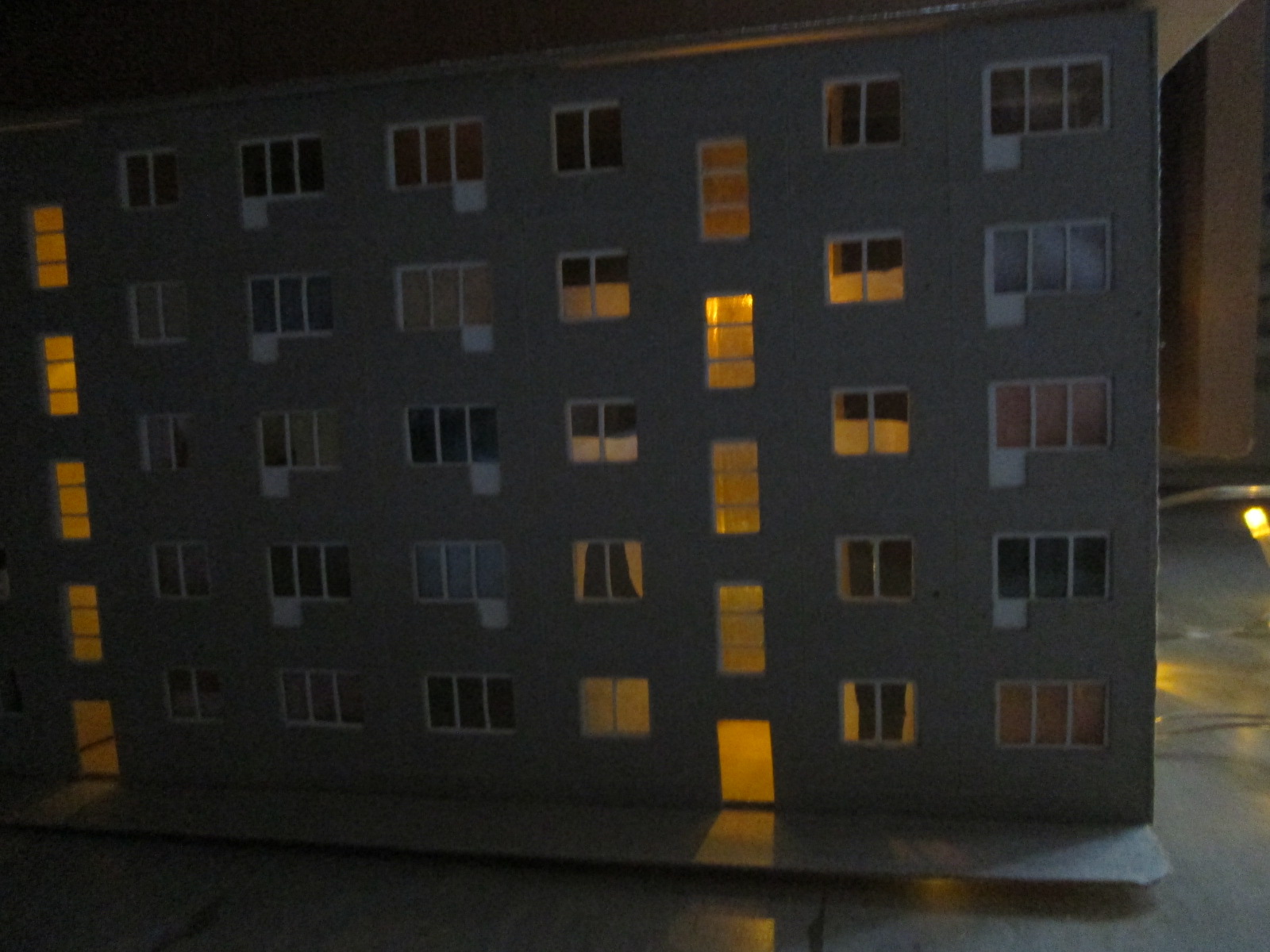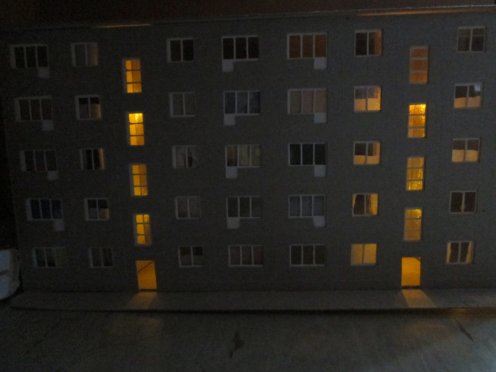 Виглядає натюрліх, але однотонно. Все ж таки в квартирах різні лампи, штори і від цього різні кольори у вікнах. Краще було б використати світлодіоди жовті, білі холодного світла і білі теплого світла. Для їх живлення буде достатньо 5-12 В постійного струму. Підійде якась стара зарядка для мобільного а то й взагалі батарейка, якої вистачить на довго. В різних квартирах різні діоди поставити і все одразу оживе. Якщо надумаєте, то зможу допомогти в азах електроніки.