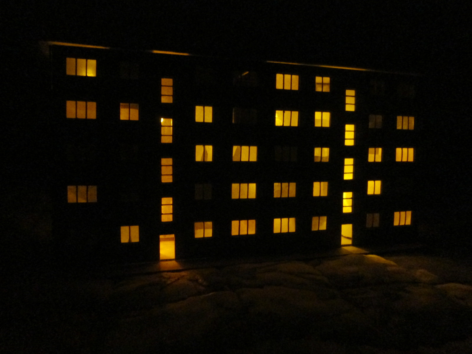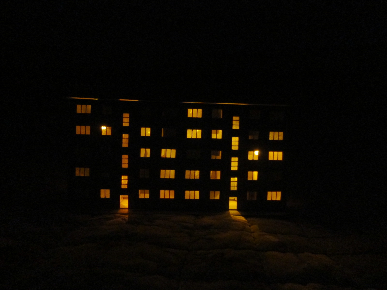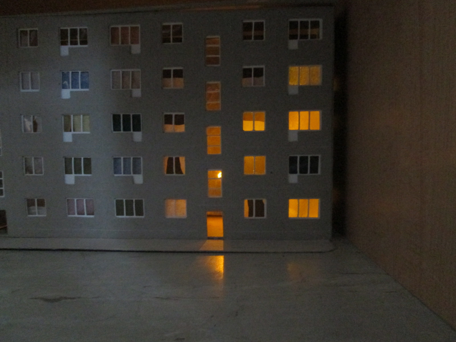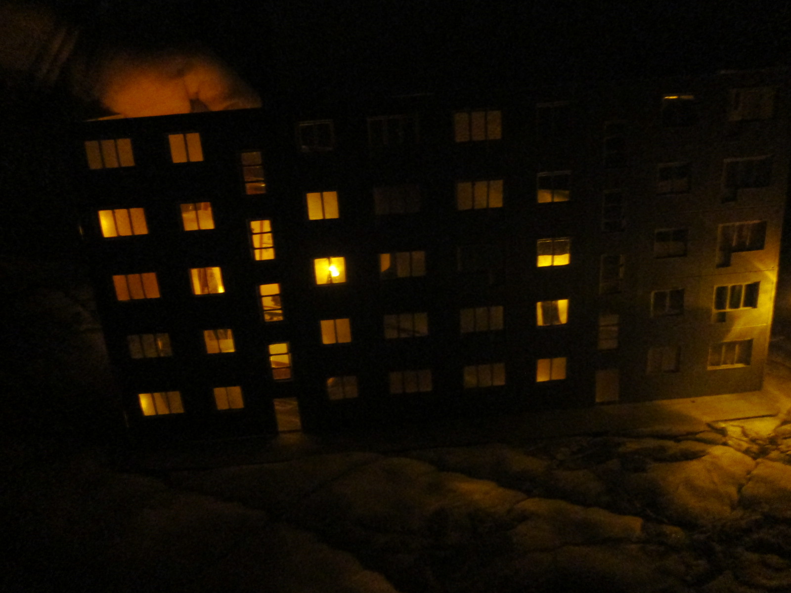 Виглядає натюрліх, але однотонно. Все ж таки в квартирах різні лампи, штори і від цього різні кольори у вікнах. Краще було б використати світлодіоди жовті, білі холодного світла і білі теплого світла. Для їх живлення буде достатньо 5-12 В постійного струму. Підійде якась стара зарядка для мобільного а то й взагалі батарейка, якої вистачить на довго. В різних квартирах різні діоди поставити і все одразу оживе. Якщо надумаєте, то зможу допомогти в азах електроніки.