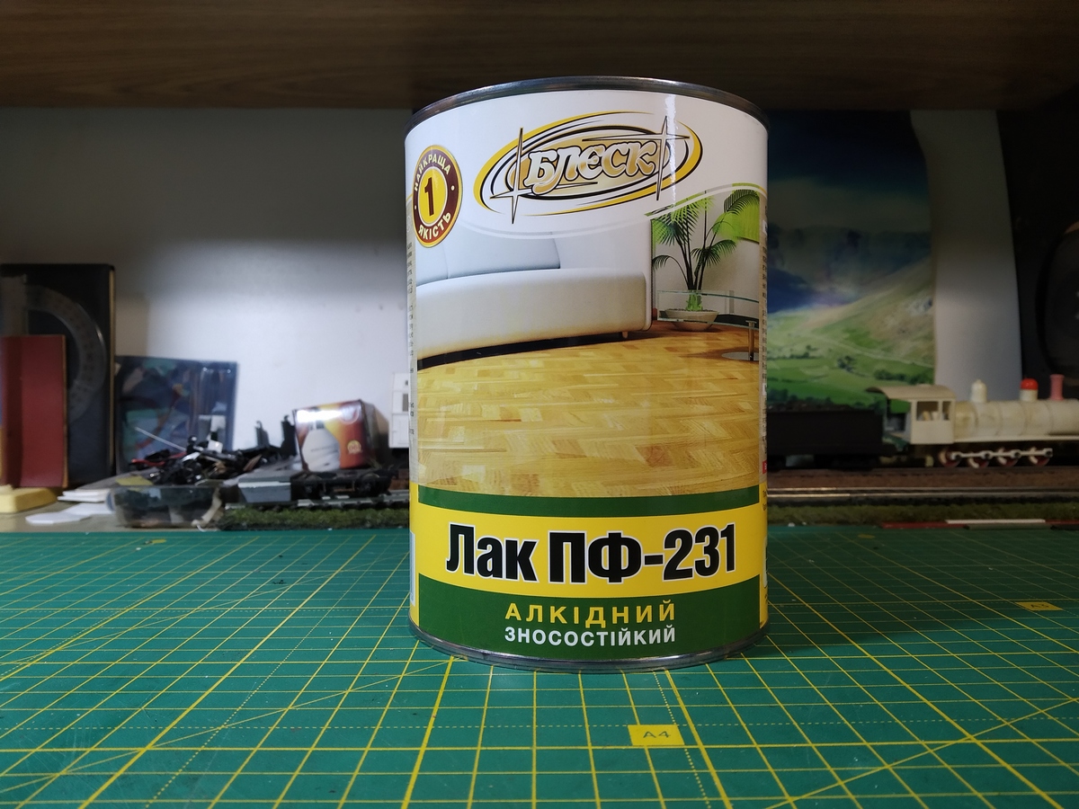 При выборе технологии руководствовался информацией с форума наших коллег. Там товарищ наливал паркетный лак слоем 1 мм и затем очень долго ждал. Результат у него был такой. В моём случае был приобретён паркетный лак стоимостью 79,02 грн. за 0,7 л. Растворяется уайт-спиритом. Т.е. присутствует запах керосина, что в моих реалиях, когда макет в отдельном помещении и этаже, абсолютно не имеет значения.