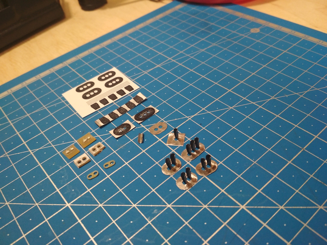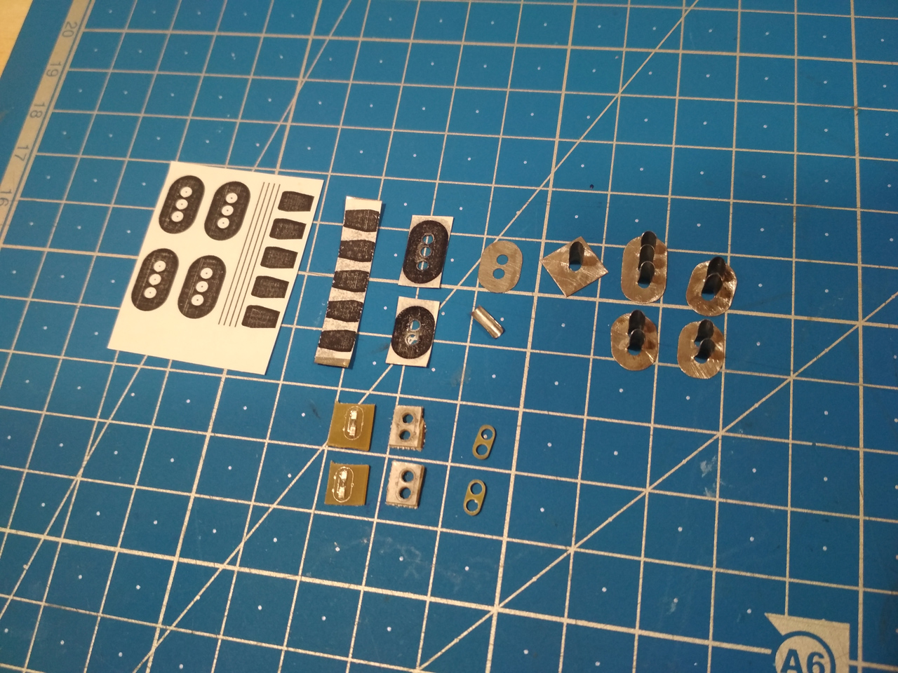 Вся еволюція процесу в одному фото. А тепер з коментарями. Для загального розуміння конструкції головки скрін з 3d. 1. На компі в графічному редакторі (для мене зручним є Microsoft Visio, в якому всі курсові, дипломи робились, а тепер ще й на роботі схеми малюються) робимо шаблон фонових щитів і козирьків до них. На зображенні представлені всі види, крім запрошувальних. Якось пропустив, завтра на роботі всеодно буду нову партію друкувати і дороблю їх. 2. Робимо шаблон під печатну плату задньої кришки головки. Розроблена під світлодіоди SMD 0603. Їх розмір 1,6х0,8 мм. Можна у всяких EasyEDA, Proteus і подібне, але мені швидше і простіше в тому самому Visio. Праворуч - задня кришка зі світлодіодами, по центру - шаблон плати під травлення, ліворуч - корпус головки з отворами 2 мм. 3. Видруковуємо шаблони щитків, приклеюємо на лист металу. Я використовую жерсть від кришок для консервування, оскільки латунь знайшов 0,2 мм і вона затовста. Жерсть, при майже масштабній товщині, забезпечує необхідну міцність і фактично валяється під ногами. Далі свердлимо отвори (тут потрібний свердлильний станок, бо вручну з такою точністю зробити отвори не дуже виходить), обрізаємо щитки і козирьки з запасом по контуру і обточуємо. Для всіх цих процедур використовую гравер і самопальний станок. При необхідності використовуємо надфілі.