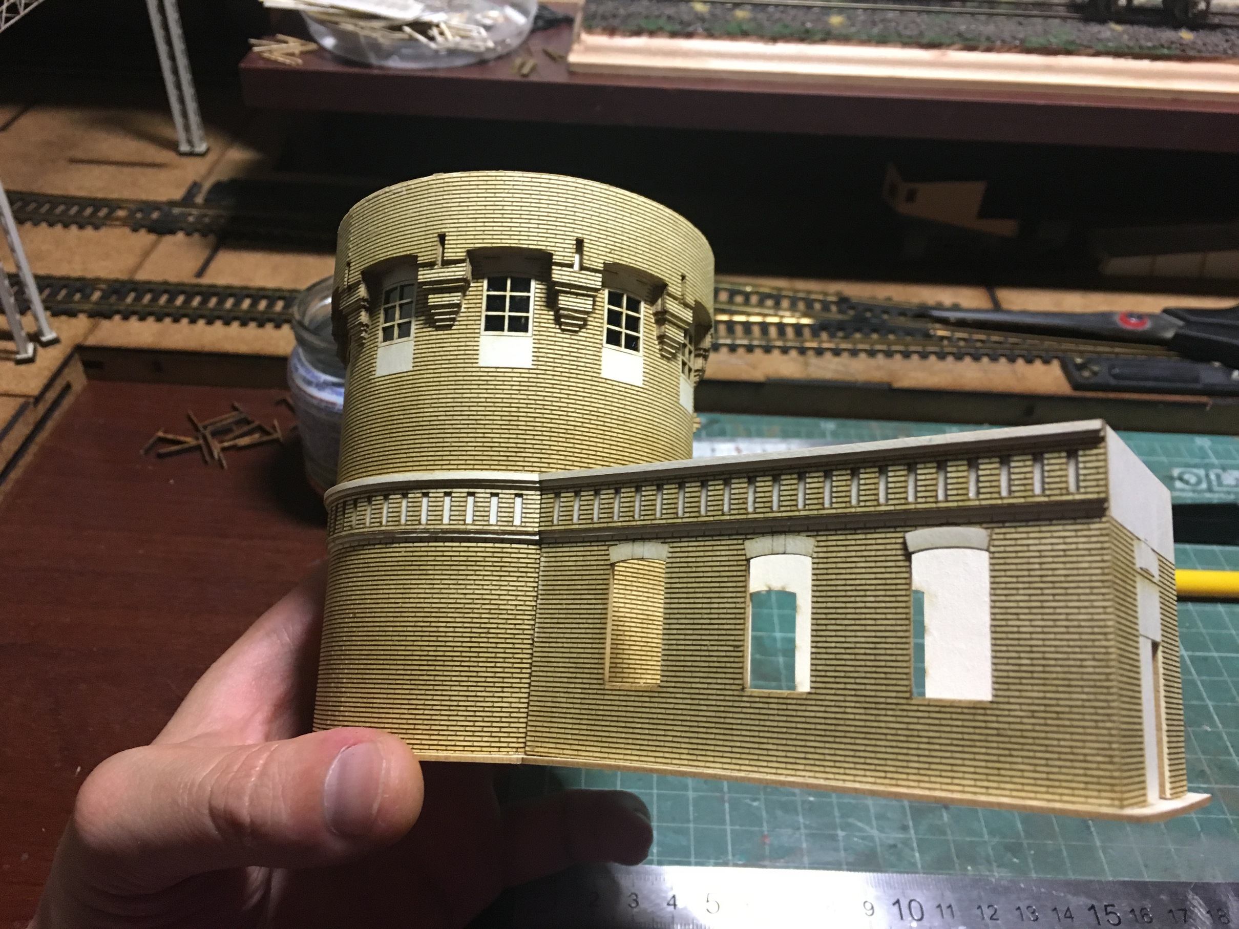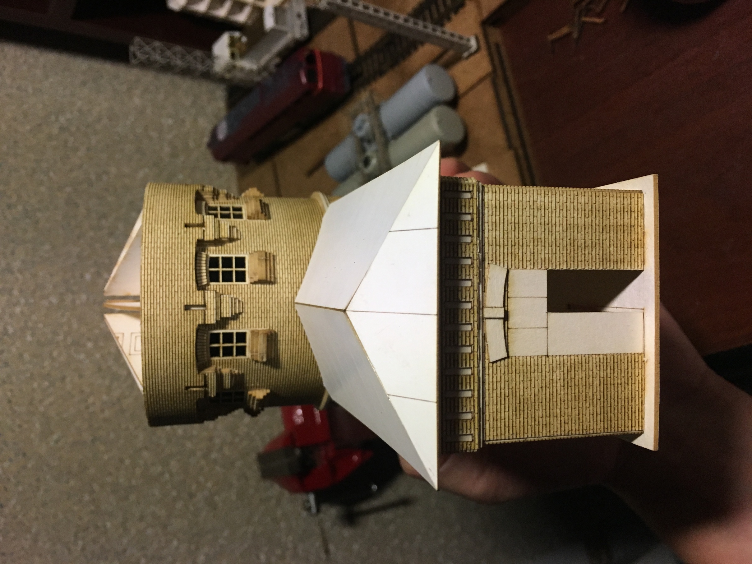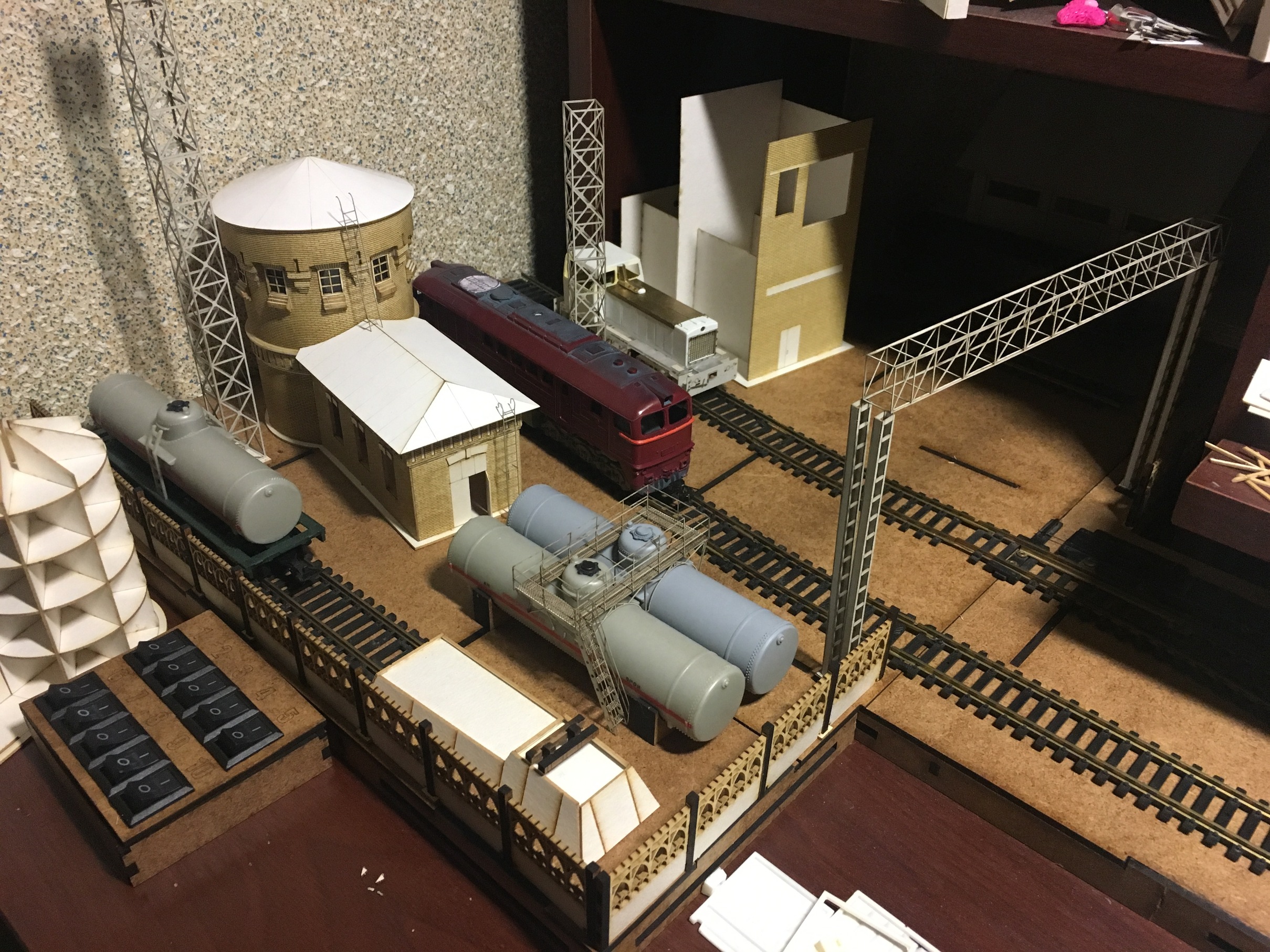 Начну с нефтекачки. Было интересно реализовать круглые формы, с рельефом по кругу. Цель достигнута на мой взгляд. В перспективе заведу свет и скорее всего, сделаю внутрянку в пристройке. Уж очень много окон в ней и все большие. Само здание, будет ещё доработано мелочевкой. Но именно набор резки, собран весь.