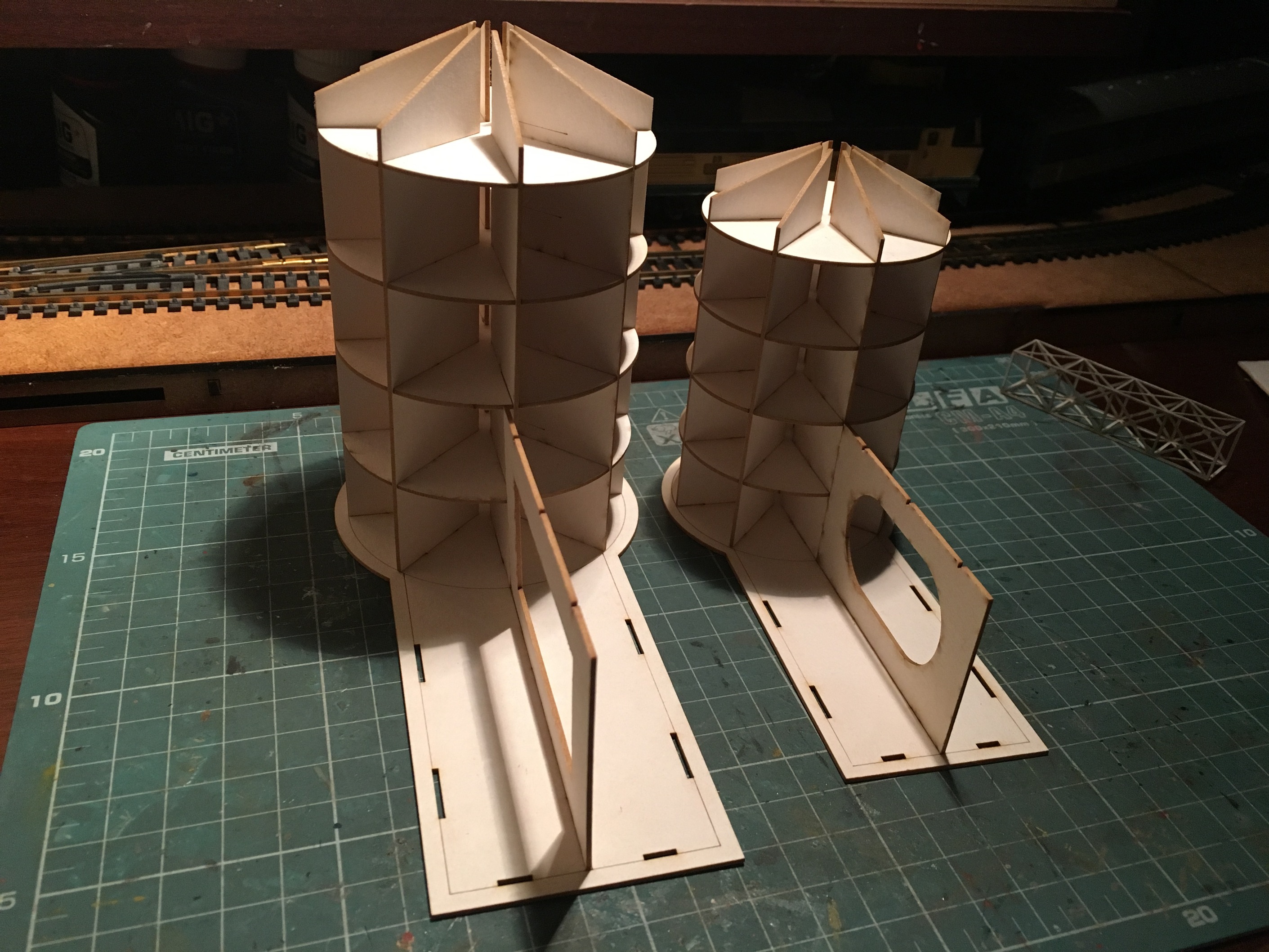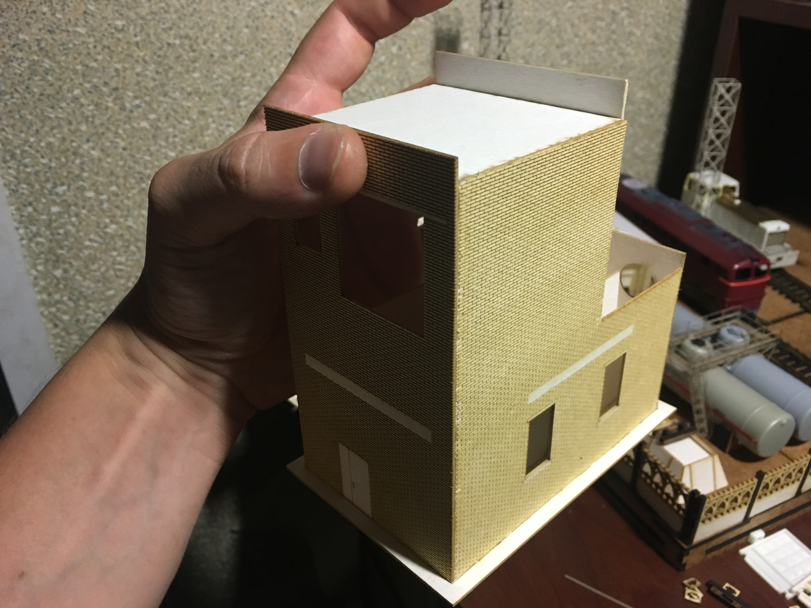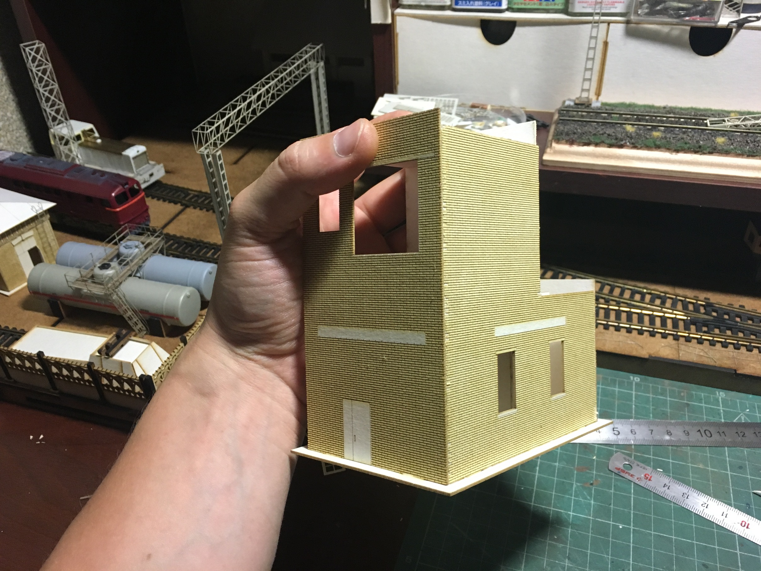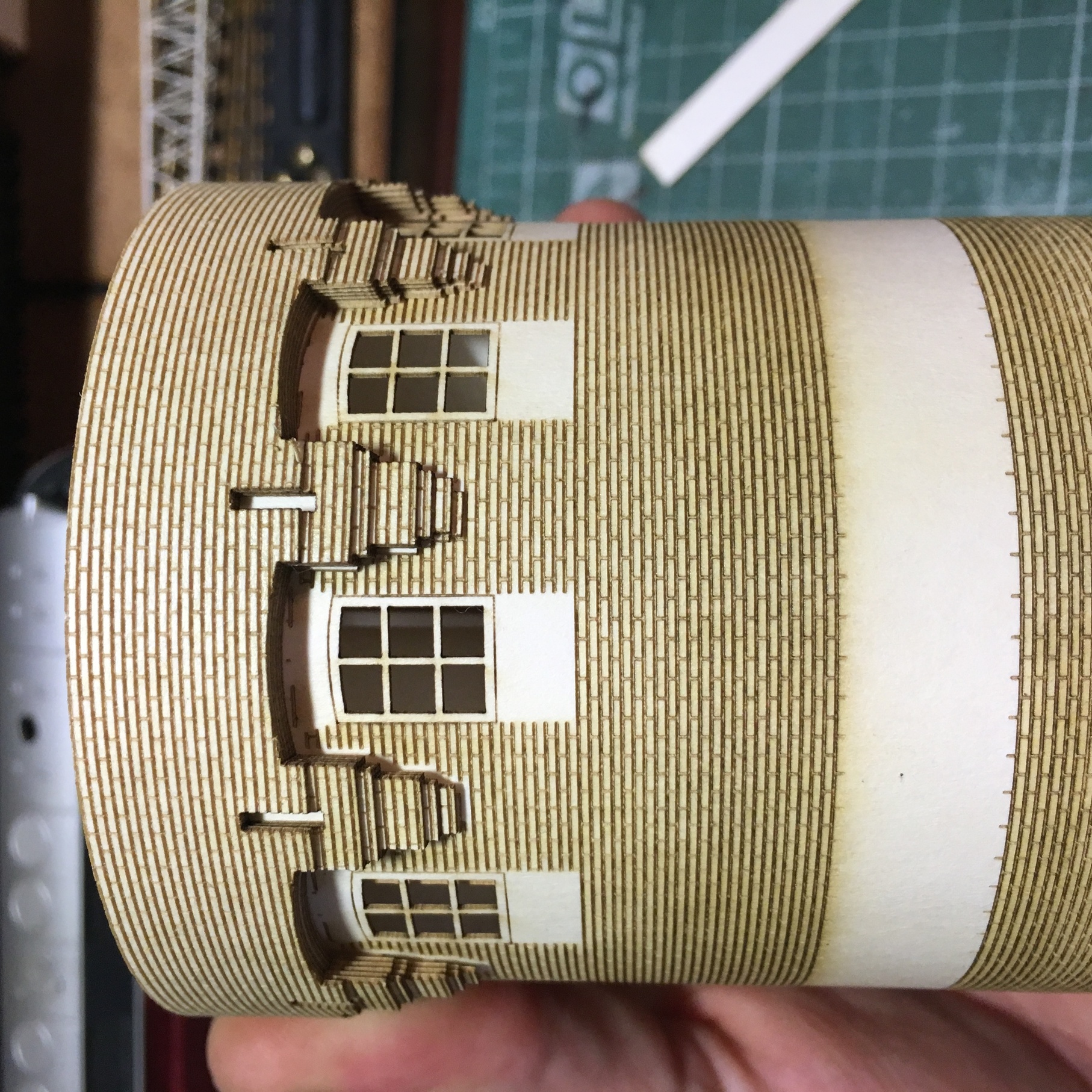 Начну с нефтекачки. Было интересно реализовать круглые формы, с рельефом по кругу. Цель достигнута на мой взгляд. В перспективе заведу свет и скорее всего, сделаю внутрянку в пристройке. Уж очень много окон в ней и все большие. Само здание, будет ещё доработано мелочевкой. Но именно набор резки, собран весь.