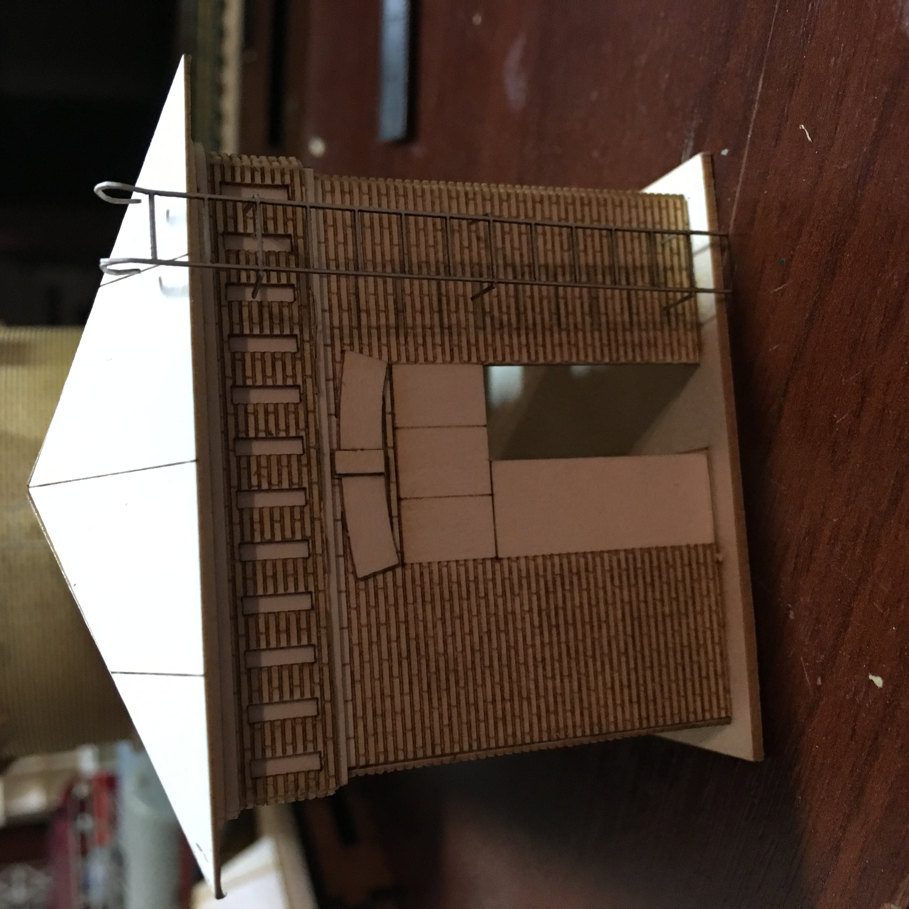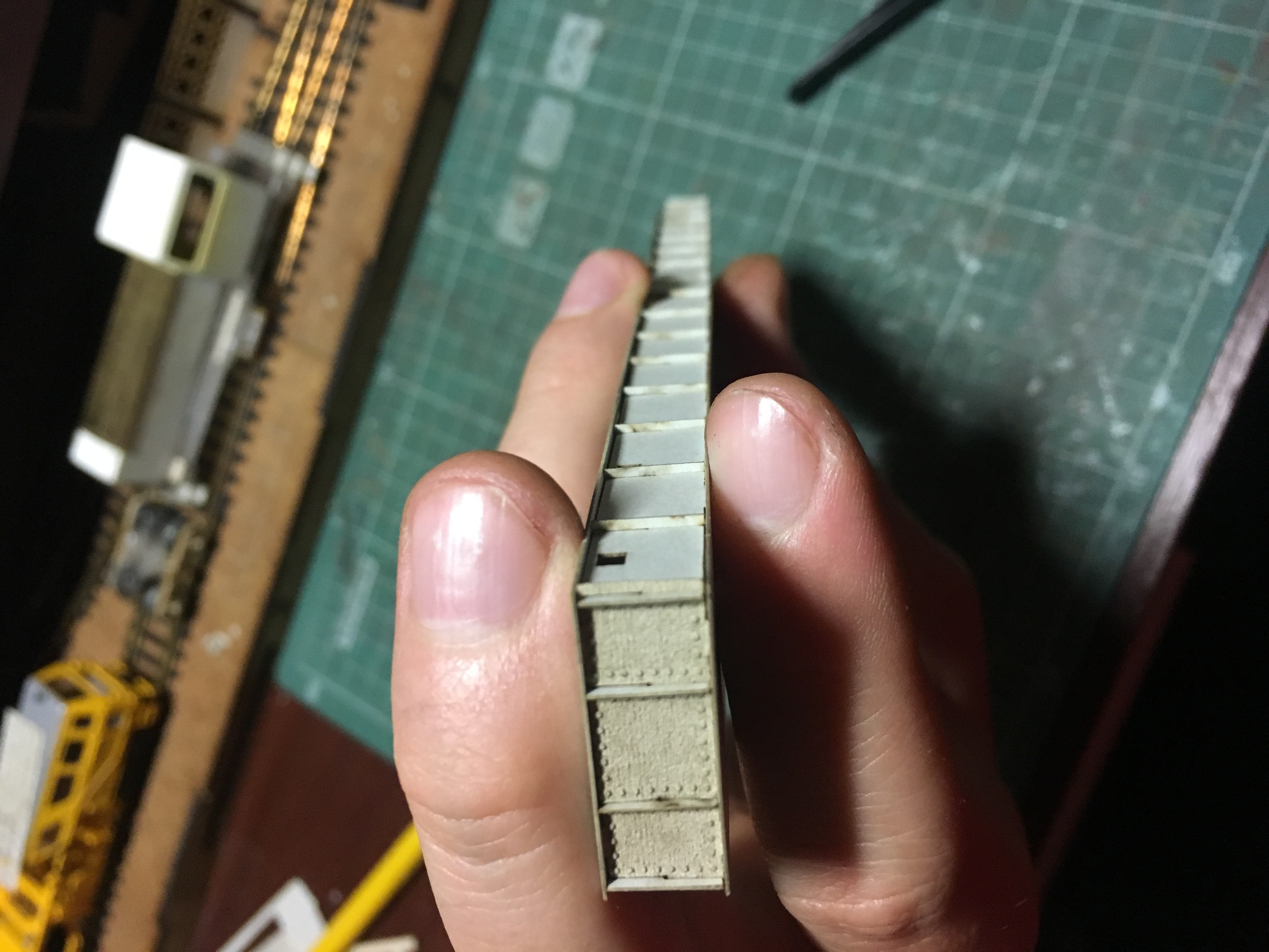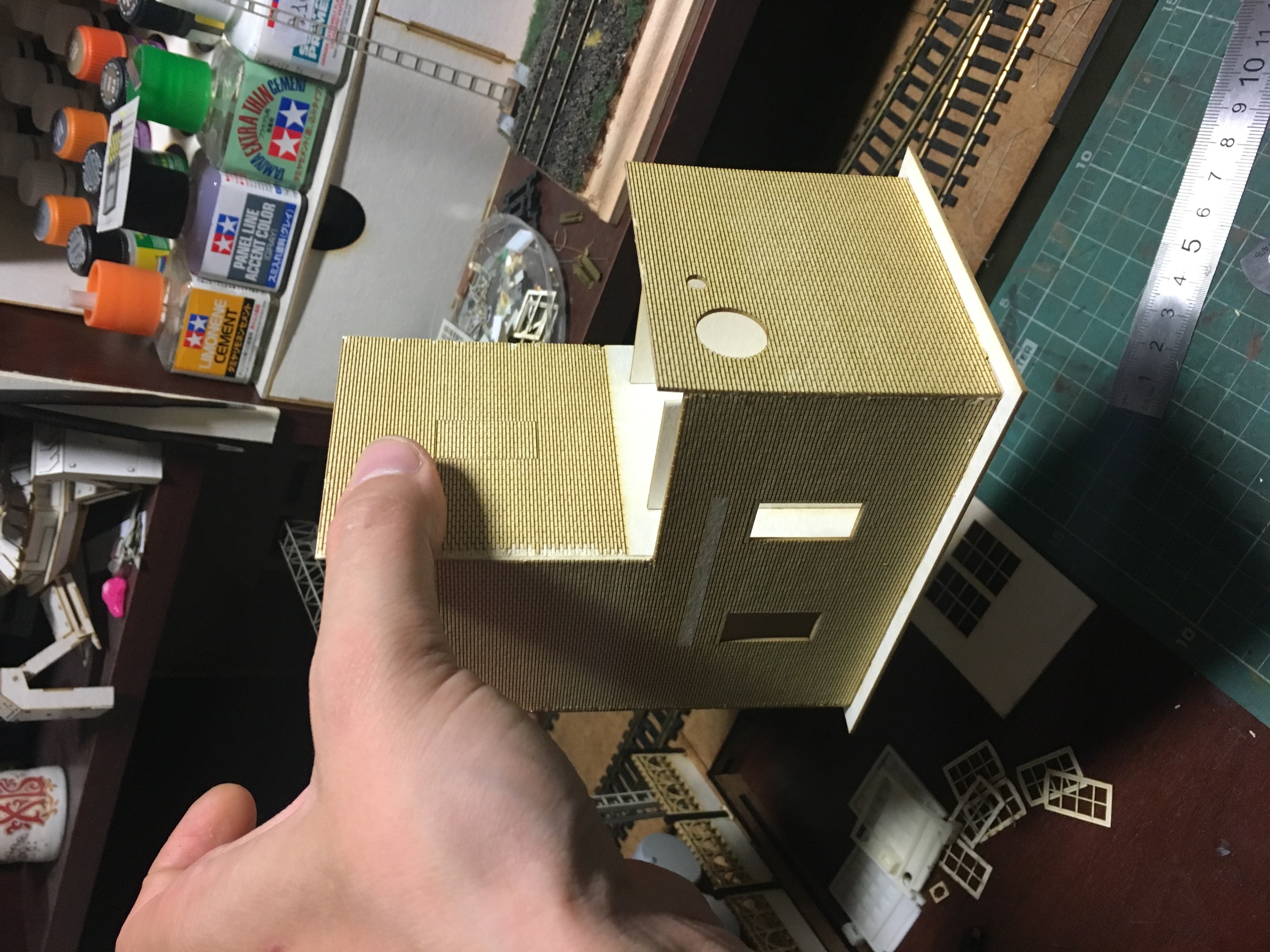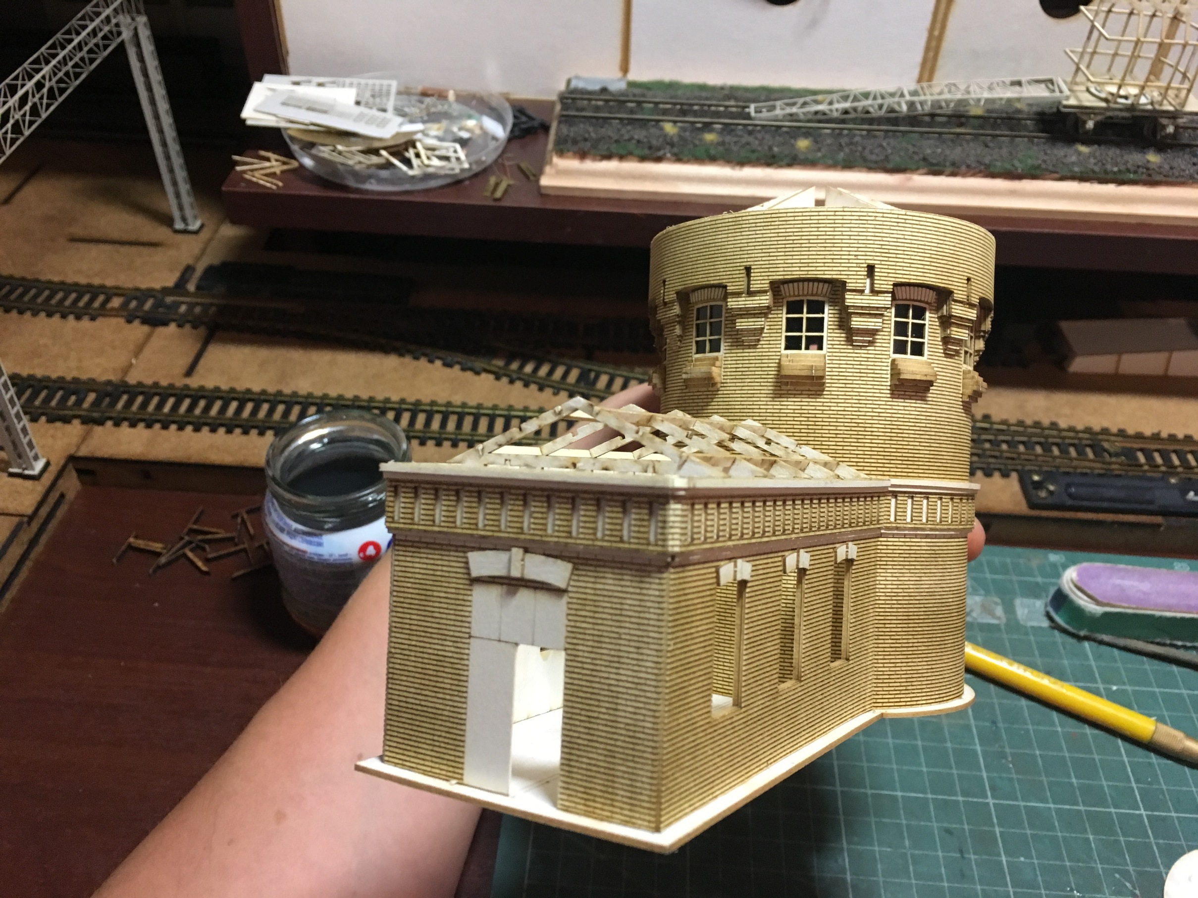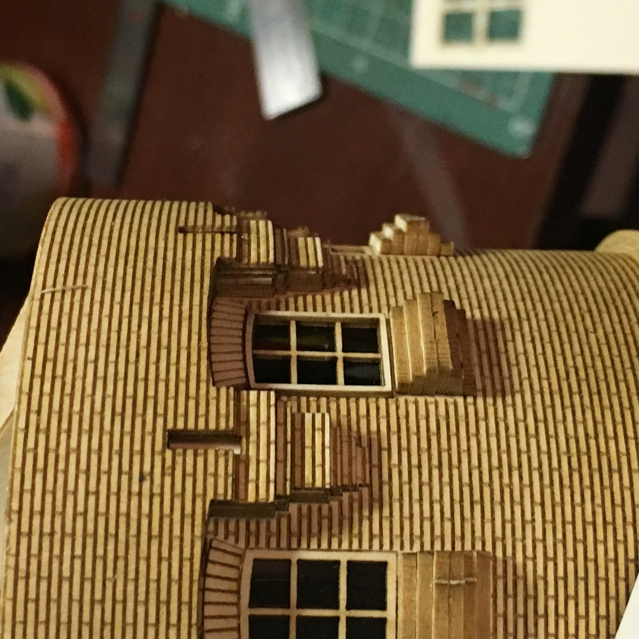 Здравствуйте. Продолжим потихоньку. Отвечая на вопрос по крышам. На всех постройках крыши готовы. На них где надо, нанесена разметка. В дальнейшем, уже по месту. Рубероид как обычно нождачкой мелкой. Жесть, скорее всего, латунью, с дальнейшей покраской и тонировкой. Черепицу в 87 не приходилось пока делать. Но я делал ребёнку домик по мультфильму Робокары. Там меня результат удовлетворил. Когда придёт необходимость, попробую.