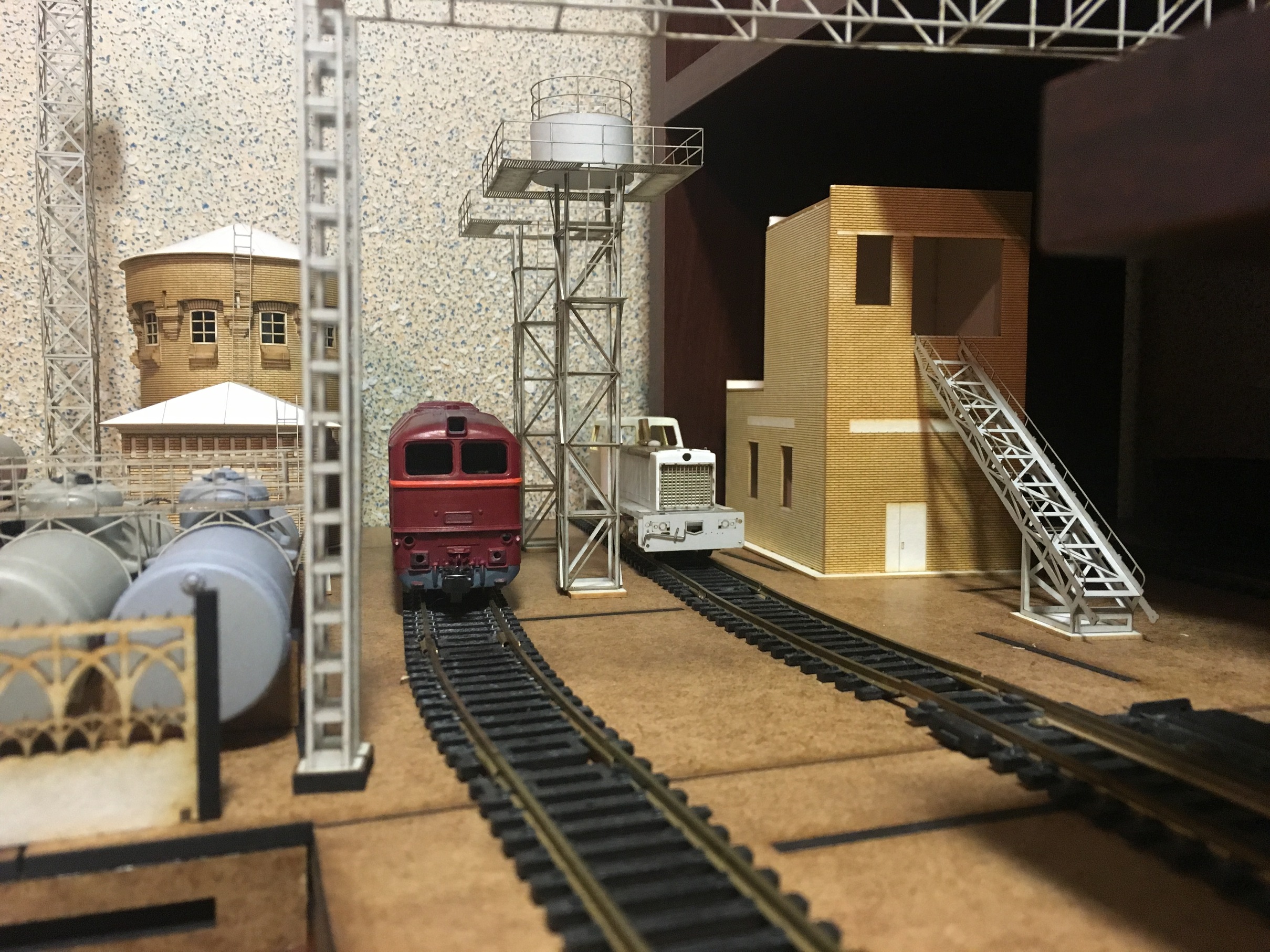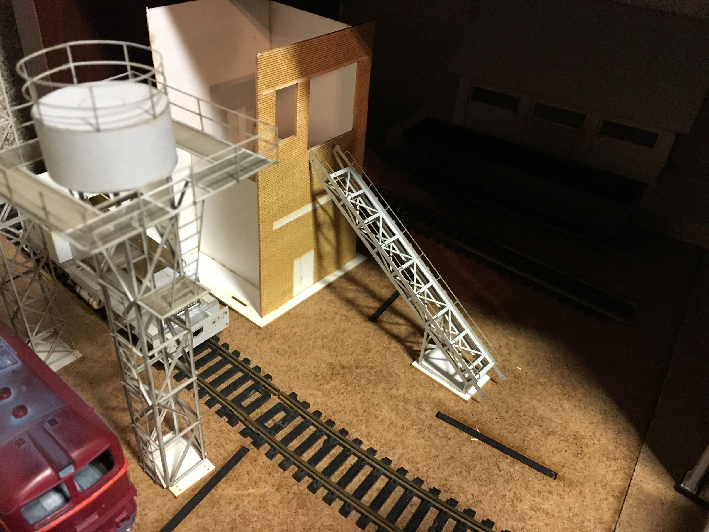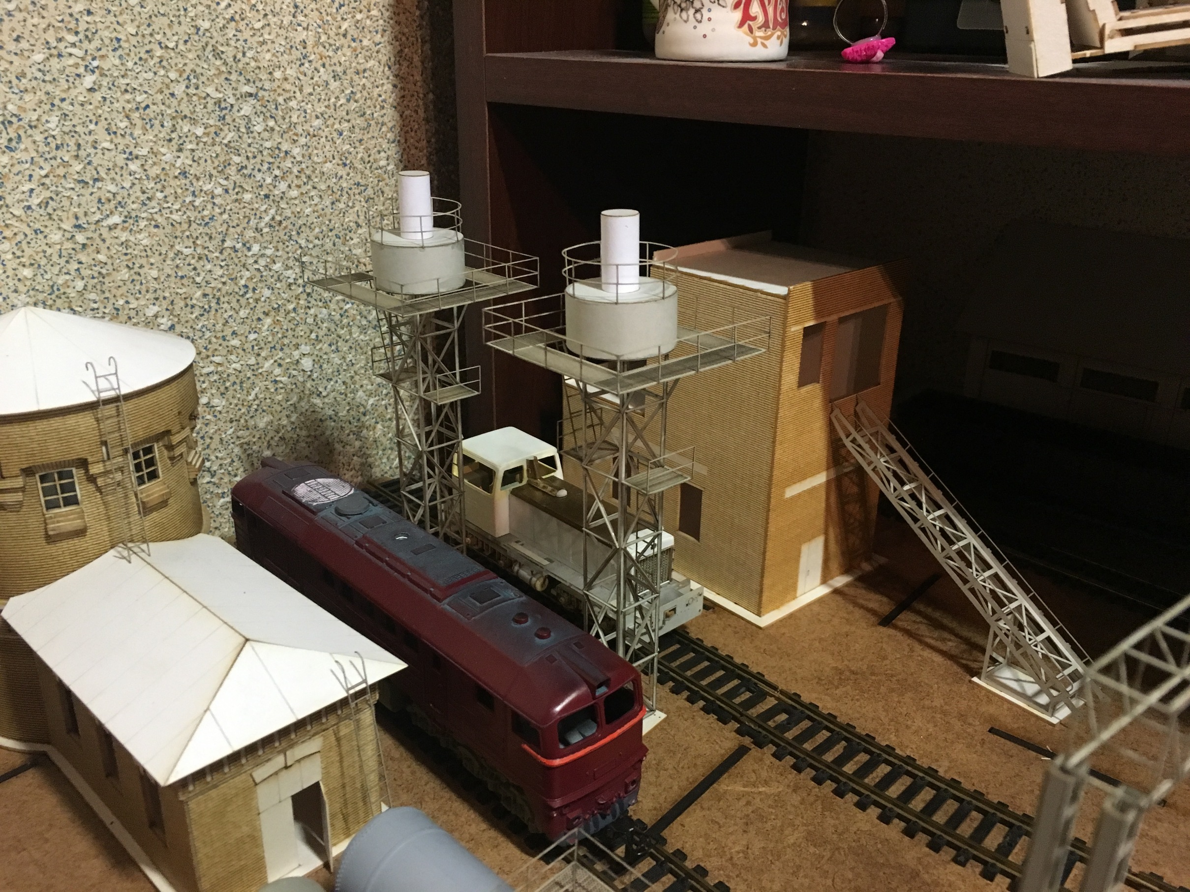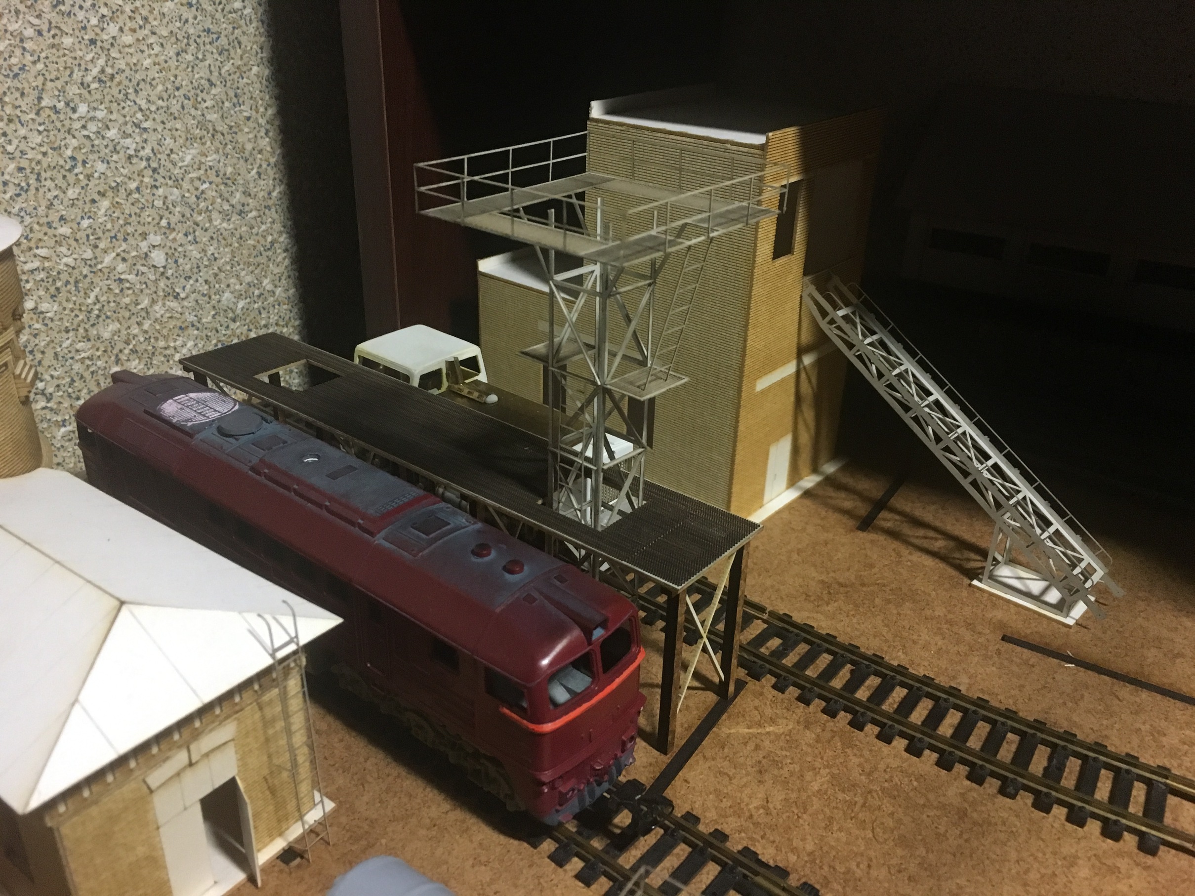 Теперь продолжу по макету. Следующим строением, сделал ПТОЛ, с бункерами раздачи песка. Понятно, что нет ещё горы мелочей, как и на предыдущих постройках. Как уже упоминалось, задача насытить макет и уложить по итога рельсовый материал. А потом уже поочерёдно всёдопиливать и красить.