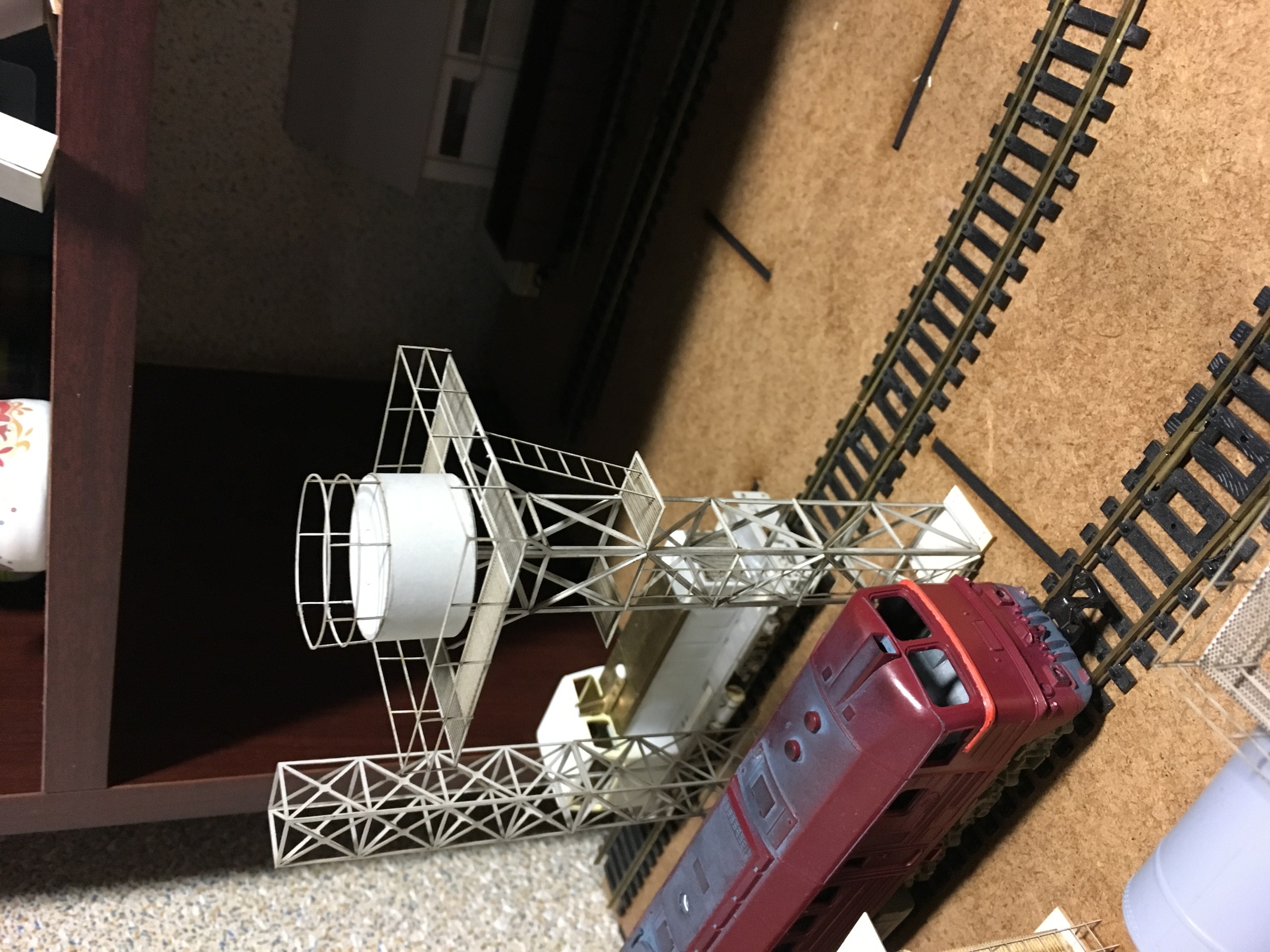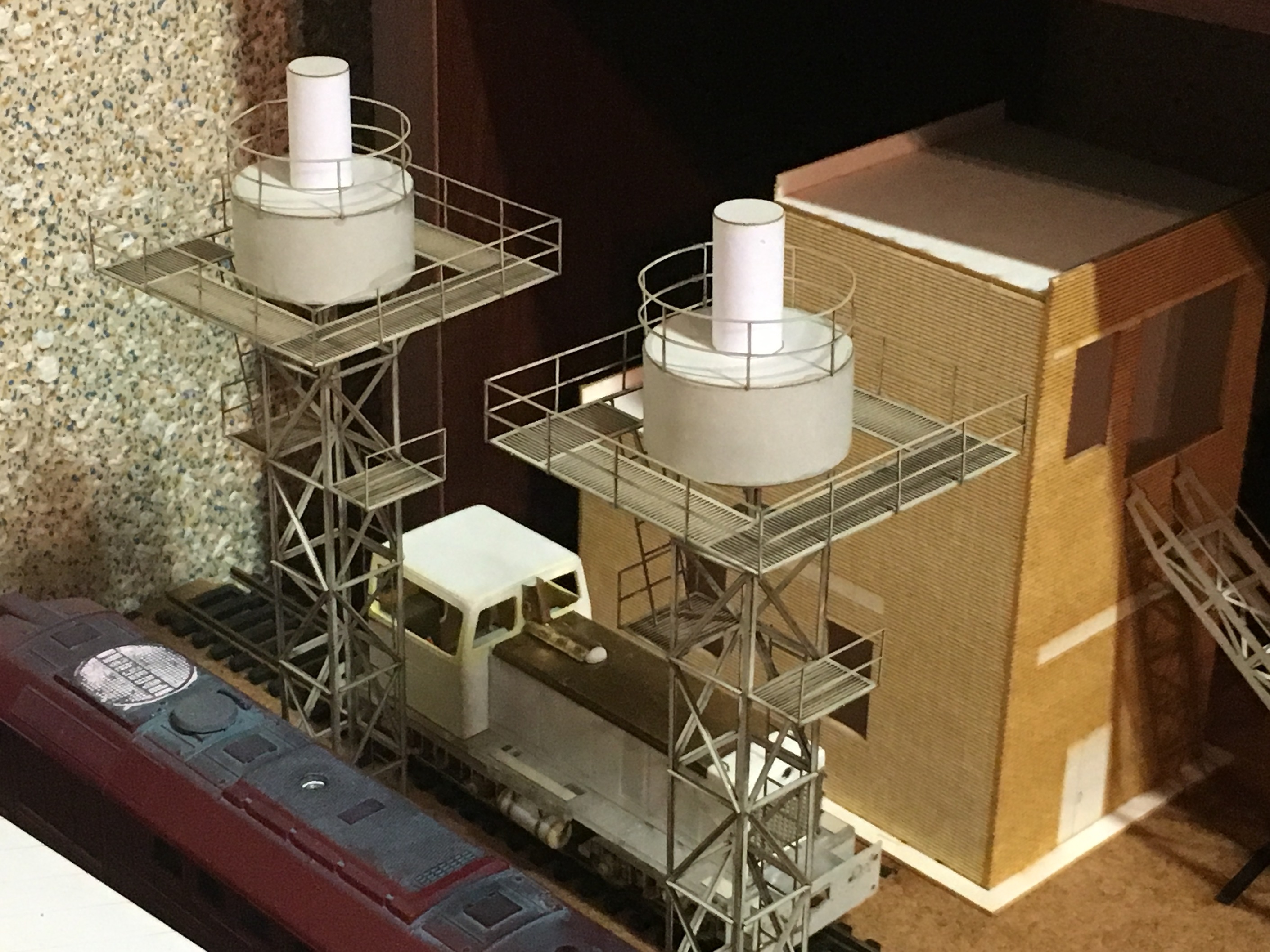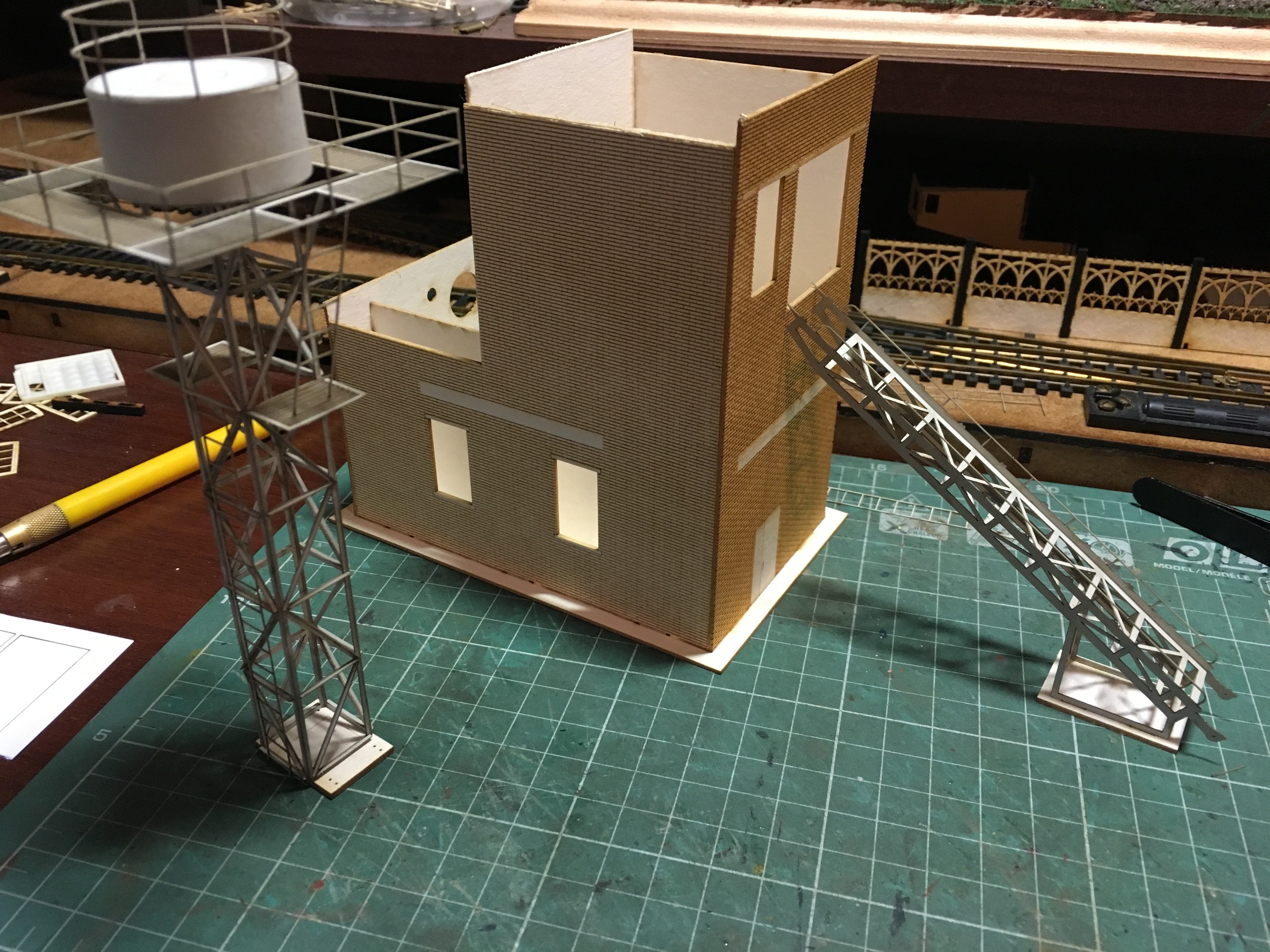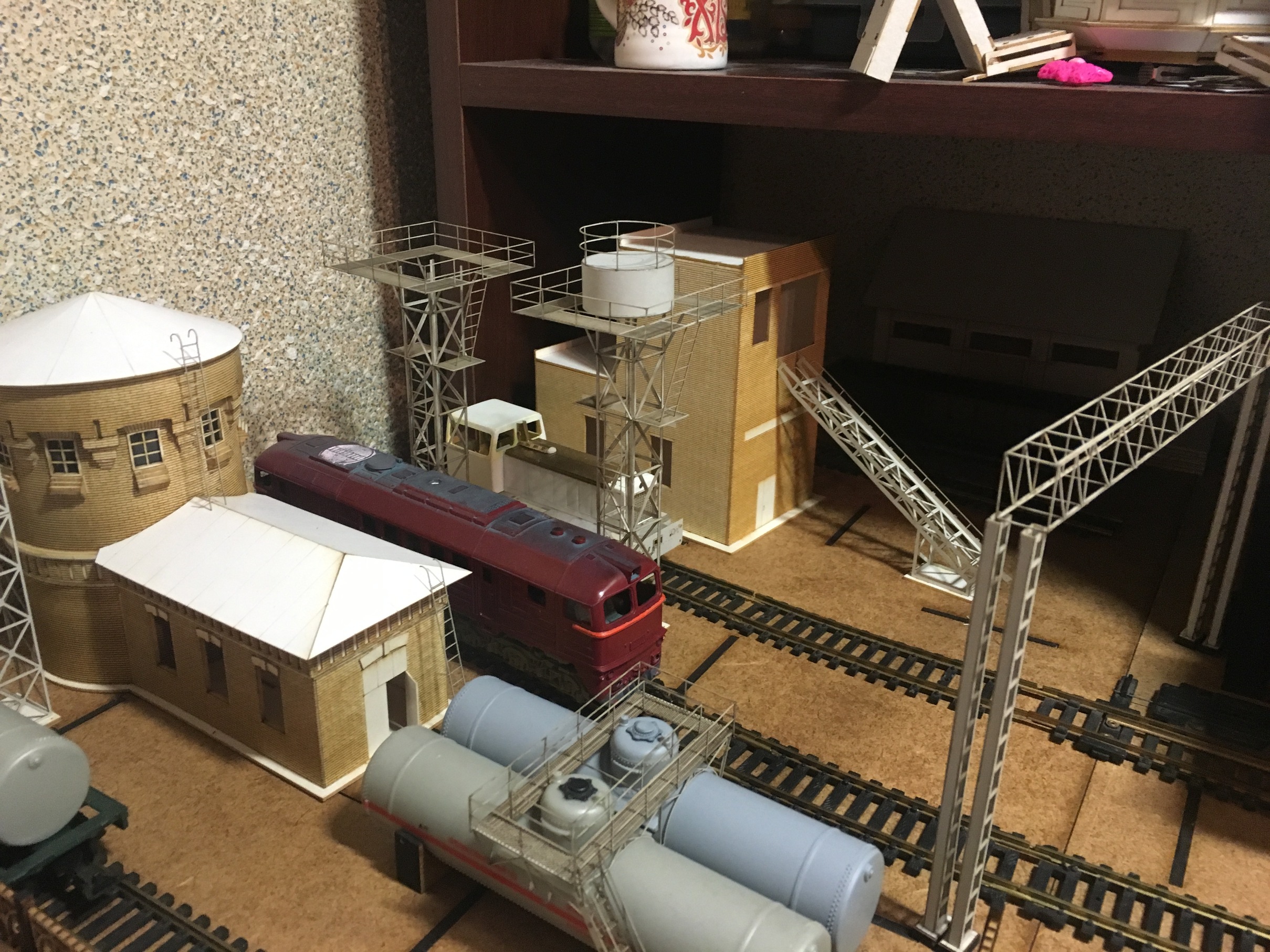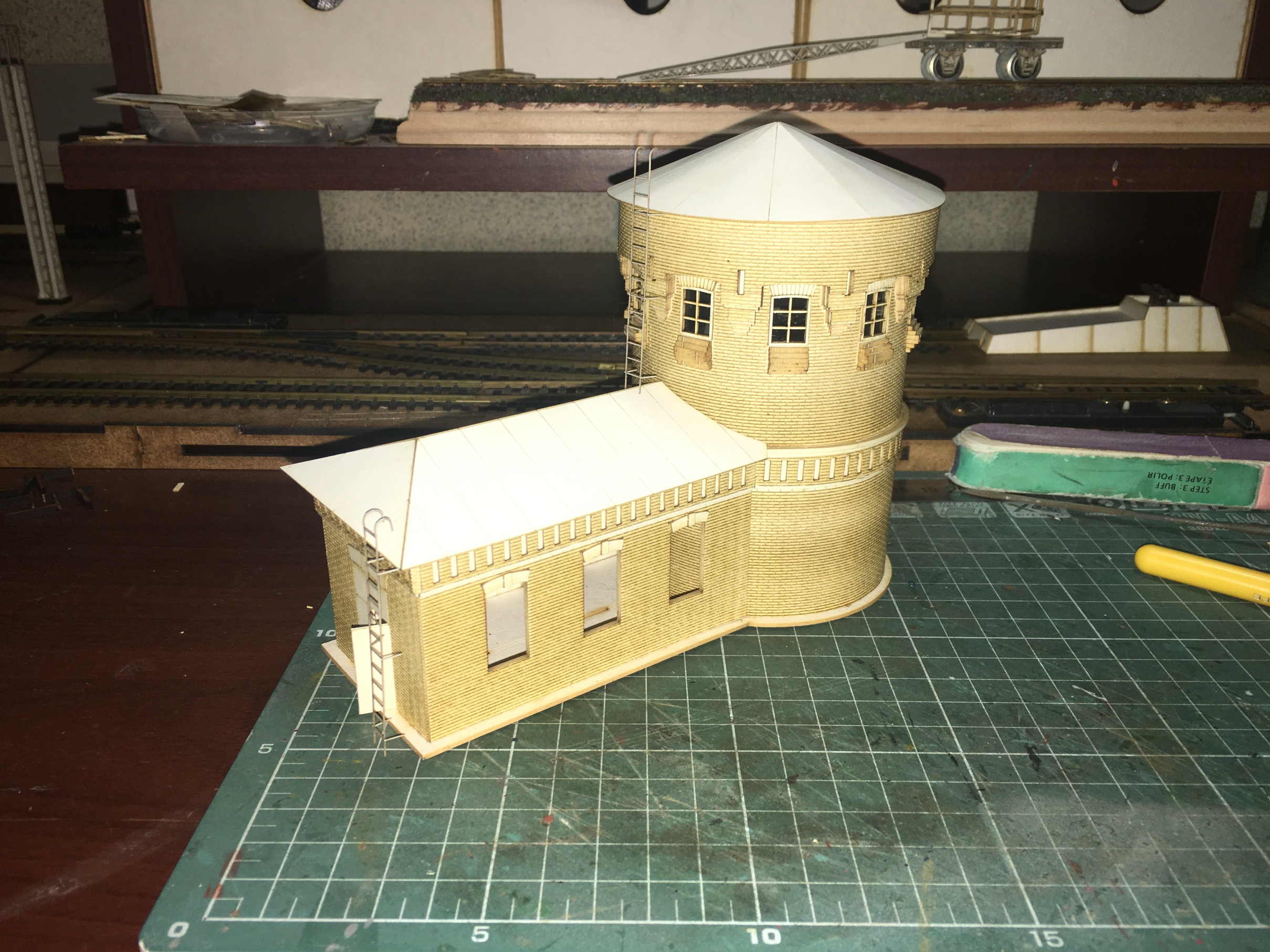Теперь продолжу по макету. Следующим строением, сделал ПТОЛ, с бункерами раздачи песка. Понятно, что нет ещё горы мелочей, как и на предыдущих постройках. Как уже упоминалось, задача насытить макет и уложить по итога рельсовый материал. А потом уже поочерёдно всёдопиливать и красить.