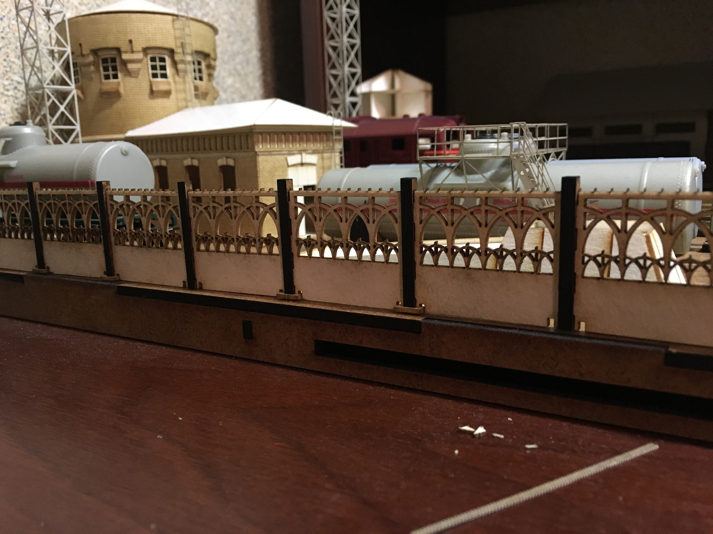 Затем, чтоб отвлечься, занялся ограждением. Мне досталось на пробу, несколько бракованных отливок забора. Возможно, позже сделаю формы и отолью из гипса. Но это позже, а пока, подсмотрев забор у нефтекачки на оригинале, нарисовал и нарезал. Результатом доволен. Будет ещё низкое ограждение. Оно тоже есть рядом с оригиналом. На размещение по макету, не обращайте внимание. Расставил, чтоб просто посмотреть.