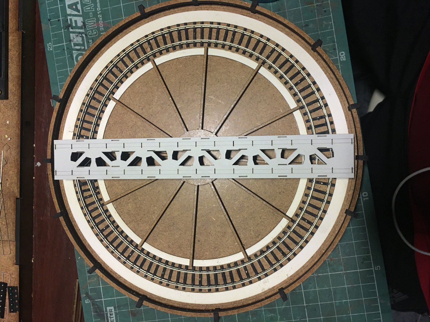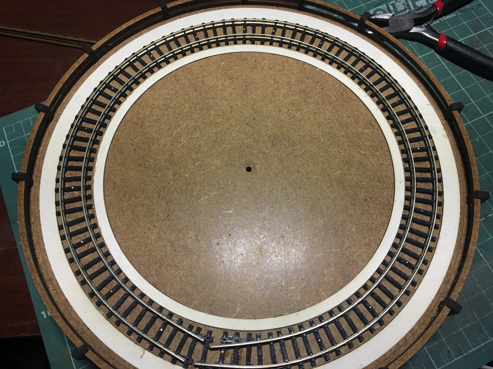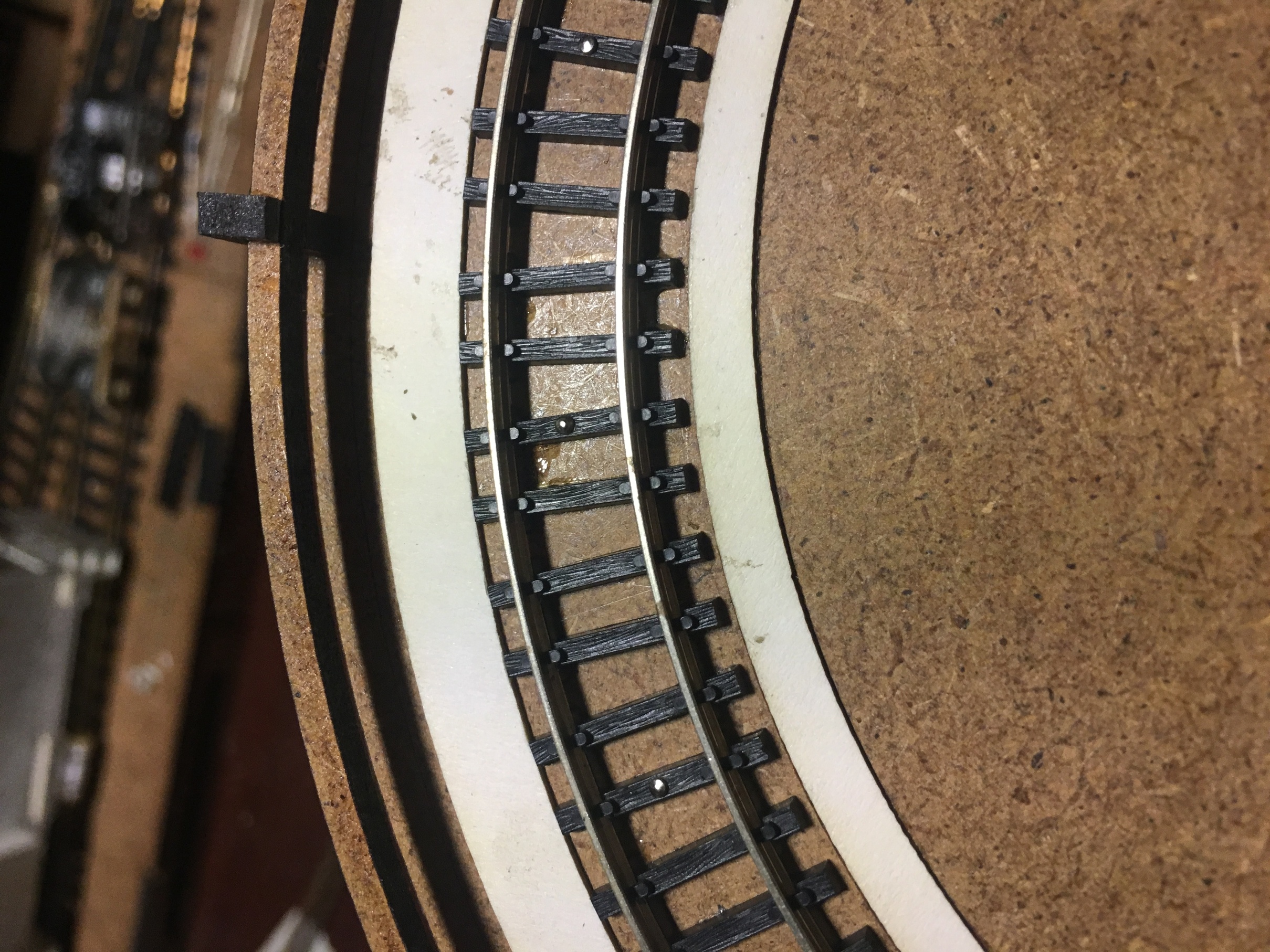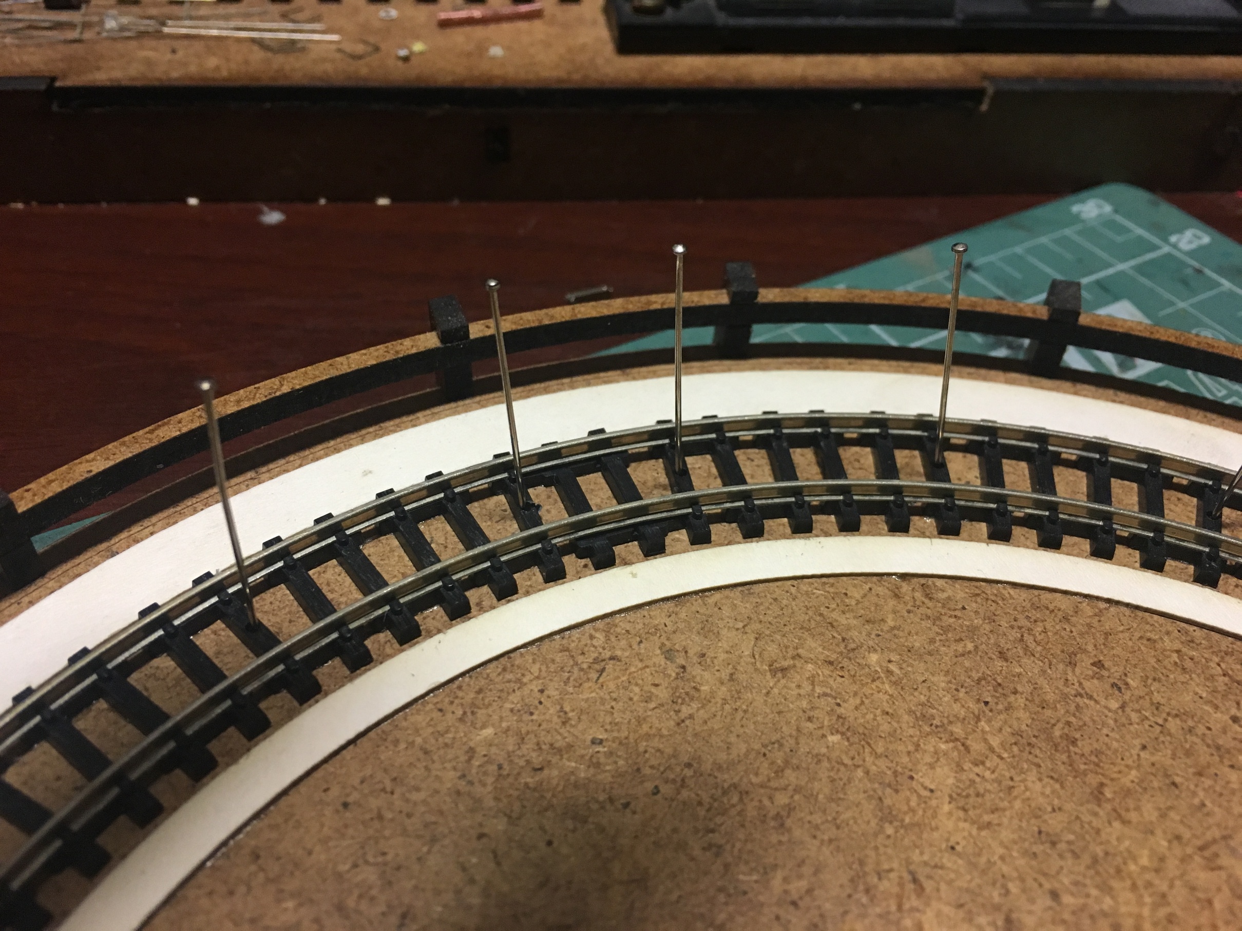 Когда определился с высотой и прочими габаритами, принялся за изготовление самого круга. Фотографий сборки конструкции нет к сожалению. Там ничего сверхъестественного. Основание с разметкой под установку деталей, каркас боковин, чтоб конструкция была крепкой и на неё, установить декор в дальнейшем. Самое занятное началось, когда укладывал рельсы. Сделал небольшую призму так сказать. И по краю дал небольшой бортик, чтоб рельсы как бы в канаву укладывались и была хоть какая-то фиксация, пока буду крепить. Изначально, планировал на клей Uhu. Но по ходу пьесы, вспомнил, что просил когда-то жену, купить упаковку иголок с круглым окончанием. Мне под судомоделизм нужны были. Жена не поняла немного и купила с плоской шляпкой. В итоге, года 3-4 пролежали без дела. И тут я про них вспомнил. Под энку, как заменители гвоздиков, зашли просто идеально. Я не ожидал такого результата. Соединительные окончания рельс, ещё не уложил. Буду вставлять кусок рельс, паять и обтачивать. Но клей+иголки, зафиксировали намертво. И очень эстетично вышло