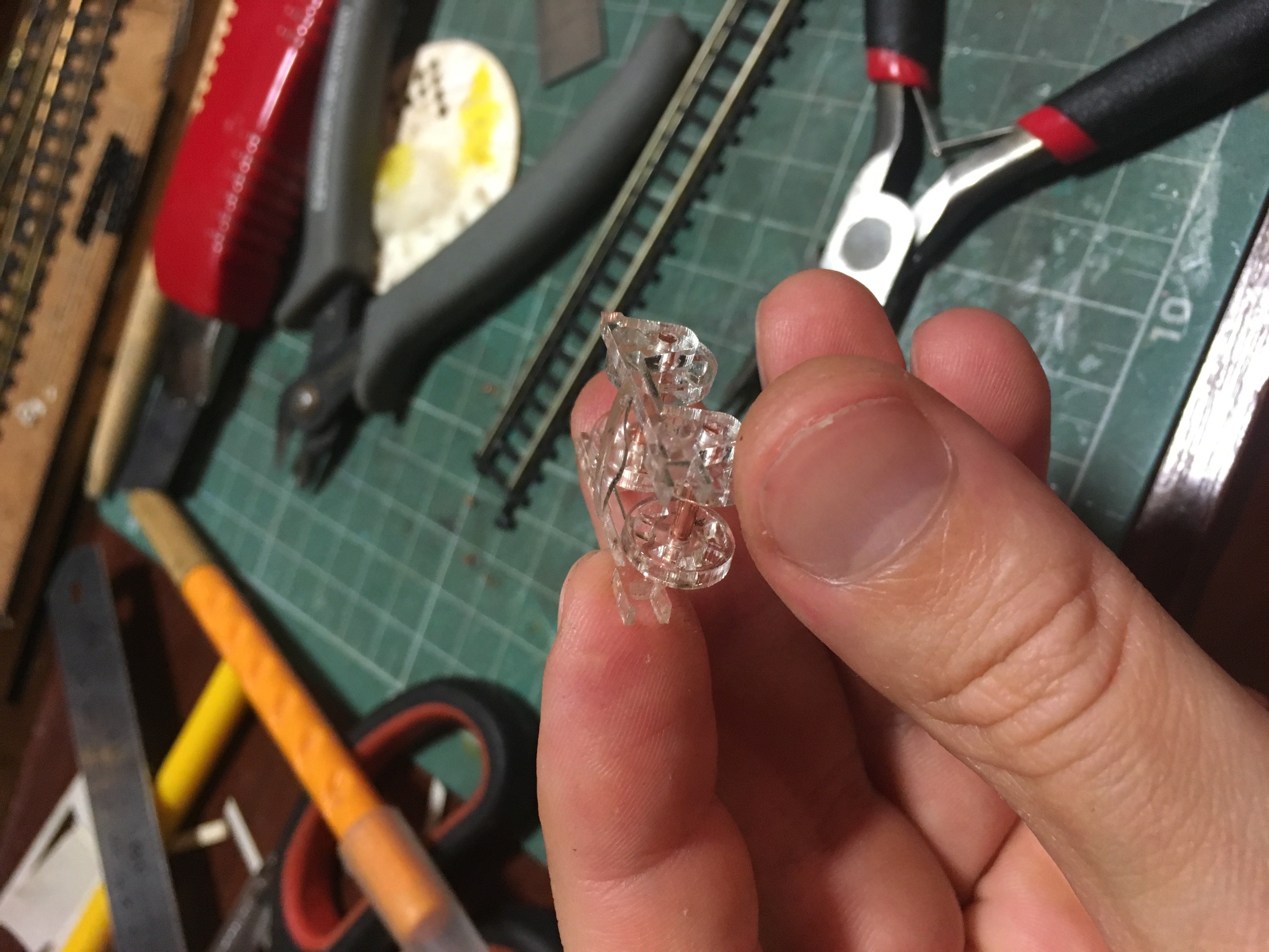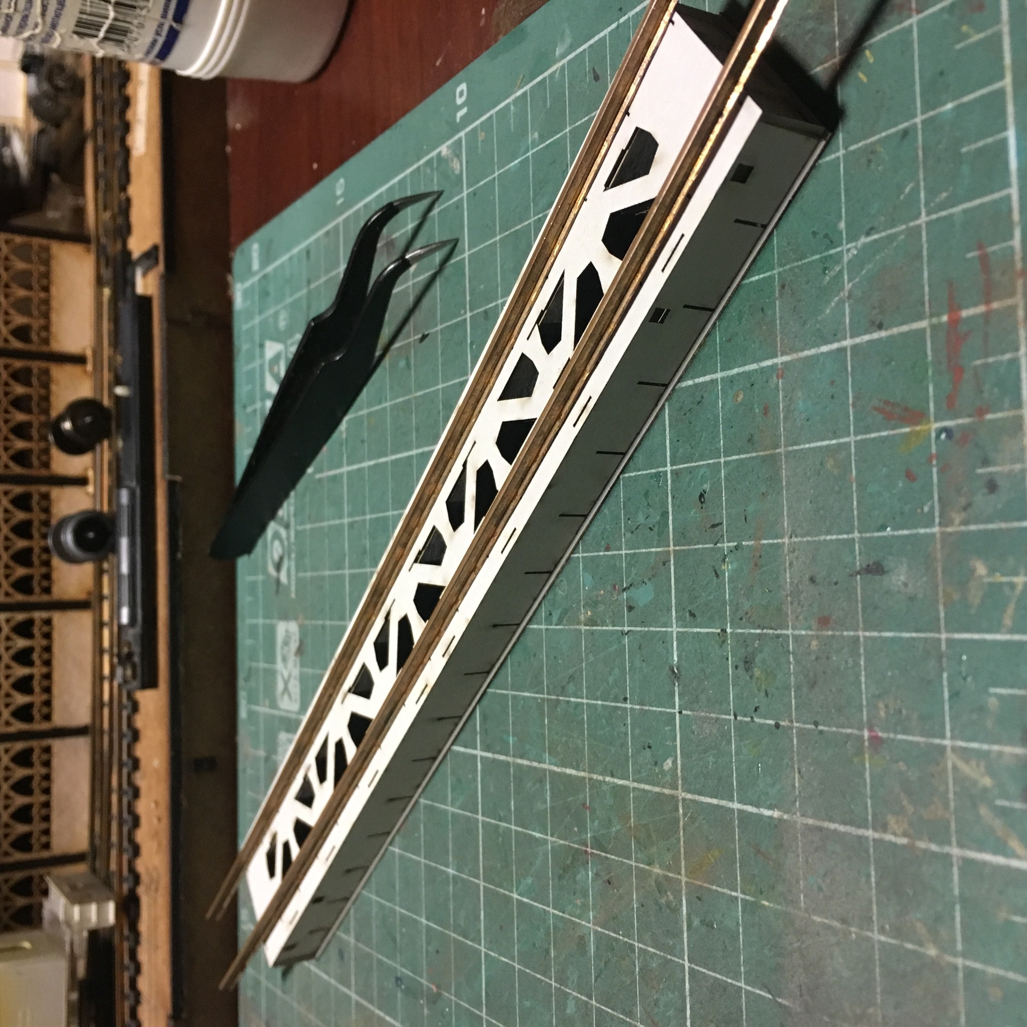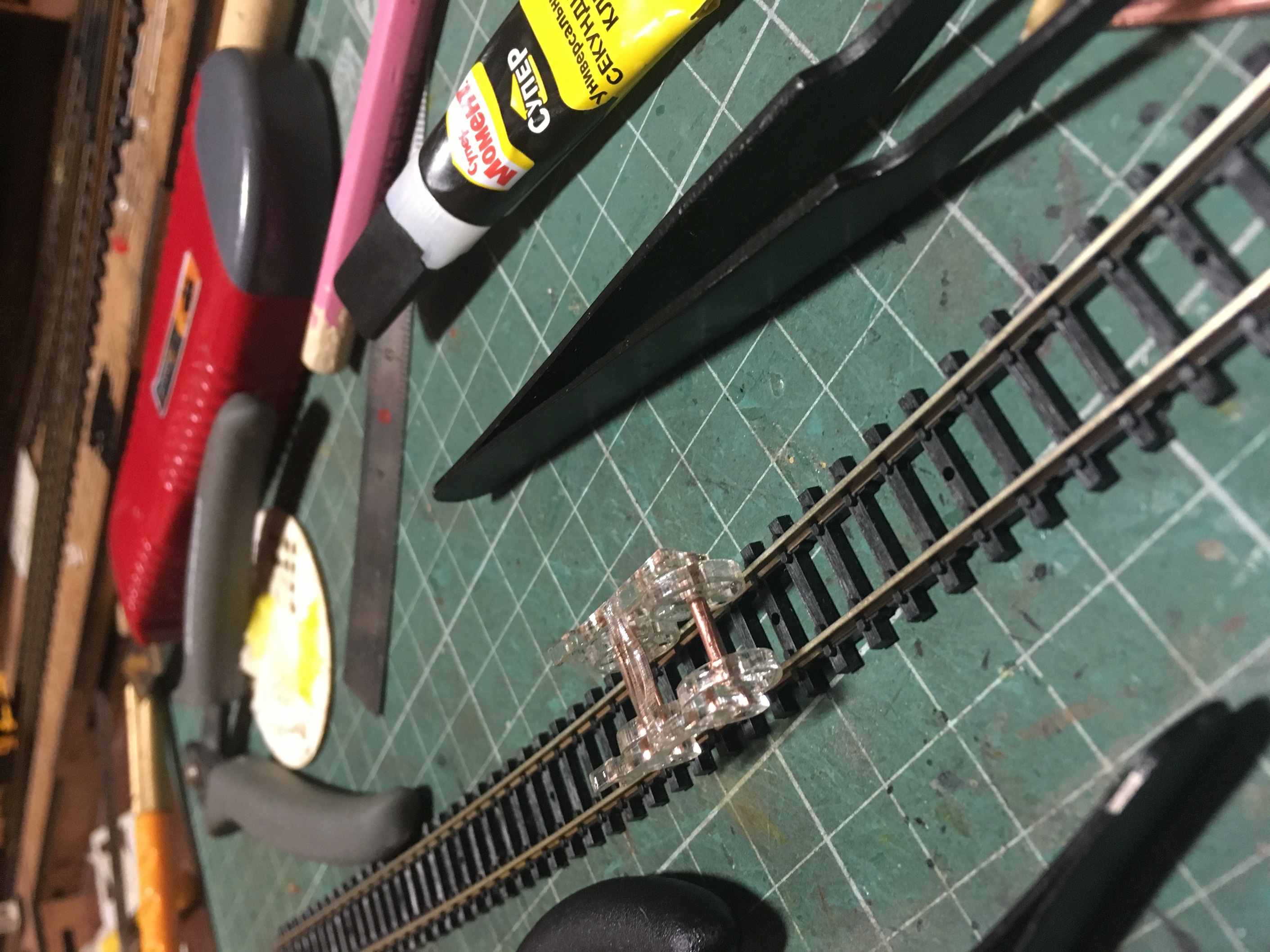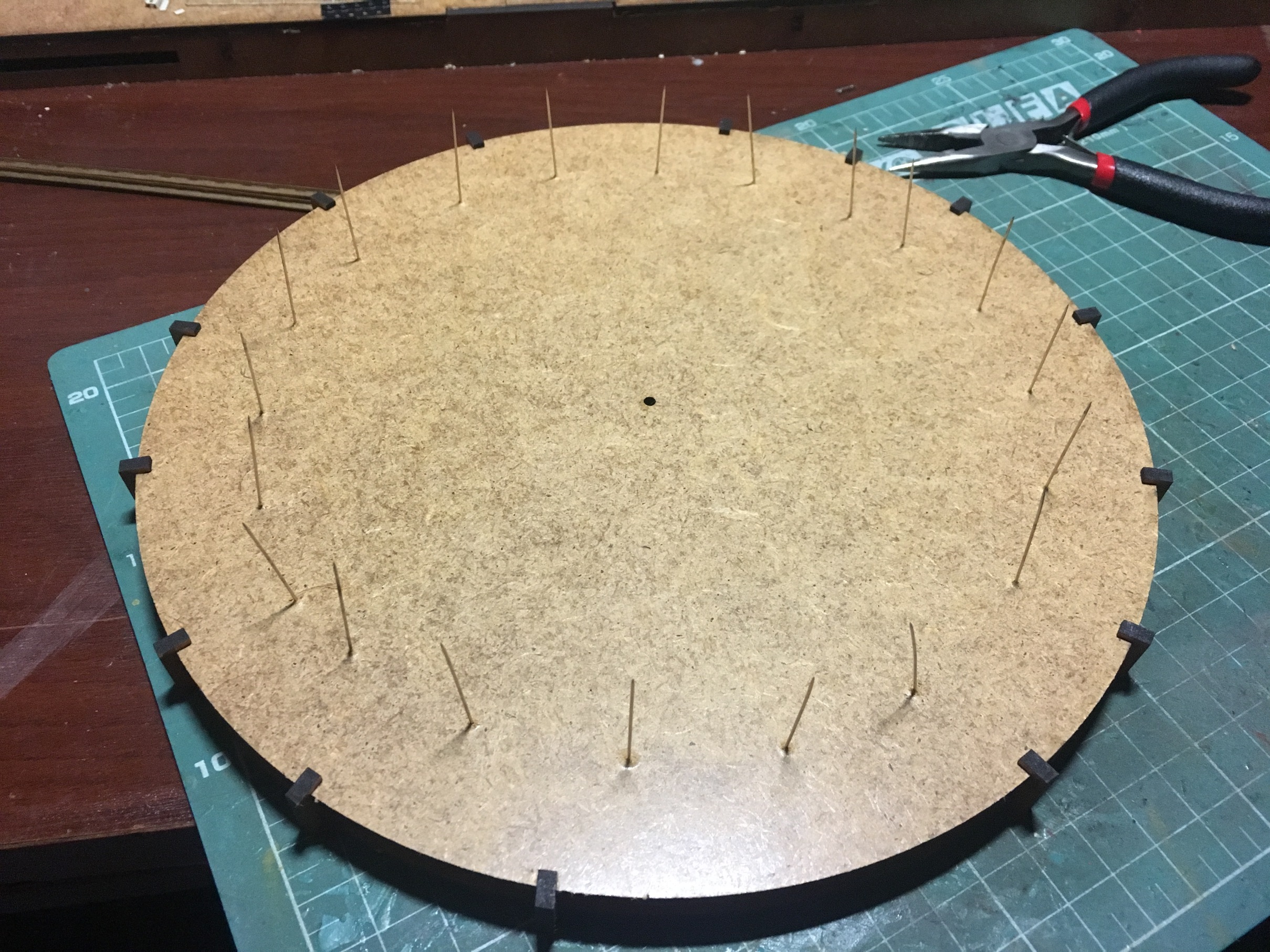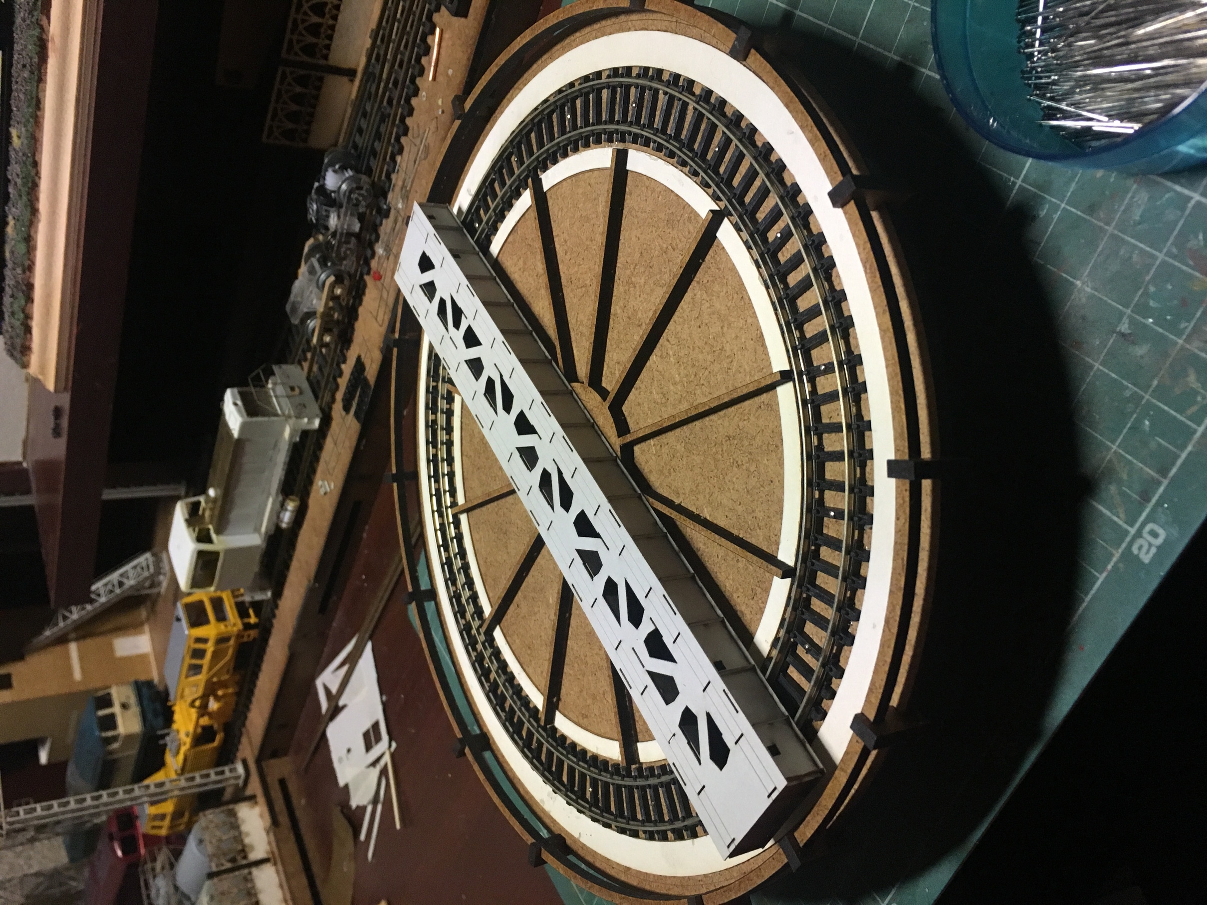 Когда определился с высотой и прочими габаритами, принялся за изготовление самого круга. Фотографий сборки конструкции нет к сожалению. Там ничего сверхъестественного. Основание с разметкой под установку деталей, каркас боковин, чтоб конструкция была крепкой и на неё, установить декор в дальнейшем. Самое занятное началось, когда укладывал рельсы. Сделал небольшую призму так сказать. И по краю дал небольшой бортик, чтоб рельсы как бы в канаву укладывались и была хоть какая-то фиксация, пока буду крепить. Изначально, планировал на клей Uhu. Но по ходу пьесы, вспомнил, что просил когда-то жену, купить упаковку иголок с круглым окончанием. Мне под судомоделизм нужны были. Жена не поняла немного и купила с плоской шляпкой. В итоге, года 3-4 пролежали без дела. И тут я про них вспомнил. Под энку, как заменители гвоздиков, зашли просто идеально. Я не ожидал такого результата. Соединительные окончания рельс, ещё не уложил. Буду вставлять кусок рельс, паять и обтачивать. Но клей+иголки, зафиксировали намертво. И очень эстетично вышло