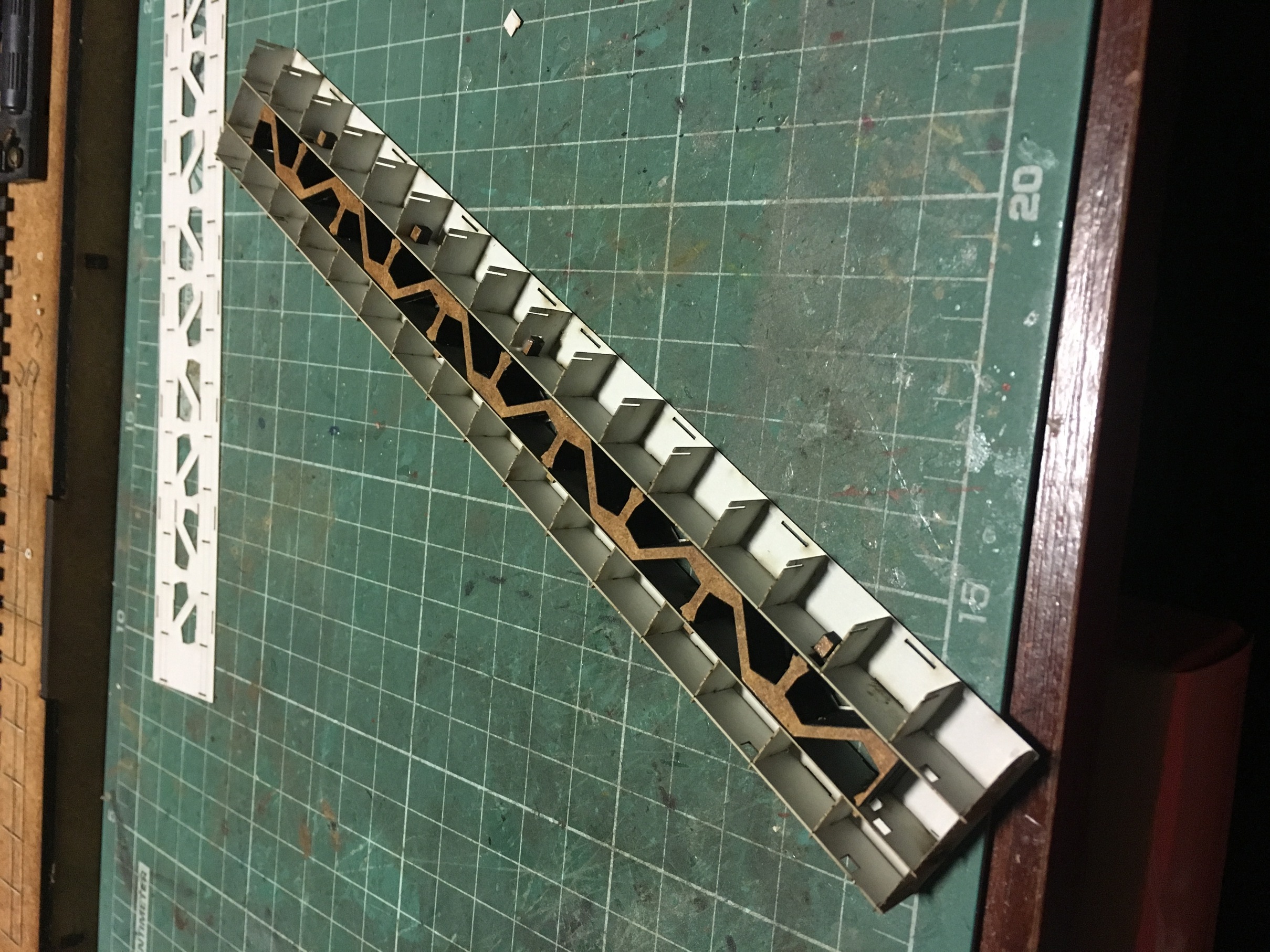 Далее, вырезал в подмакетнике отверстие под круг. Пришлось на готовой части подмакетника, резать на глаз. Как установлю всё, неровности и прочее, прикрою. Это не проблема. И нарисовал и собрал дополнительный кусок модуля, чтоб вошёл круг. Далее, собрал рампу, так как мне наглядно надо было проверить её размещение и посмотреть в живую по высоте. На фото ниже, моменты процесса.