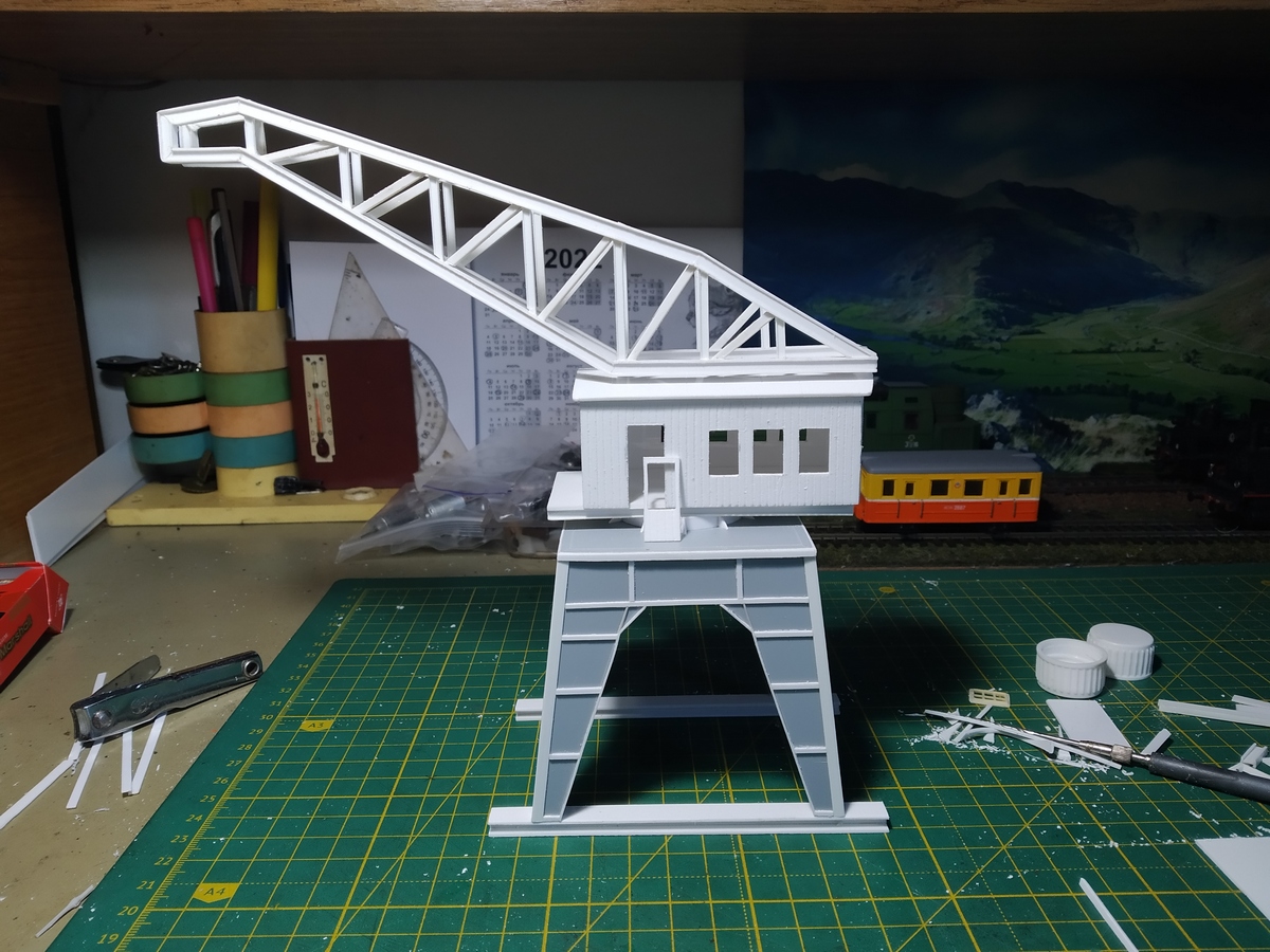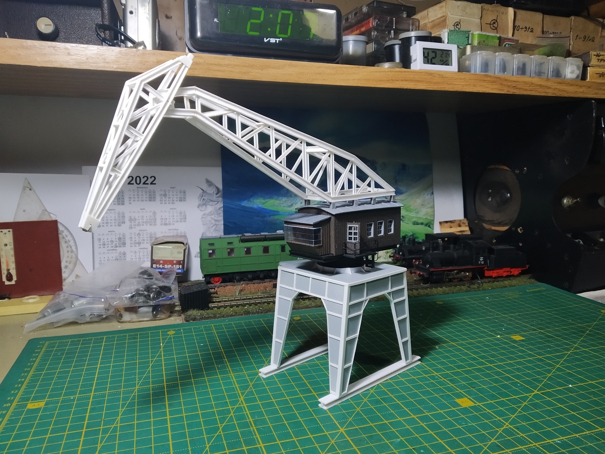 Кран пока обзавёлся только тележками. P.S. Стрела крана изначально лежала на полке так, что по умолчанию должна была упасть с высоты около 1,5м. Т.е. я отлично знал, что упадёт. Упала. Ничего не сломалось.