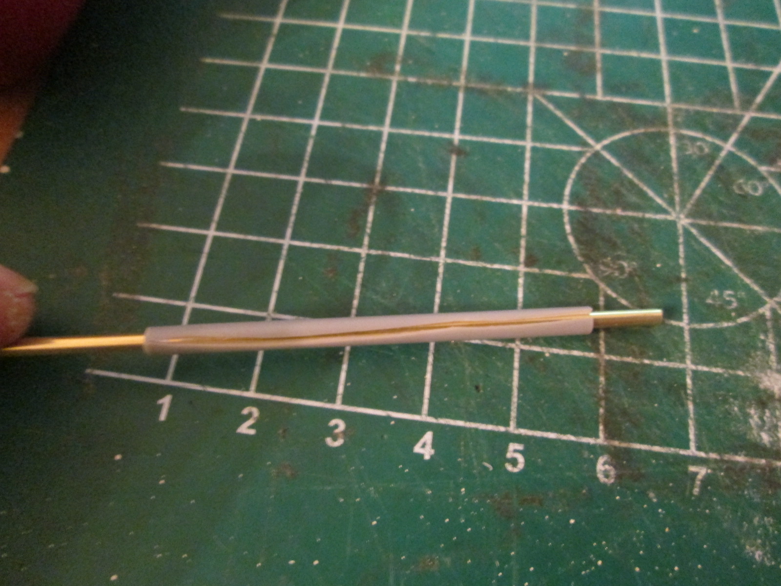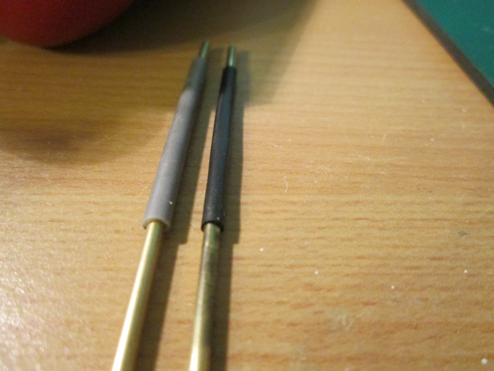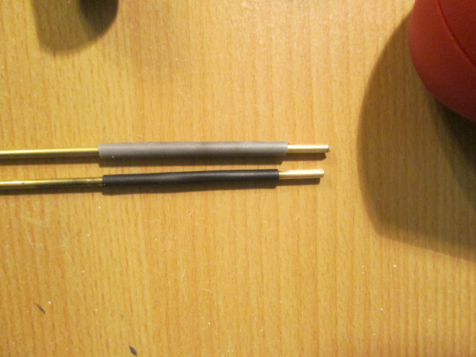 привет всем, пока нет сильно никаких обновлений. но вот вчерась купил себе пару латунных трубочек длиной по 1 м в диаметре 2мм со стенками в 0,3 мм. нарезал на столбики для освещения и задался вопросом из чего сделать утолщенное основание. перебрал все что было под руокй от стержней от ручек и ушных палочек до кембрика от толстых проводов. последнее вроде все шло. но не до конца. разрезал тогда по вдоль и одел, но есть зазор, тогда скрутил его малость и зазора не стало. встал вопрос чем клеить. попробовал клеем Piko. результат ниже