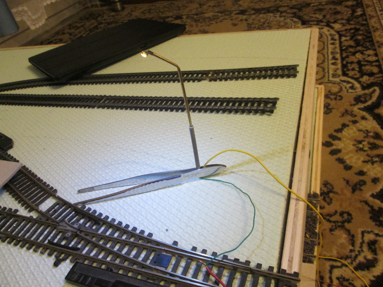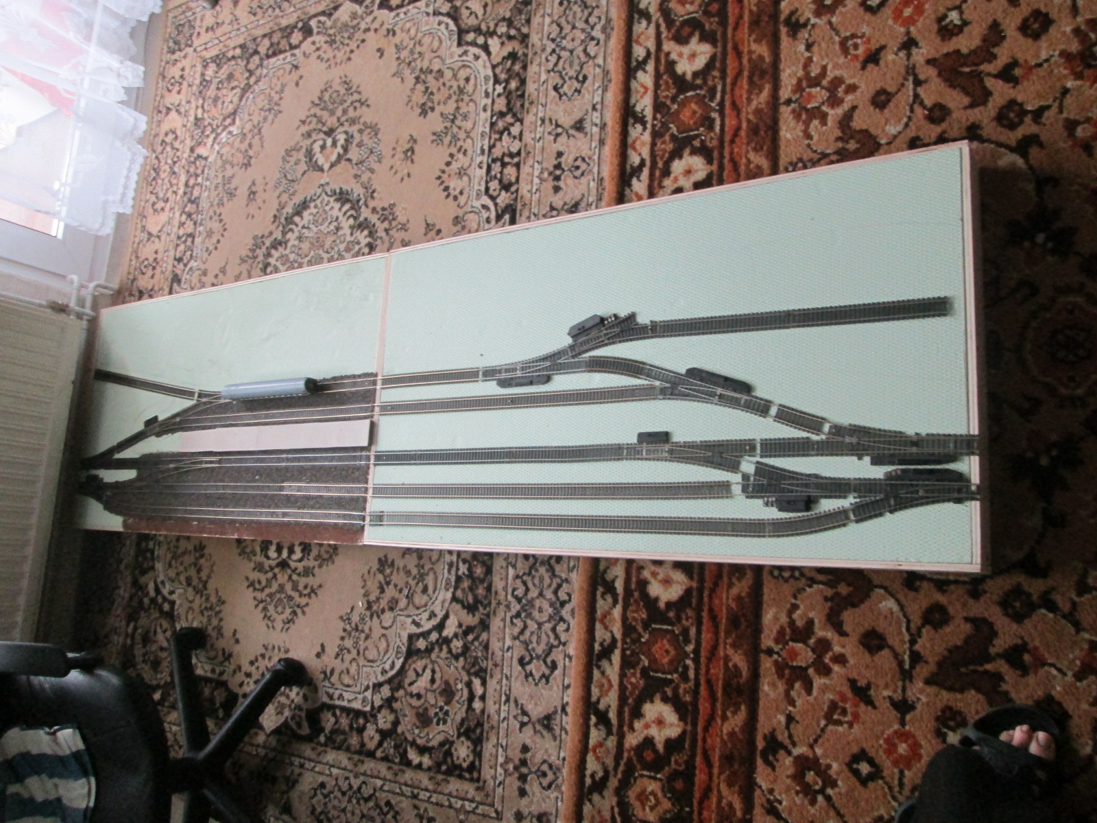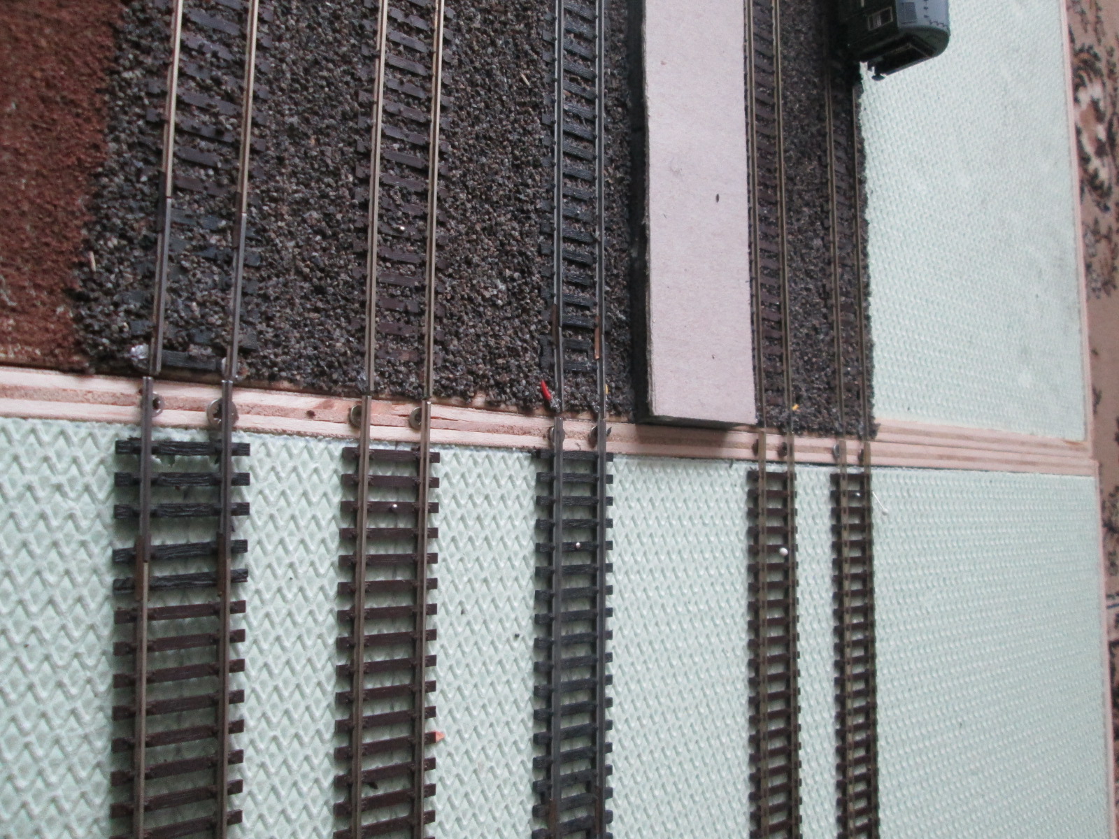 Что касается стыка. старался все подогнать. может именно большая ошибка моя в том, что рельсы там вниз местами прогнуты, надо бы ваще на стыке сразу полотно на 2 стыка ложить, а потом уже резать, а так в целом по всем местам все нормально