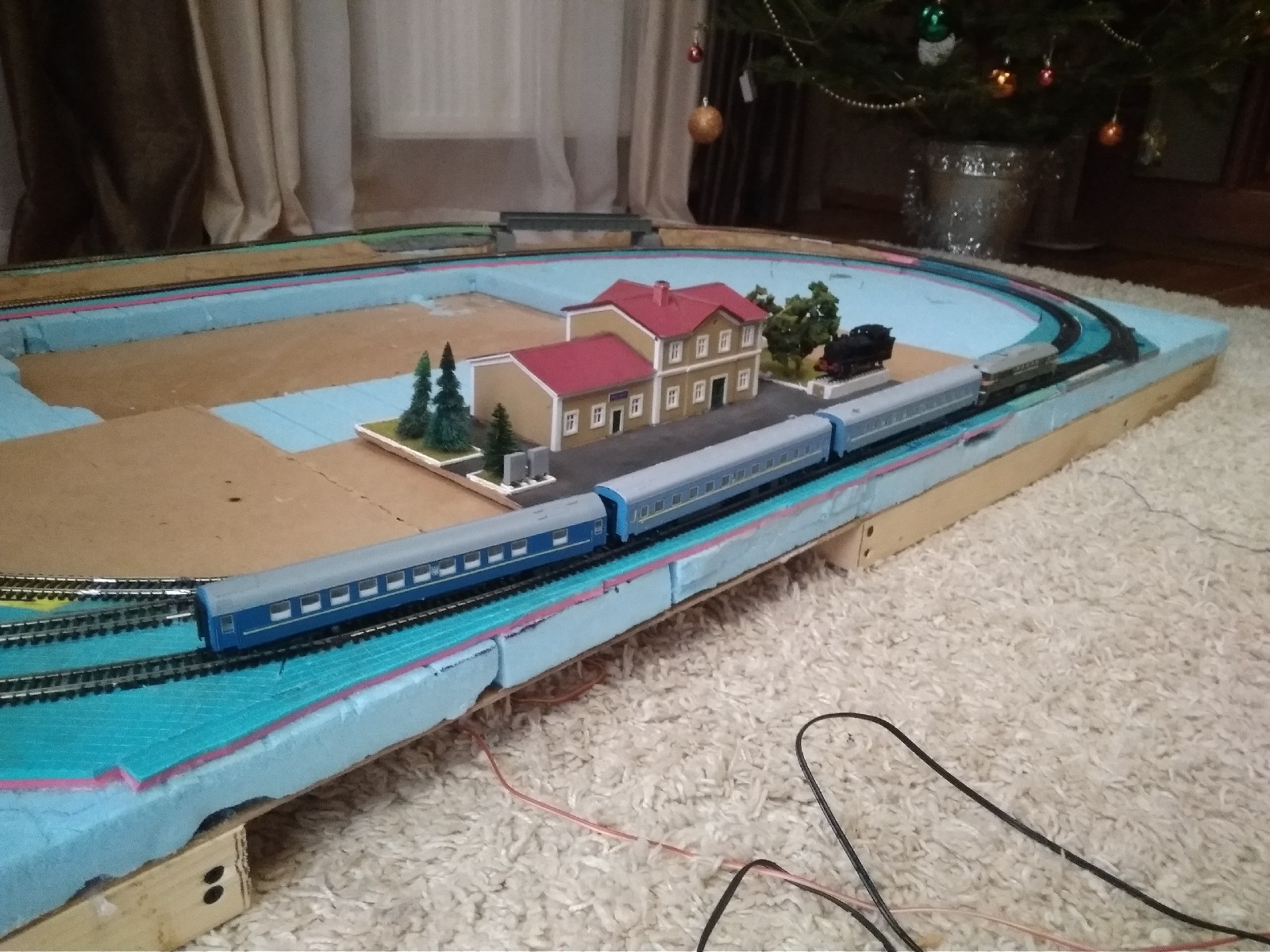 Відео першого поїзда. Станція розрахована на трьохвагонний пасажирський поїзд з довгобазних вагонів по головному ходу та третій колії, якої поки що не існує. Перша колія - на лок з одним вагоном. По внутрішньому поки не ганяв - десь контакту на скрутках немає, а я все рівно проводку не зараз робитиму - махнув рукою.