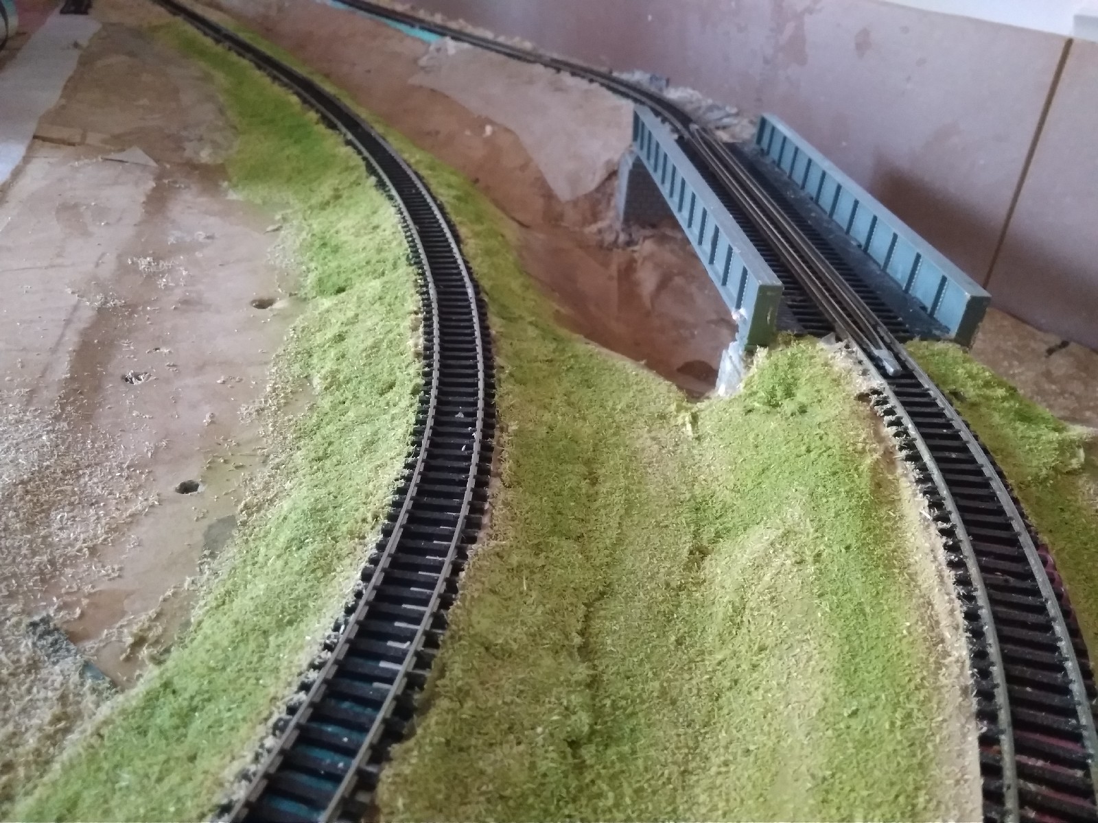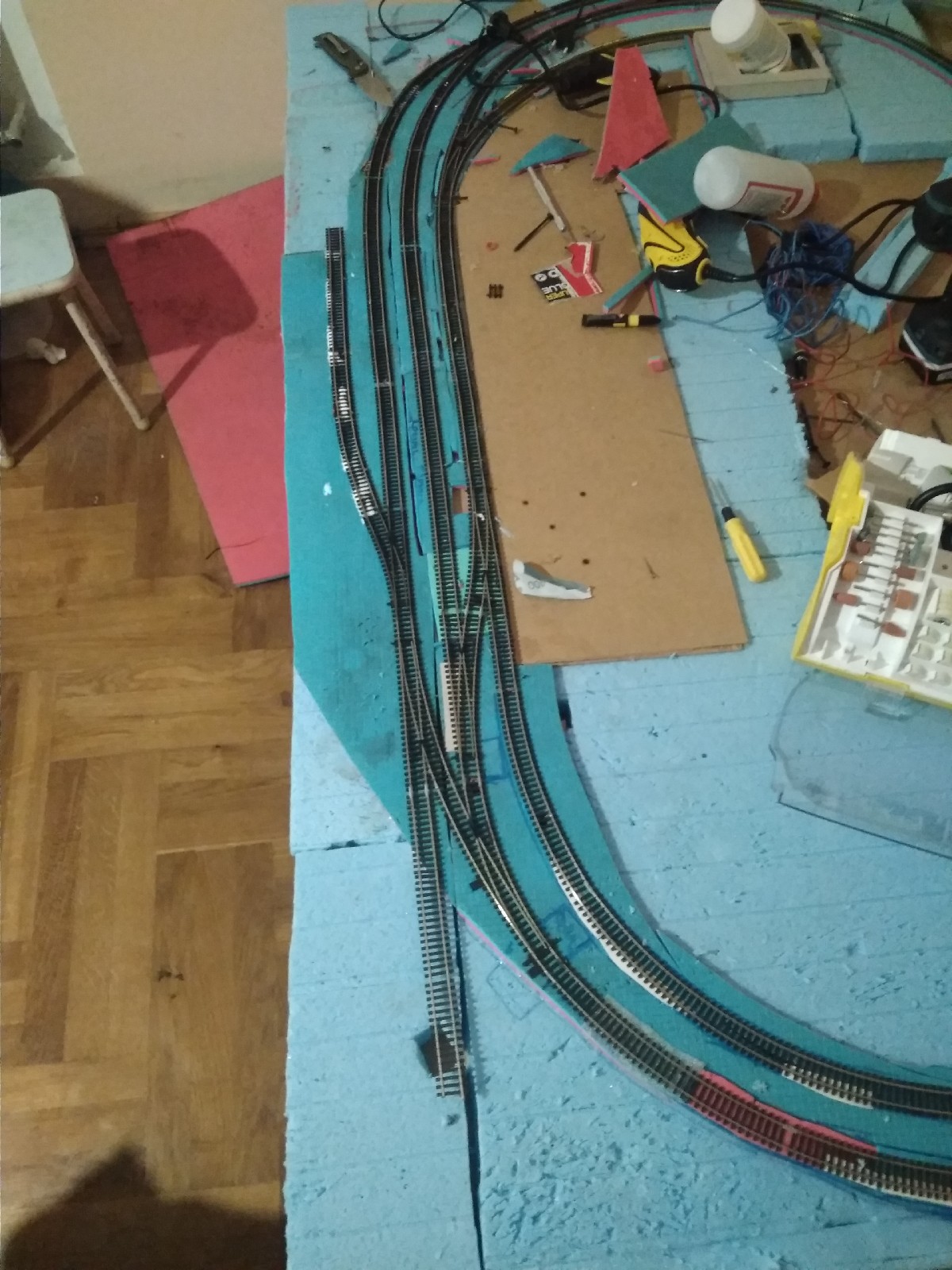 Трохи просуваємось. Доштукував спереду 12см підмакетника, проклав третю колію та тупикову четверту. Справа буде вихід за межі макету через тунельний портал.