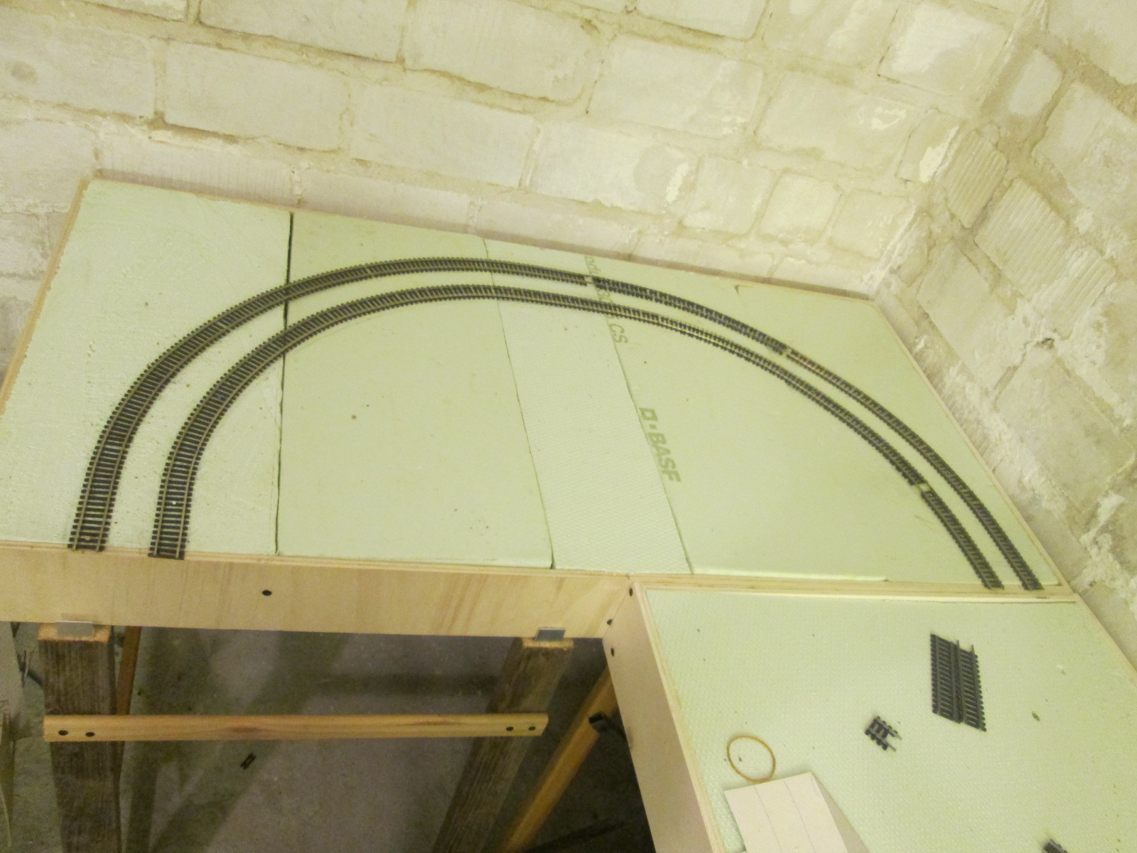 Получилось так, что большинство радиусных участков уложил стандартными радиусными рельсами. В некоторых местах использован американский путевой и радиусы немного подгибал под нужный мне размер. Рельсы точечно прихвачены к основанию суперклеем, примерно одна точка на одну секцию. На всех участках, собранных из секций, стыки пропаяны, но никаких проблем с температурным расширением нет.