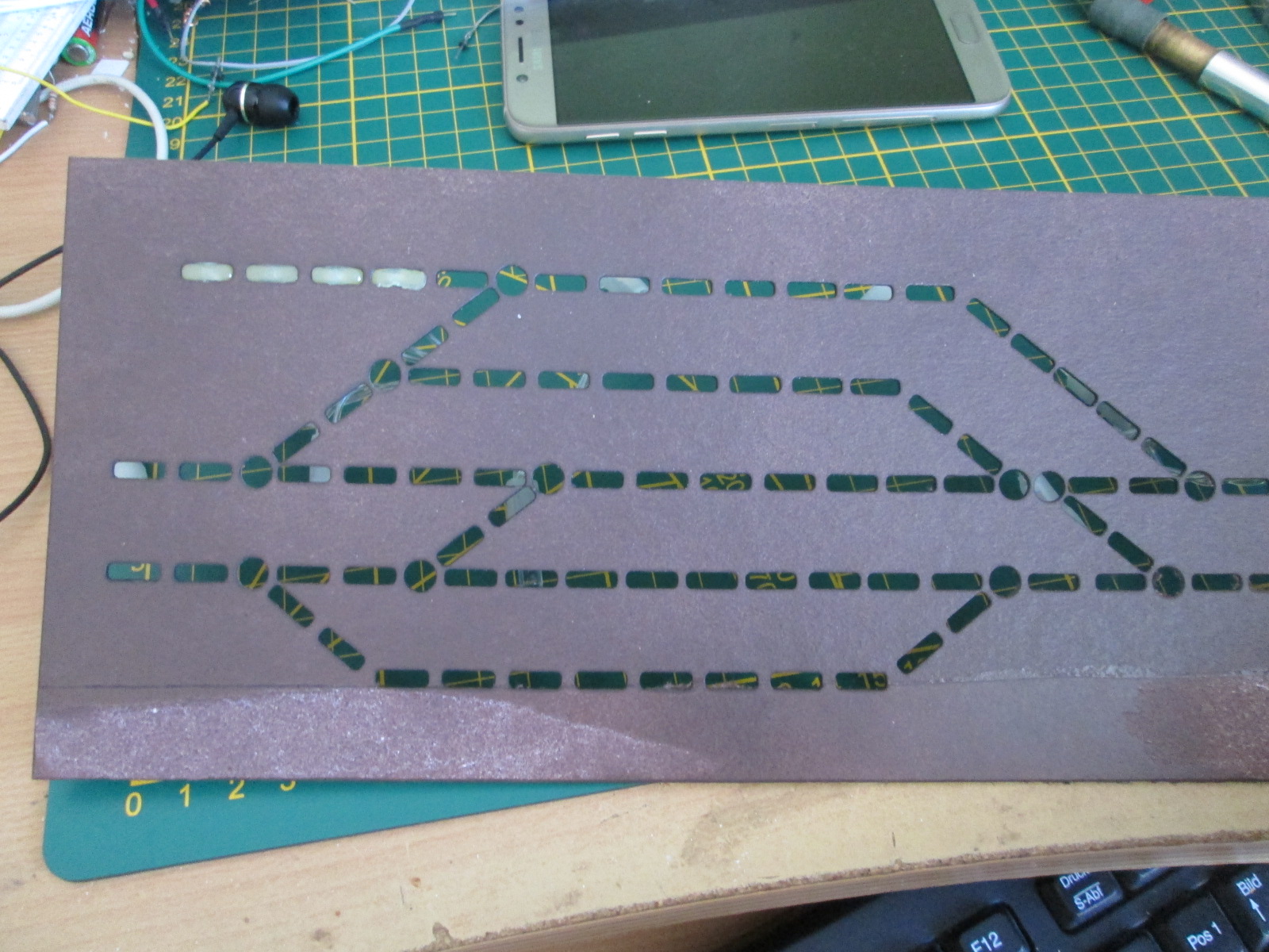 Но есть два места, где радиусы сделаны только флексом. Тоже точечно прихвачен суперклеем с промежутками, равными соседним путям. При нормальной комнатной температуре всё выглядело очень красиво. Тем более, что при укладке размер межпутевого контролировал шаблоном-кондуктором. Вот только коэффициенту линейного расширения все эти дела до фени...