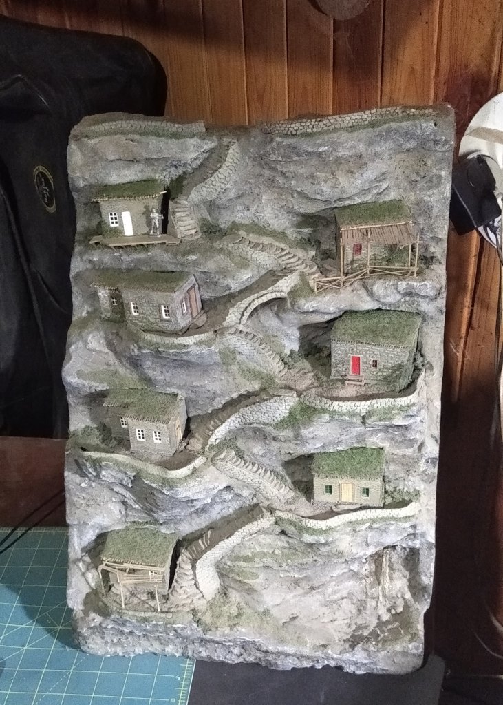 Для подпорных стен (как и для домиков) резал клише из линолеума и печатал по типу линогравюры, а именно: наносил ту же сметану на картон (только погуще и иногда с алебастром), форму обтягивал пищевой плёнкой и прикатывал подготовленный картон к форме или валиком, или столовой ложкой (любимый инструмент). Клал под пресс на полчаса, потом аккуратненько снимал плёнку с заготовки. Сушил. Тонировал. Резал. Клеил.