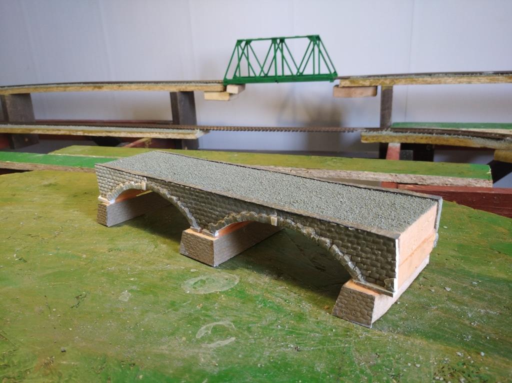 Каркас подмакетника заполнил 50-ти мм пенопластом как основу для будущего ландшафта. С целью облегчения конструкции пустил в ход всё, что под руки попалось: всякие коробки, гофрокартон, обрезки пенопласта. Клеил на ПВА и клей типа Дракон. Для придания рельефа сделал терморезак из картофелечистки, питание 6 V от автомобильного зарядного устройства. Причём, резать им горы упражнялся «на кошках», создавая горную деревушку. Установил мосты, один - от Bachman, другой самопал из пенопласта со стенами из гипса, отлитого по матрице из силиконовой формы.