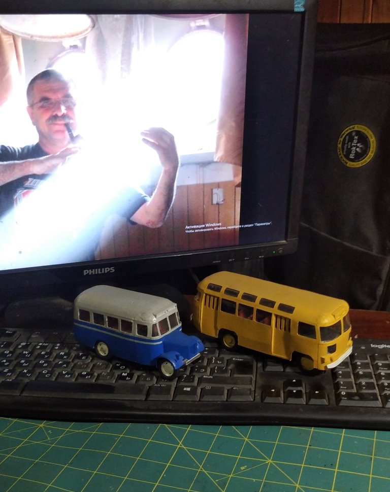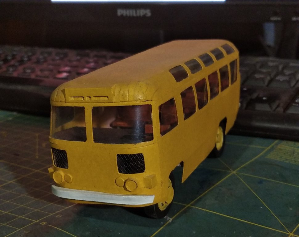 Автобусы делал из ватмана по выкройкам от NOVAMODEL. Это моя первая проба ножа в 43 масштабе. Опыты оказались удачными в отличие от пациентов: ПАЗик повело пропеллером (слишком тонкий ватман), КАВЗик тоже забуксовал на каком-то этапе. Работа стала бесперспективной, поэтому проекты свернул и отправил в архив на дальнюю полку.