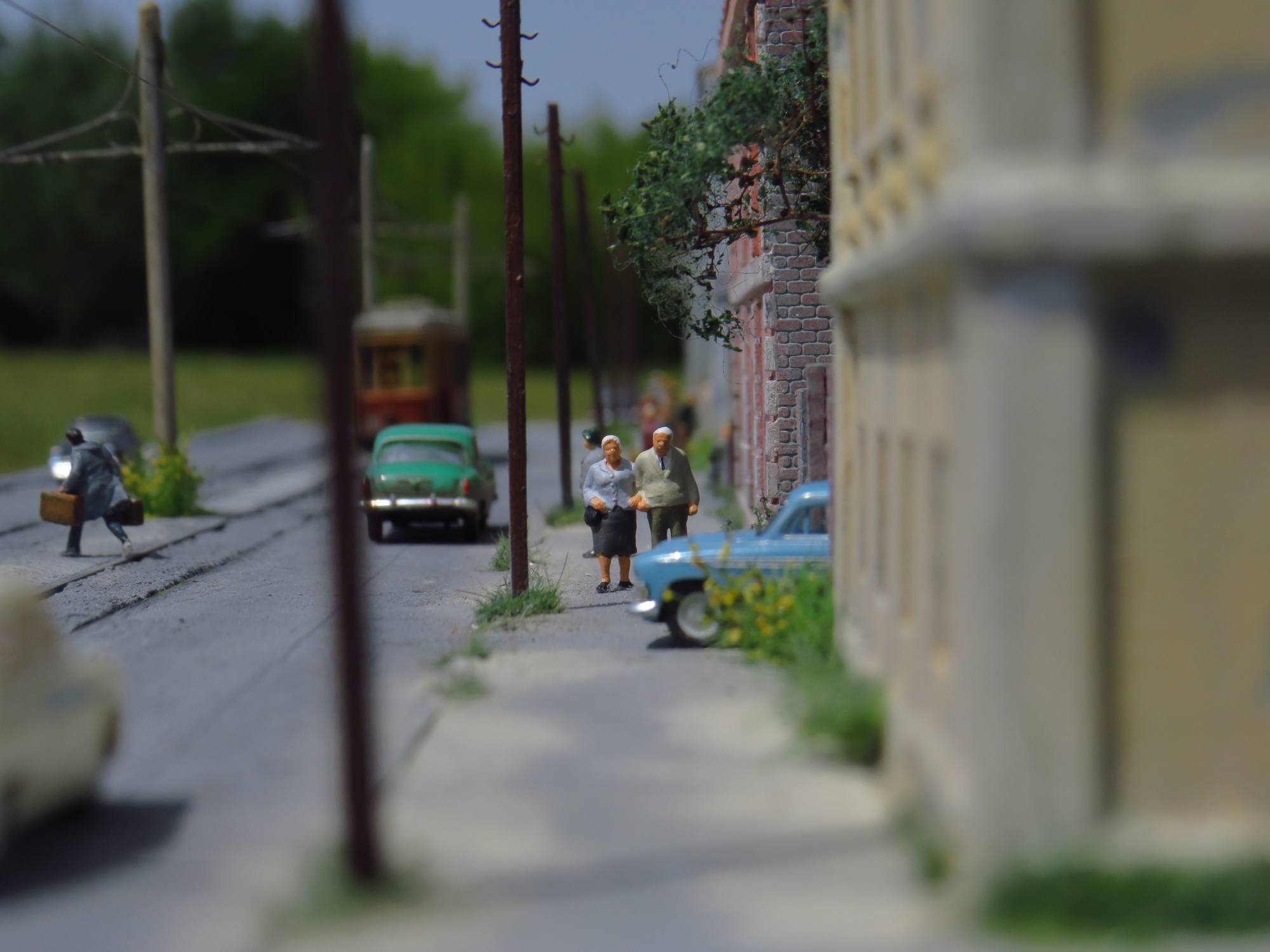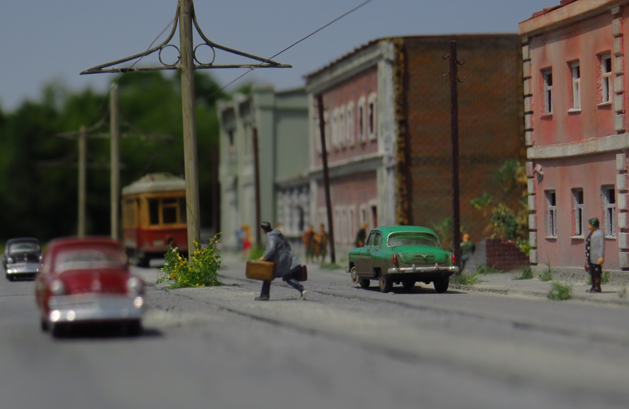 Относительно эпохи - диорама задумывалась так, чтобы подходила к любой эпохе. Т.е. хоть 1920, хоть 2020. Разные фигурки, машинки, трамваи, какие-нибудь мелочи - получаем разные годы.