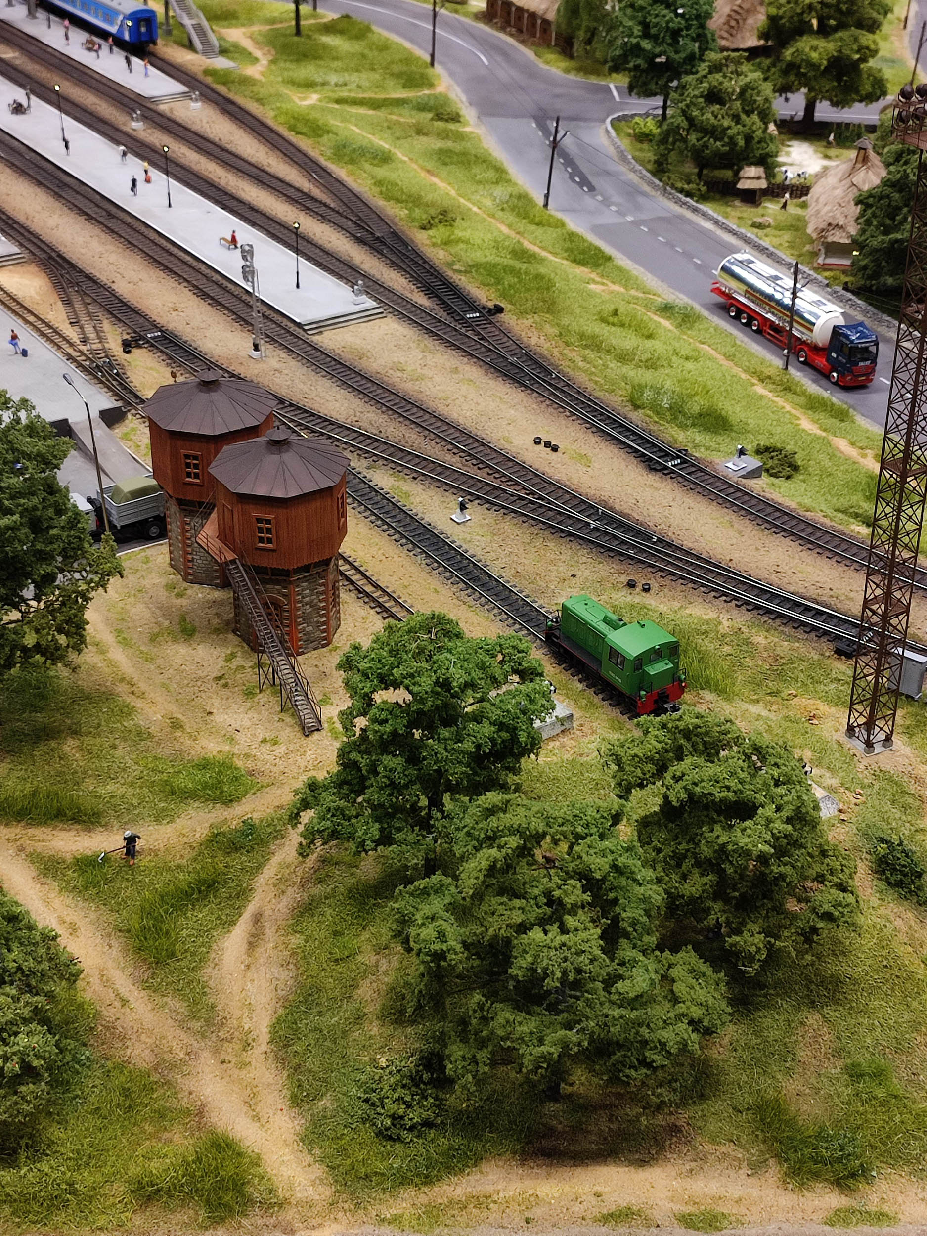К вопросу узнаваемости. Вокзал Ивано-Франковска воссоздан один к одному, Олесский замок на горе - аналогично. Не говоря уже о том, что "внутренности" у этих строений также полностью воссозданы. Вода в реке - настоящая и водяная мельница приводится в действие именно течением, заслонки на плотине также подвижные и приводятся в действие дистанционно. Очень много сил и времени отдано именно деталям, которых при поверхностном осмотре просто не видно. Электростанция пока не имеет подключения к высоковольтной сети - провода ещё не натянуты и вышки высоковольтной сети не установлены. Кстати, семафоры на путях сделаны в местной мастерской. Есть разработанный и построенный опрокидыватель вагонов возле электростанции для выгрузки угля, а на другой стороне макета возле шахты - погрузчик этого самого угля. И узкоколейный ТУ2, как, впрочем и пассажирские "Пафаваги" - тоже "свои". Для совмещения широкой и узкой колеи на макете есть вокзал Гайворон. Тоже выполненный один к одному.