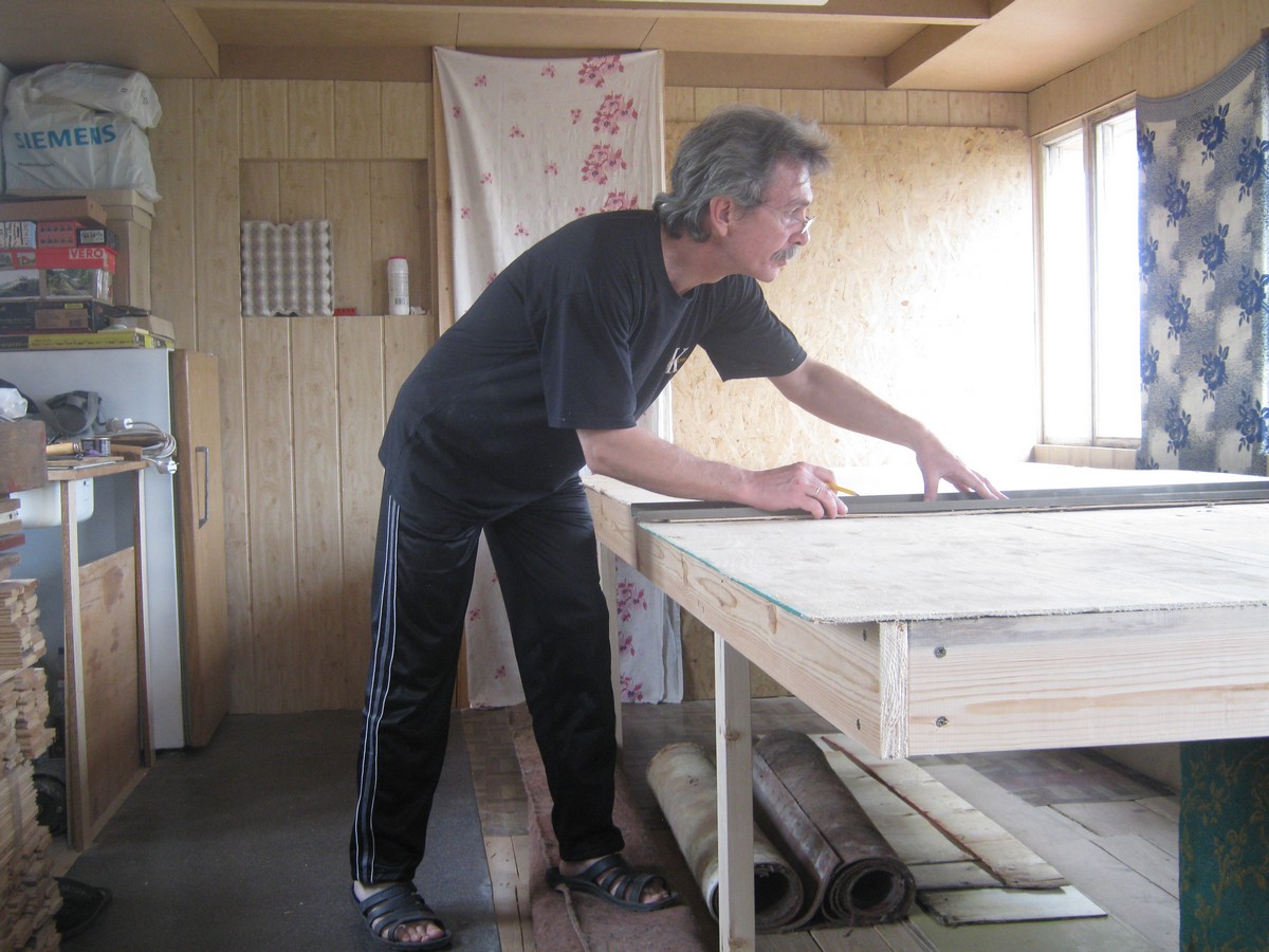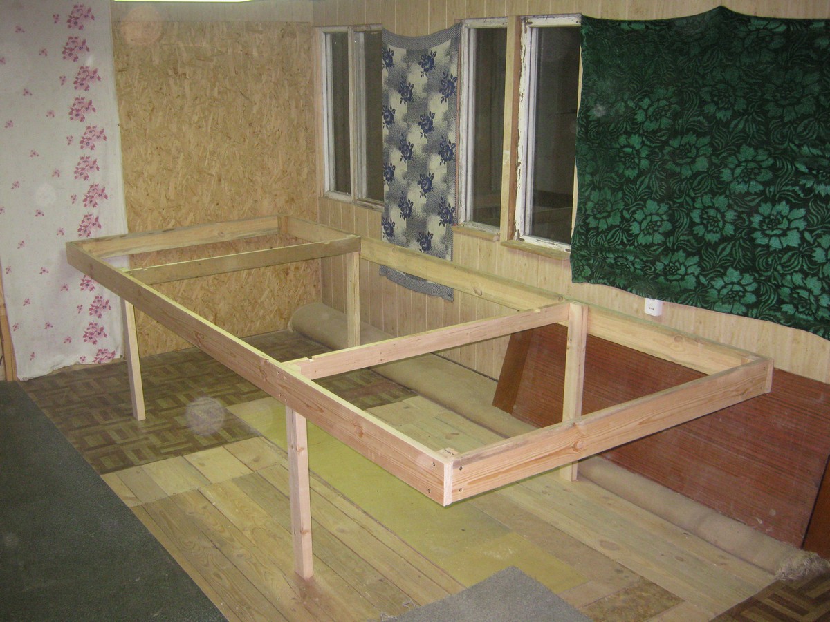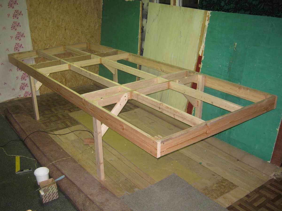 Конструкция собирается на саморезах 50х5,0 с проклеиванием ПВА. Даже на данный момент, при том, что ножки ещё не подкреплены раскосами к поперечинам, жёсткость приятно радует.