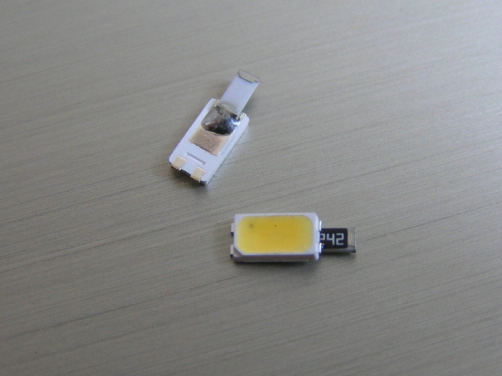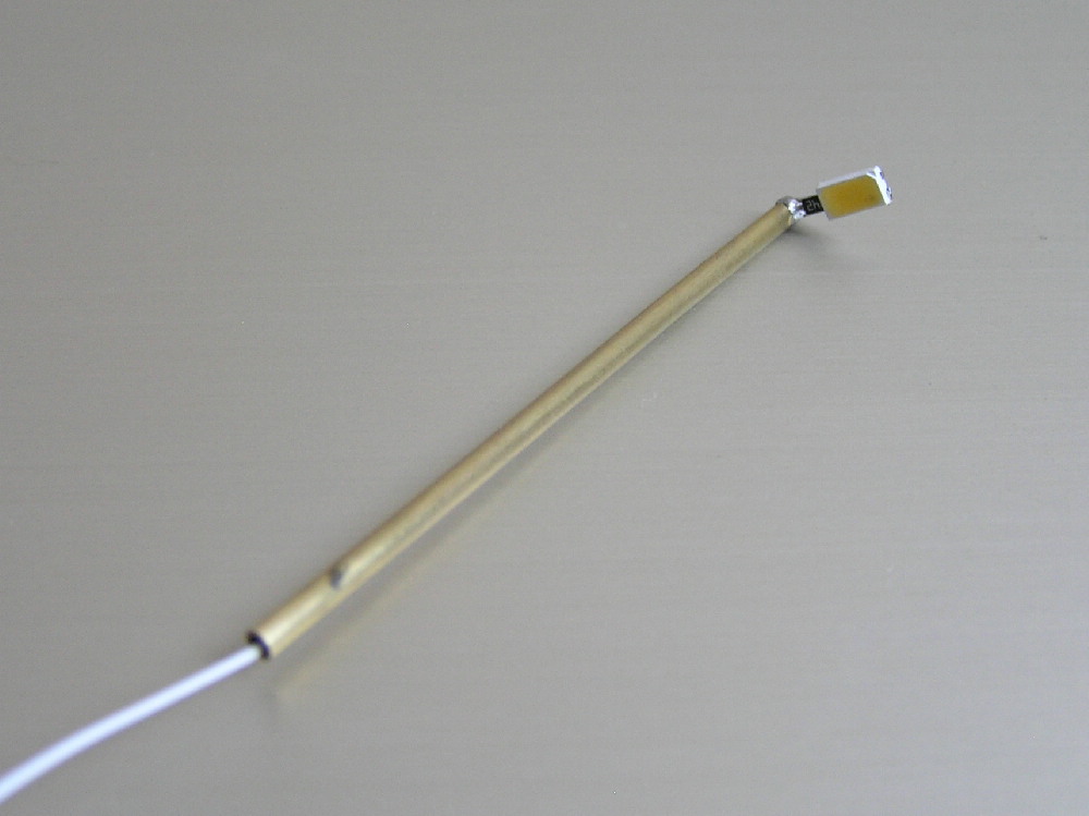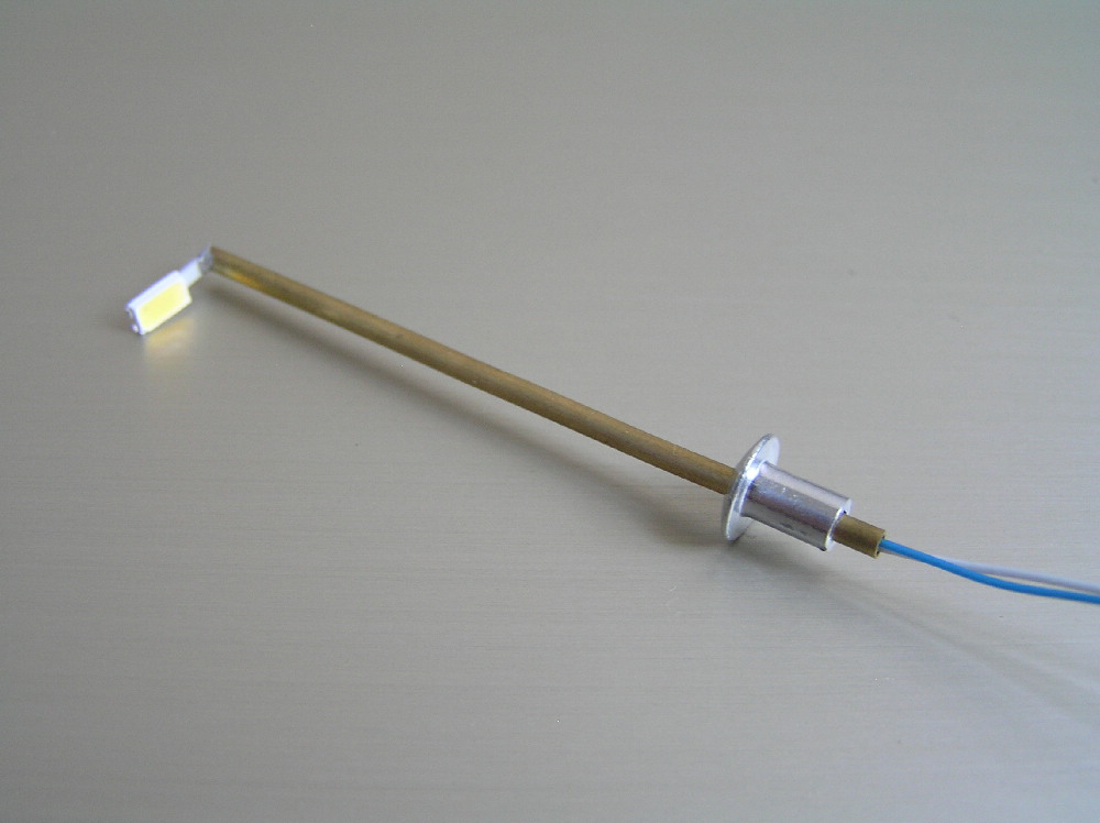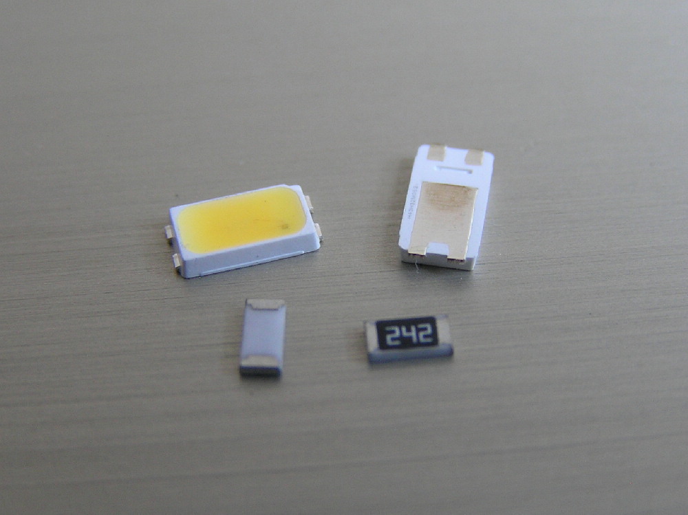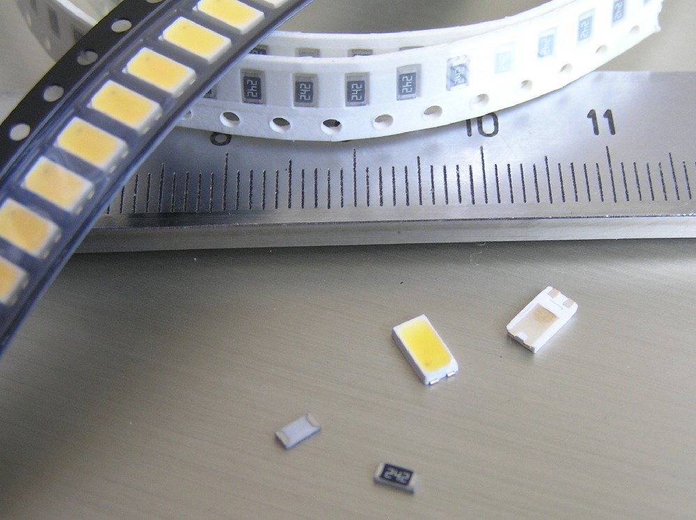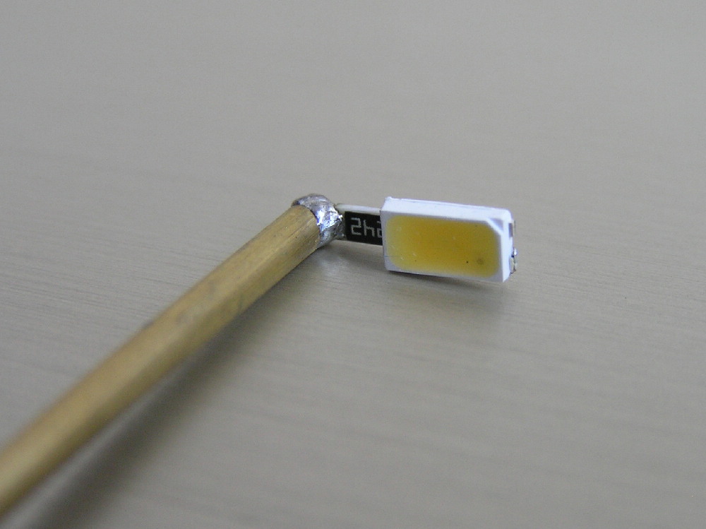 Работаю с SMD компонентами. Светодиоды 5630 и резисторы 1206 на 2,4кОм для подключения питания от 6 до 12В Запаиваю резистор прямо на светодиод. Латунная трубка диаметром 2мм.