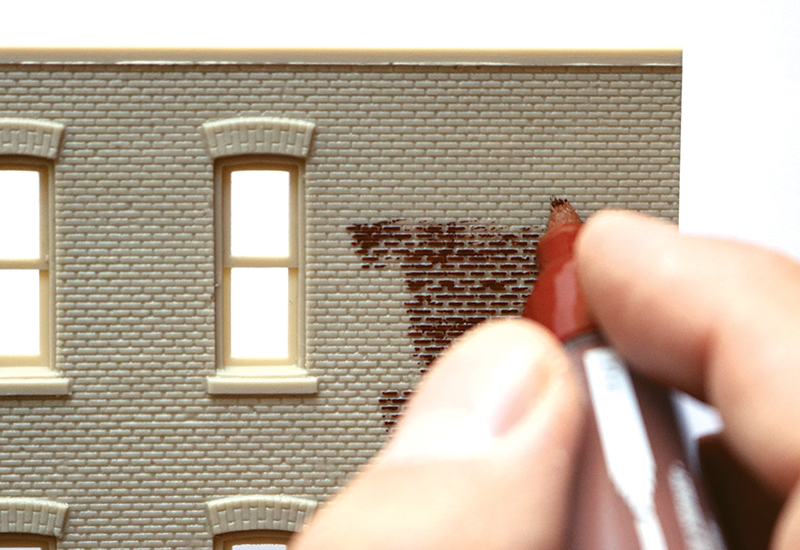На модели, которые сделаны из кирпичных стен, отлитых из коричневого или красного пластика (как некоторые наборы Walthers Cornerstone), загрязнение можно нанести просто натерев пластик куском газеты. Другой способ добиться того, чтобы кладка выглядела загрязненной - это измельчить с помощью ступки и пестика немного фюзенных карандашей для художников, сделанных из древесного угля, а затем кисточкой нанести получившийся порошок.