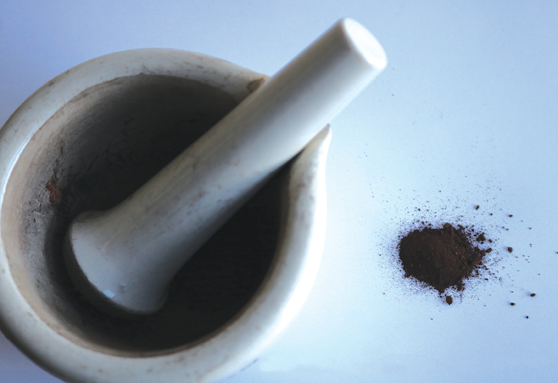 Использование ступки и пестика для измельчения мелков в грязный порошок.