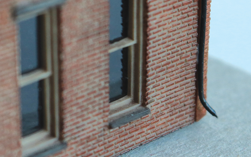 Пример готовой простой кирпичной стены, с нанесенными следами копоти и непогоды, полностью в духе маленького городка. Водосточные трубы - это проволока для флористов, покрашенная в черный цвет. Используя обычные распространенные материалы, при небольшом терпении легко создать внешний вид кирпичной кладки, потрепанной временем и непогодой.