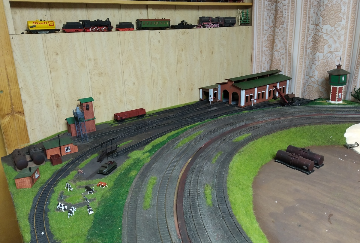 Кстати, почему-то я не опубликовал старую фотографию своего черновичка... Исправляю... Фотографировал для себя когда-то, так что в кадре "все лучшее сразу", включая автобус посреди леса - и ни одни предмет еще не закреплен, включая рельсы - вот их Ноховский коврик и поднял над землей. Ровняю, как водится в таких случаях, поездами :) Но мне с моим лесом было проще. У самого похожая компоновка: линия вдоль стены, депо и водонапорная башня справа, но общая фабула - лес - деревья натыкал за депо - и все. Кстати, деревьями же (или, лучше, кустами) можно замаскировать место стыковки вашего макета и задника. Невысокими, вдоль края - т.к. идеально прилегать задник к основанию будет вряд-ли, а кусты замаскируют, чтоб не бросалось в глаза. Впрочем, этого у меня даже не сделано, на прилагаемом фото видно за деревом конец горизонтального участка. Оговорка: у меня это полная глубина (перед рельсами край полки) и висит полка на уровне глаз, т.е. сверху никто не смотрит.