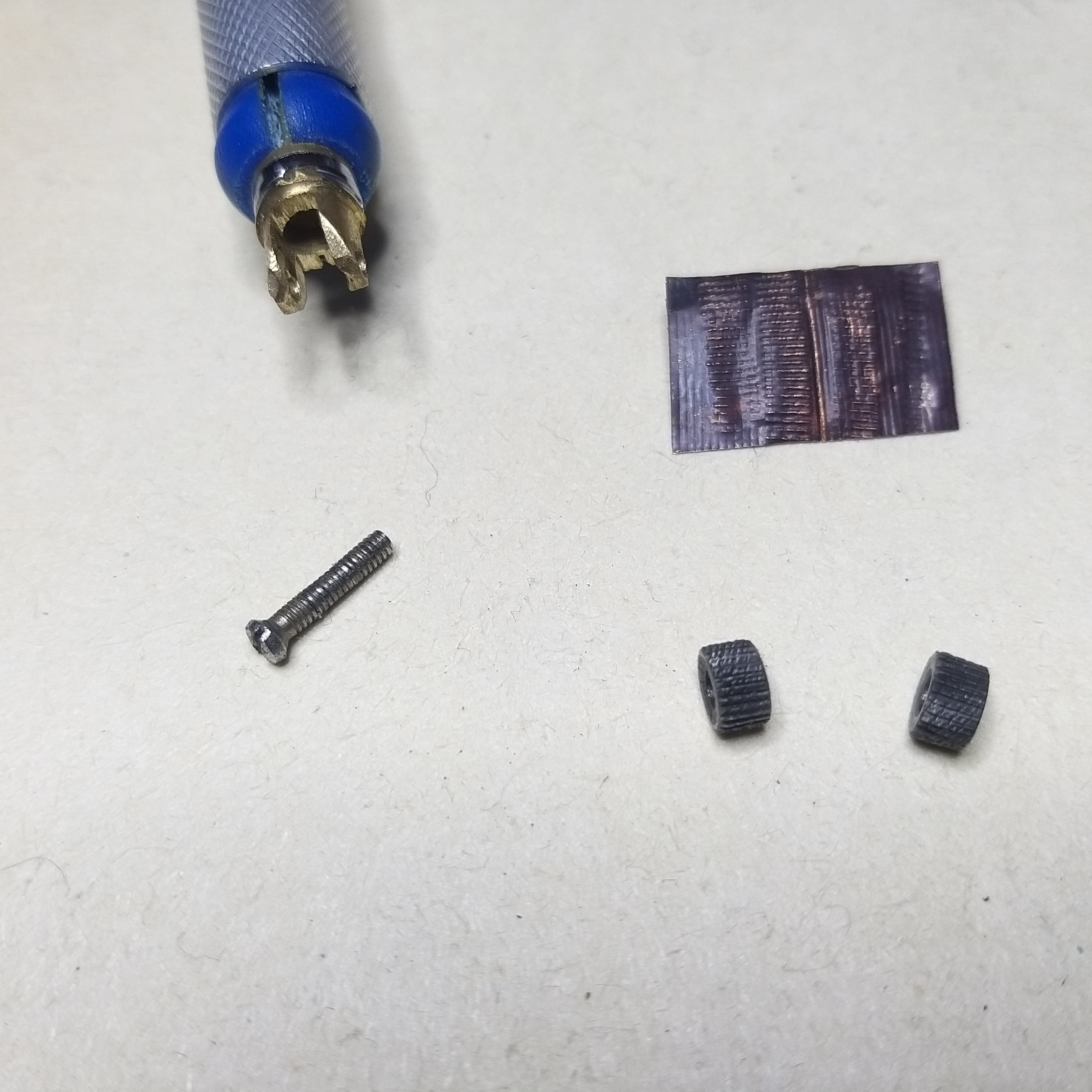 В моих далеких-далеких планах,есть хотелка,сделать модель тгк2, но вопрос с жалюзями, все тормозит... Опять зажигалки... Для кого их вообще придумали? Пародия на цанговый нож, плюс обточенный торец от антенны, которым она к радио прикручивается и колесико от зажигалки. Получается в итоге, после кучи проб,, на разных подложках типа ткани, картона, ватмана, что-то похожее на жалюзи. Благодаря, заточке наискось колесика, выходят "правильные" жалюзи елочкой. На фото, к сожалению плохо этот ракурс видно, а грунтом дунуть для проявки, как-то не додумался сразу...Понял, что идея рабочая, поставил покуда на паузу. Может кто-то дальше "доработает".... Пробовал " пакетом"что бы жалюзи шире были, но тут ожидала "засада"... Не знаю, с какой железяки эти колёсики делают, но при попытке снять фаски, что бы они плотно друг к другу стали, максимум что у меня получилось, это их поцарапать только... Далi буде....
