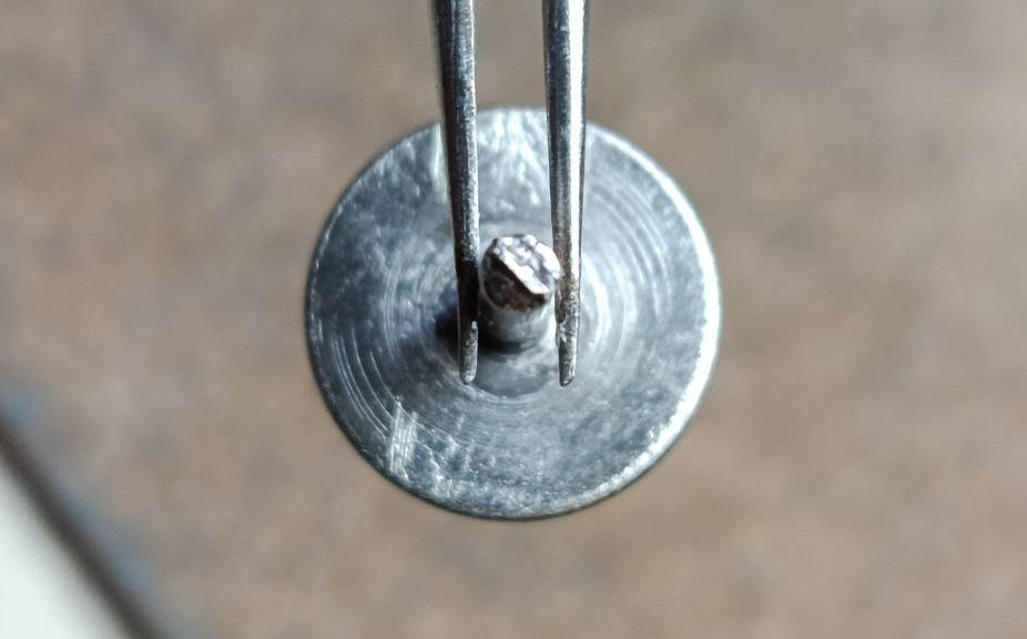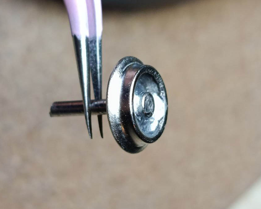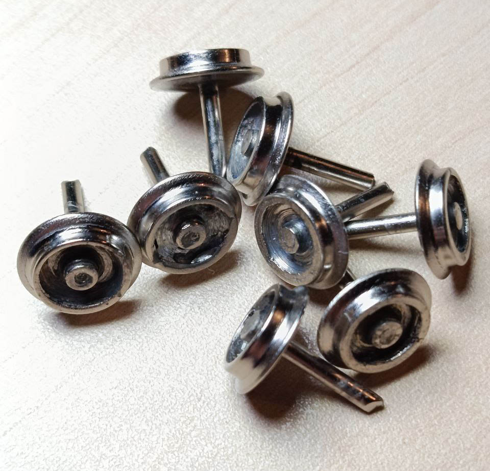пришел раствор для химического никелирования и я сразу его опробовал. Удивительно, но все получилось. Колеса как обычно, спаяны из меди (диаметр 12 мм), осталось в центр залить эпоксидки, что б убрать дырку. В кружку на 0,4 л залил 200 грам раствора и нагрел на газовой плите до 87-93 градусов, если термометр не врет. Потом переставил на спиртовку, опустил колеса (они висят не касаясь дна и друг друга на садовой проволоке) и держал в таком виде порядка 1 часа 15 минут (спиртовке не хватает мощности довести до кипения, но и остыть не дает, что удобно). За это время испарилась половина жидкости и остаток стал заметно мутный. В теории можно долить воды и еще использовать. На дне кружки немного серого осадка (вероятно никель) и зеленых кристаллов, которые плохо отмывались с кружки (а никель полностью и не отмылся, благо я кружку не планировал использовать иначе). Поверхность затянуло без дефектов, кроме как на одном колесе сзади небольшое пятно голой меди. Ради интереса попробовал сзади соскоблить слой кончиком скальпеля, при небольшом усилии он не царапается, а если приложить значительное усилие, то можно процарапать до меди. В инструкции обещают за 1 час слой никеля 10 мкм