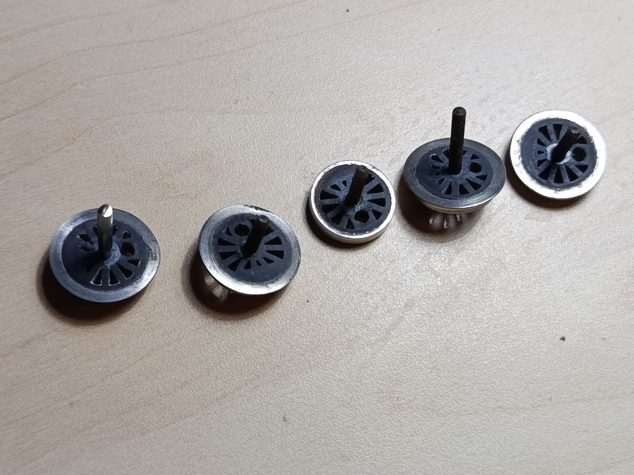 пришел раствор для химического никелирования и я сразу его опробовал. Удивительно, но все получилось. Колеса как обычно, спаяны из меди (диаметр 12 мм), осталось в центр залить эпоксидки, что б убрать дырку. В кружку на 0,4 л залил 200 грам раствора и нагрел на газовой плите до 87-93 градусов, если термометр не врет. Потом переставил на спиртовку, опустил колеса (они висят не касаясь дна и друг друга на садовой проволоке) и держал в таком виде порядка 1 часа 15 минут (спиртовке не хватает мощности довести до кипения, но и остыть не дает, что удобно). За это время испарилась половина жидкости и остаток стал заметно мутный. В теории можно долить воды и еще использовать. На дне кружки немного серого осадка (вероятно никель) и зеленых кристаллов, которые плохо отмывались с кружки (а никель полностью и не отмылся, благо я кружку не планировал использовать иначе). Поверхность затянуло без дефектов, кроме как на одном колесе сзади небольшое пятно голой меди. Ради интереса попробовал сзади соскоблить слой кончиком скальпеля, при небольшом усилии он не царапается, а если приложить значительное усилие, то можно процарапать до меди. В инструкции обещают за 1 час слой никеля 10 мкм