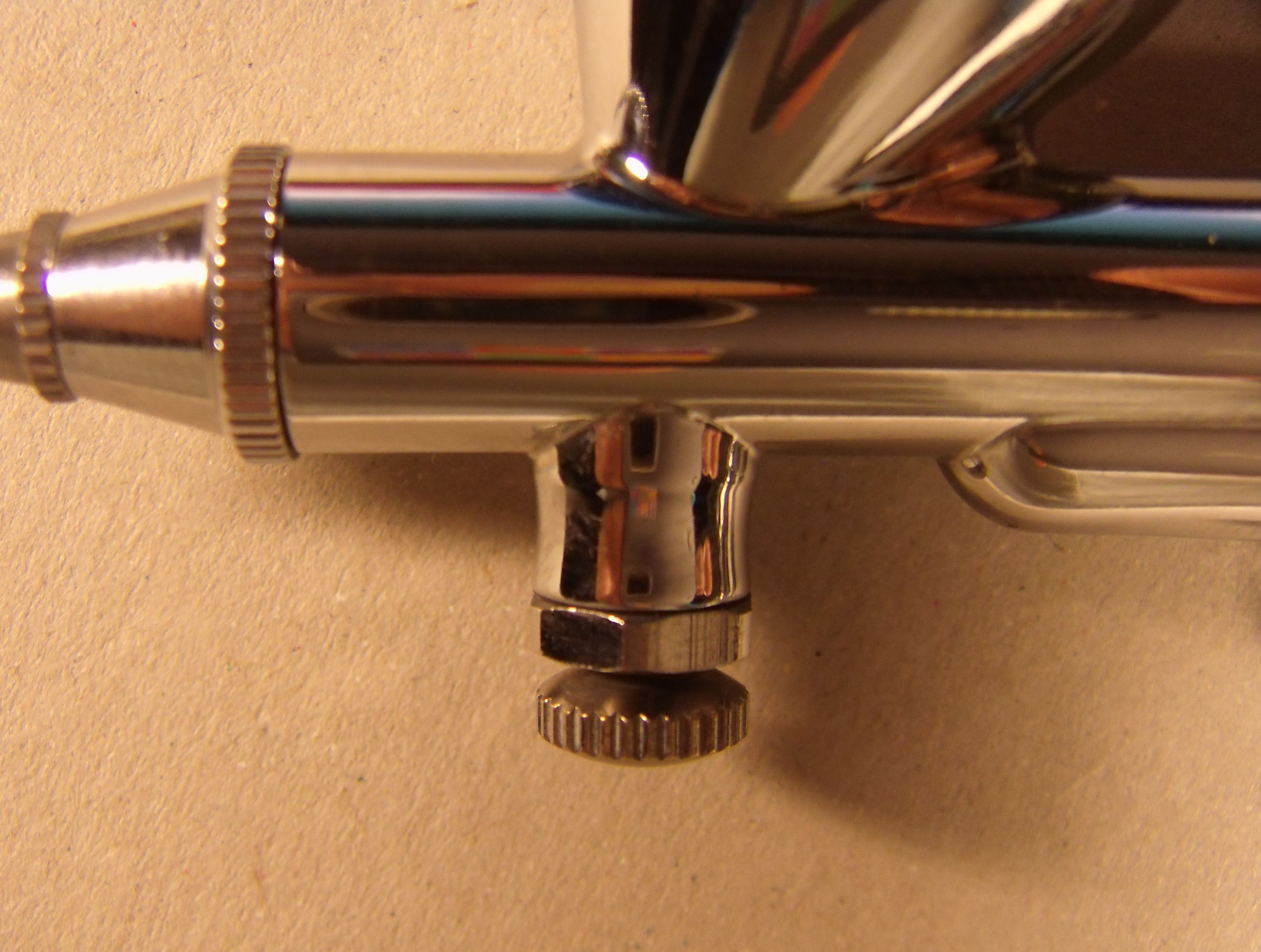 В процессе эксплуатации мне было очень удобно пользоваться вот этой ручкой - это регулятор подачи воздуха, т.е. струя мощнее-слабее, подкрутил её чуть и все - теперь рычаг иглы-сопла можно не думая отодвигать до упора, и сосредотачиваться на модели.