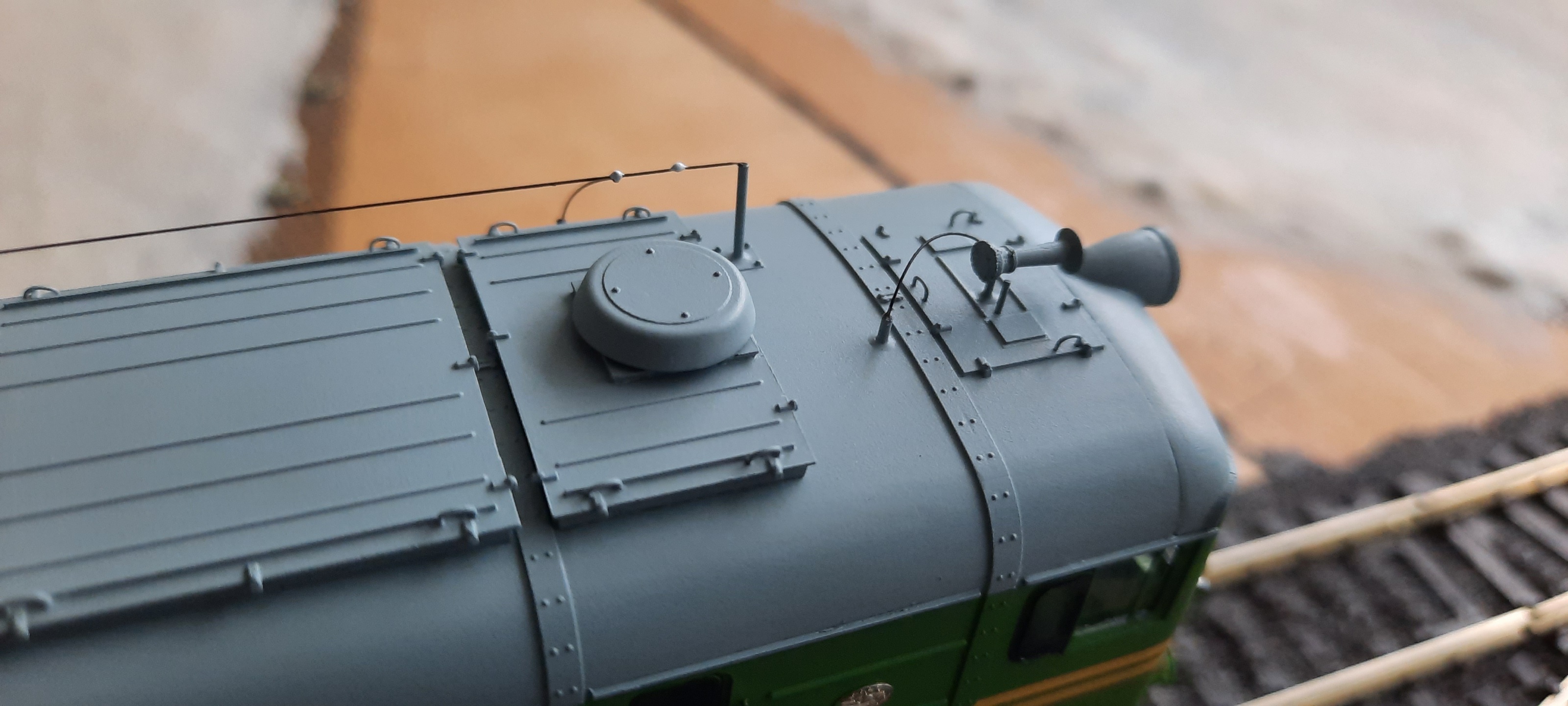 Редко сажусь делать что-то сейчас... Но иногда приходят мысли что-то дополнить. Решил немного обширнее сделать деталировку межсекционного пространства: в наборе не предусмотрен брус, на который цепляются шланги. Вырезал его из какого-то завалявшегося куска пластика. А потом протянул шланги наверх в раму. Понятное дело, они там под рамой как-то крепятся и куда-то идут. Но таких подробностей я уже не знаю, поэтому сделал ту часть, которую можно рассмотреть на имеющихся в сети фото тепловоза.