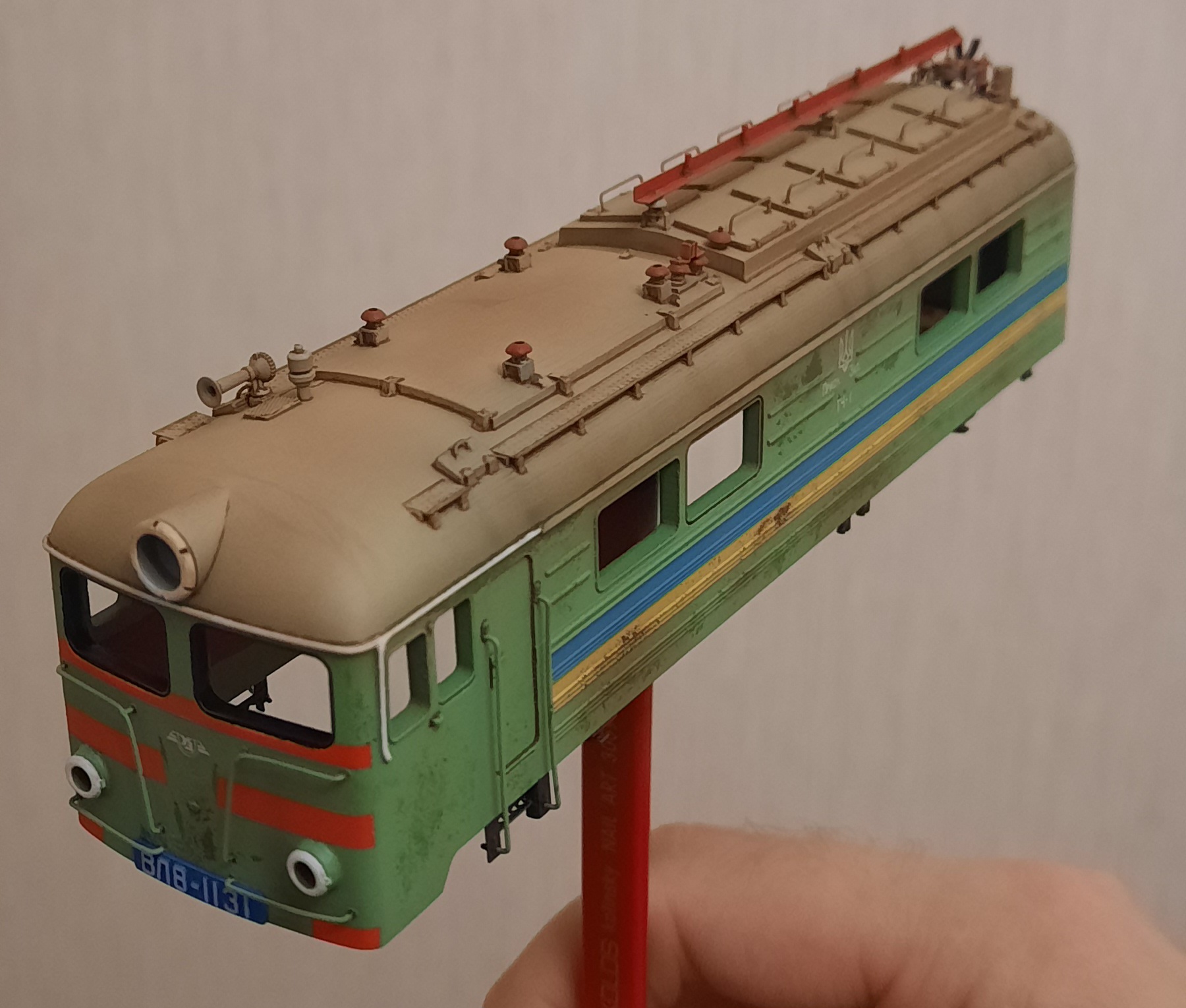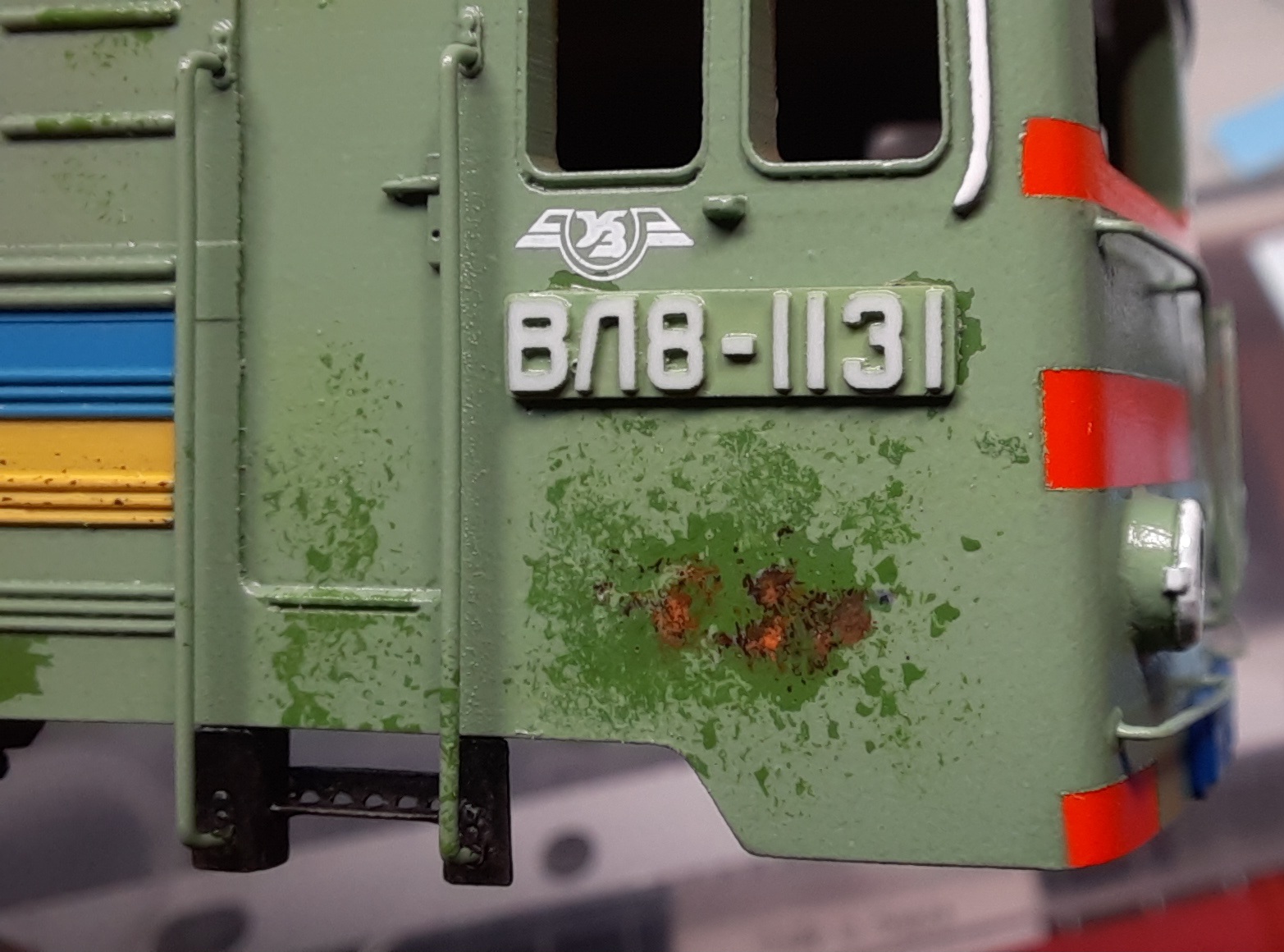 Что объединяет крышу ВЛ8 любого рода везеринга? бОльшая засраность на плоскости и меньшая на скатах крыши по бокам. Это естественно: пыль и грязь на горизонтальных поверхностях лежат и накапливаются, а на склонах не задерживаются в таком количестве. У меня это практически не было видно. Сделав на базе основного пигмента на ВЛ8 более тёмный оттенок и нанеся его на плоскости крыши, я получил желаемое. Потом ещё струйки потёков надо добавить, и с кузовами готово.