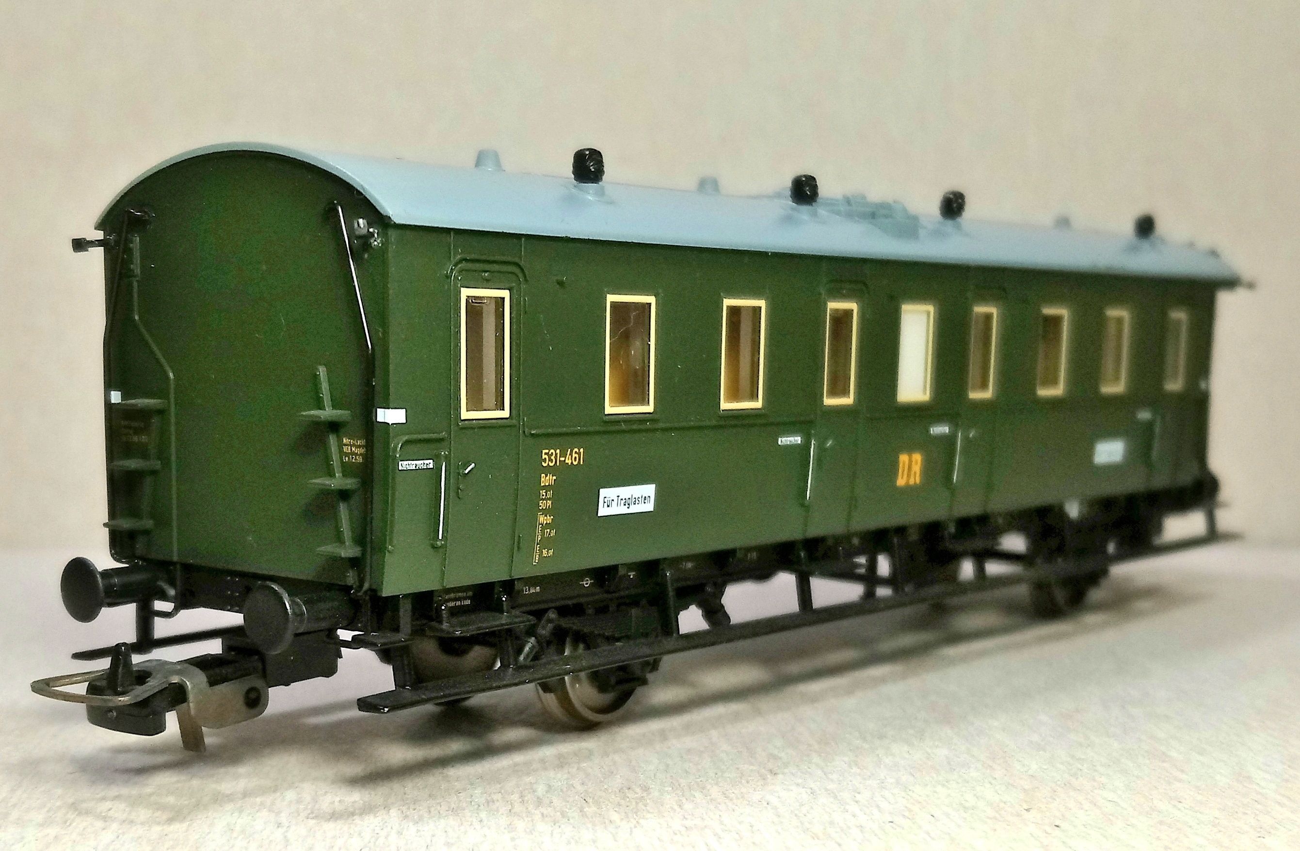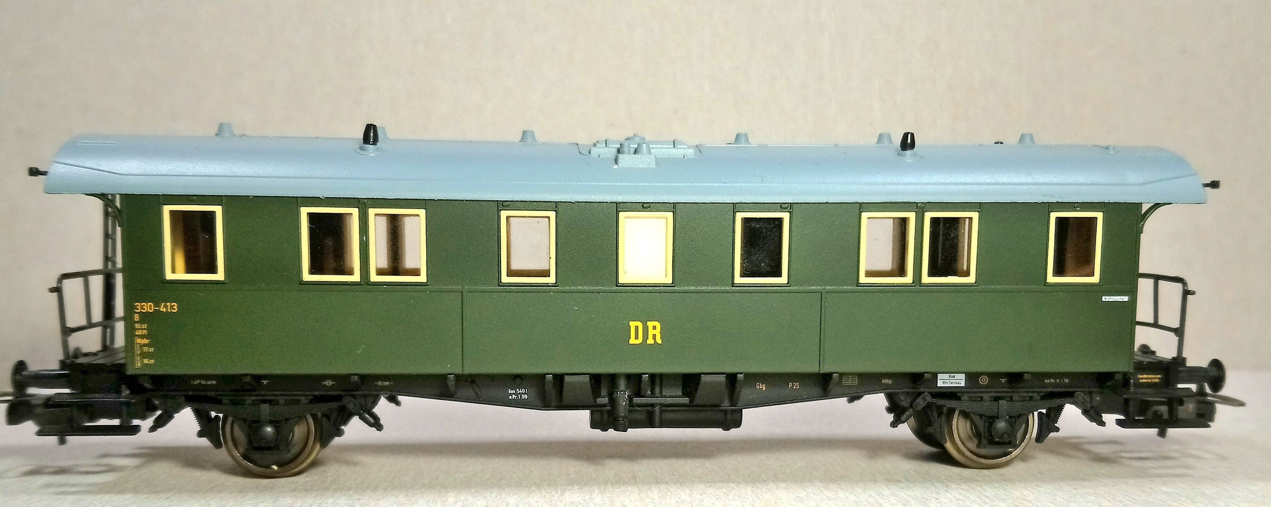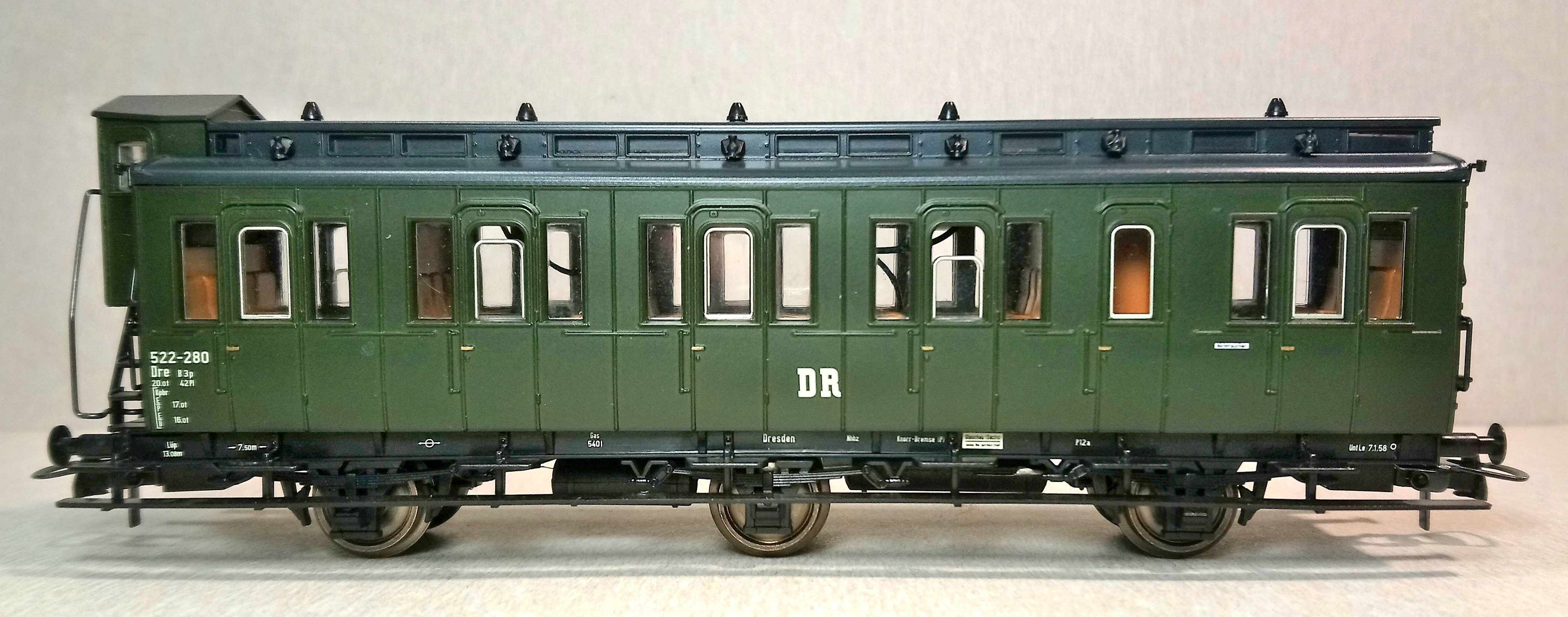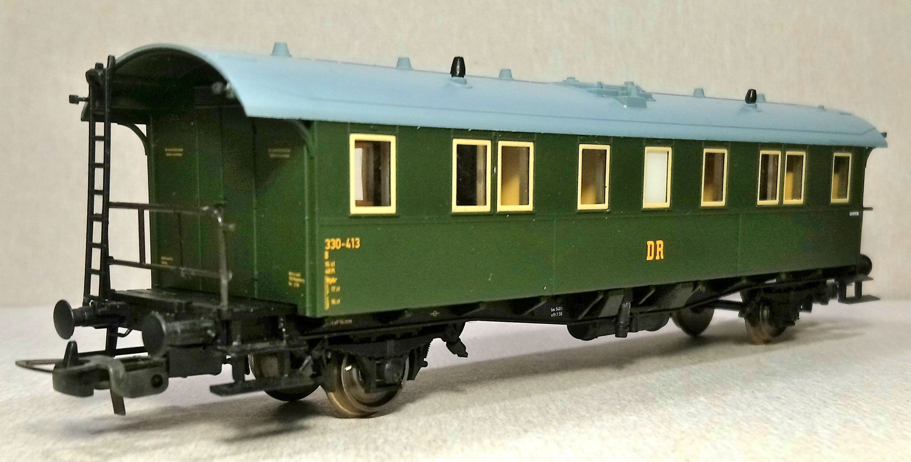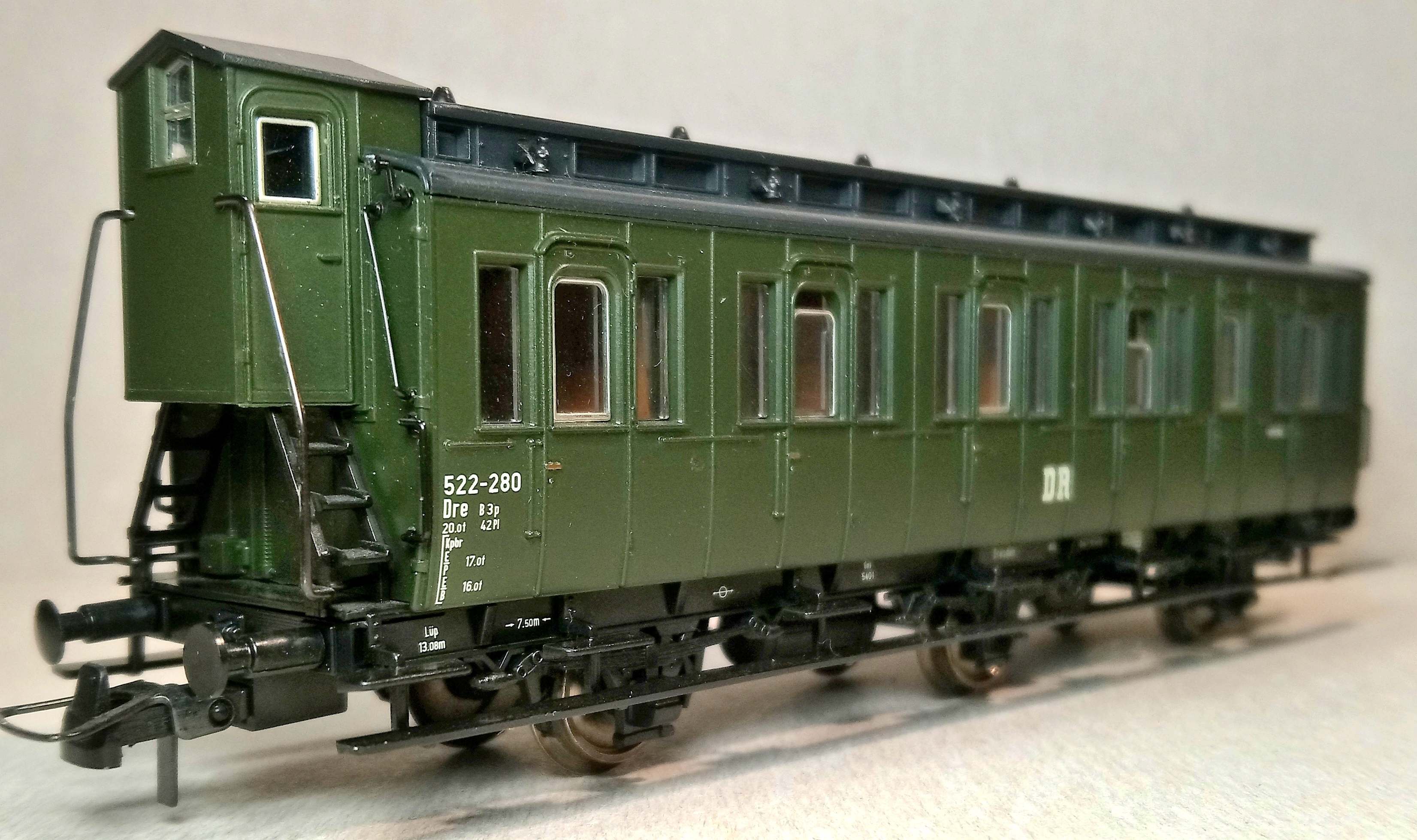 Пересмотрел все свои 3-осные каретники в наборах Roco 43025 и Roco 43026 (+44499), там всё в порядке, - средняя ось ложится на рельсы как и остальные, катится всё вместе. На всех вагонах одинаковые спицованные колпары Roco 40188 (диаметр колёс 11мм, ось 24,75мм, между ребордами 14,3мм).