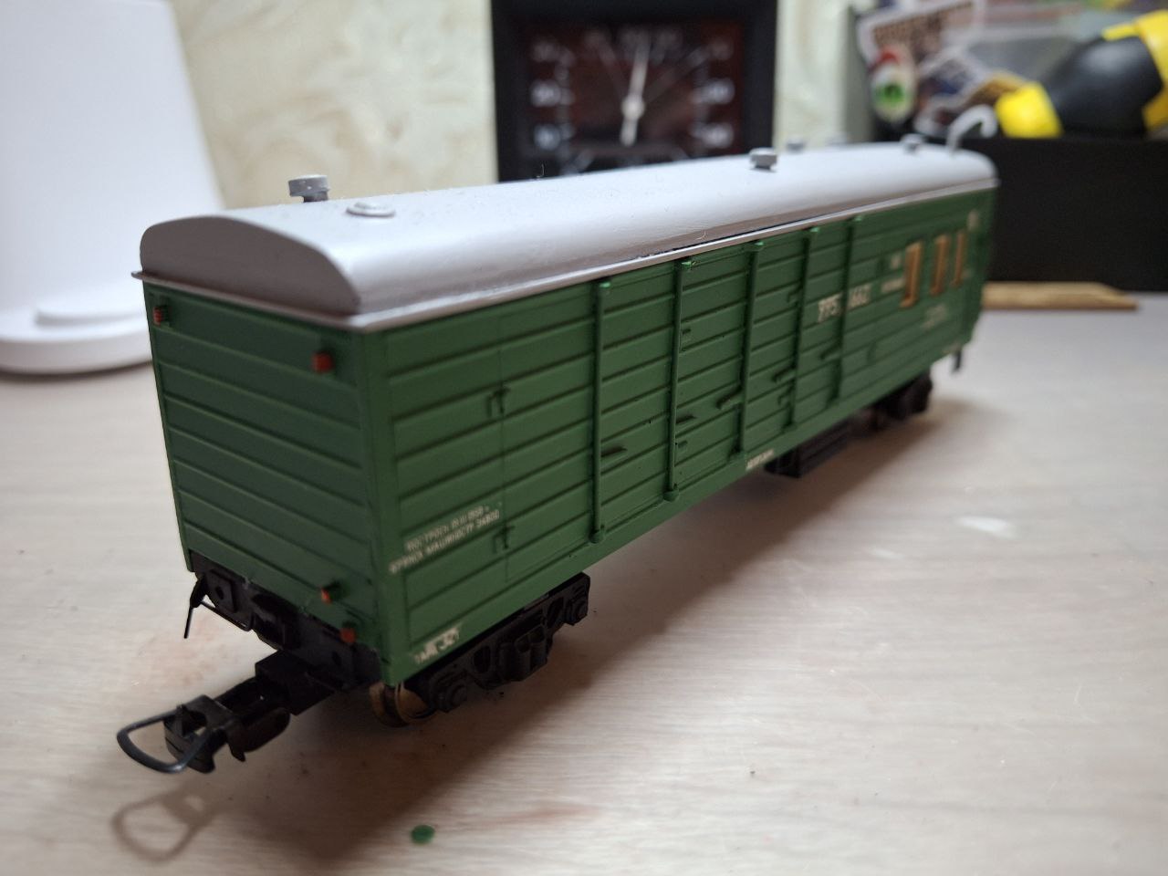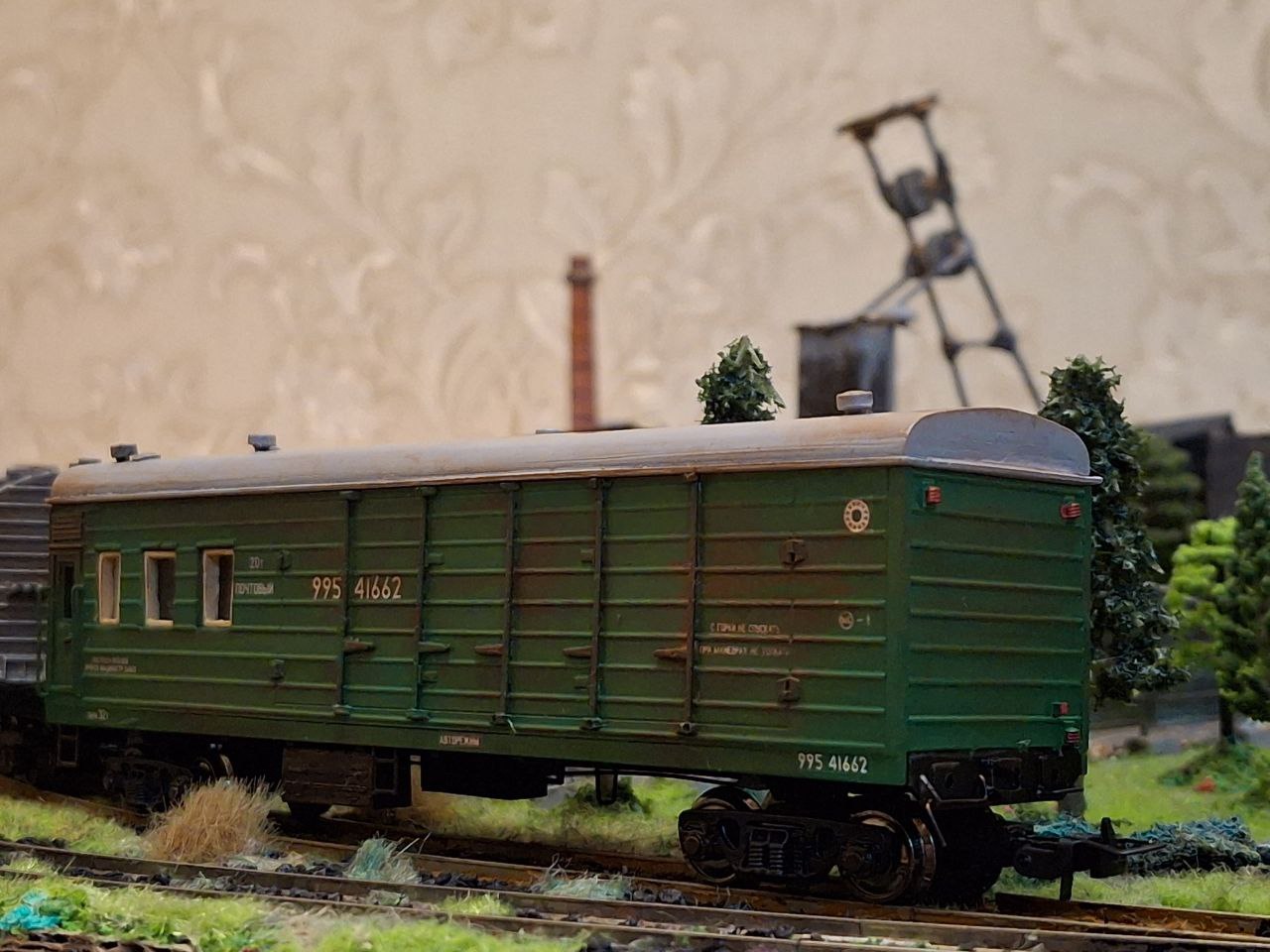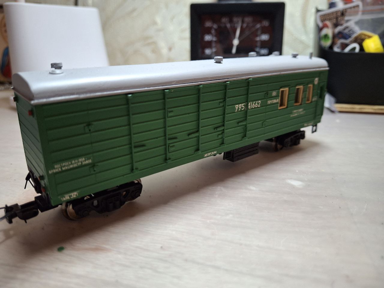 Нещодавно моя колекція поповнилася ось таким цікавим спец.вагоном.Робота В.Орешко(якщо не помиляюсь).Модель зацікавила своєю багатофункціональністю,його використовували як:багажний,поштовий,хліборозвозочний і пізніше бригадний або вагон супроводження.Для мого відновлювального составу він ідеально підійшов і буде їздити разом з жд краном.