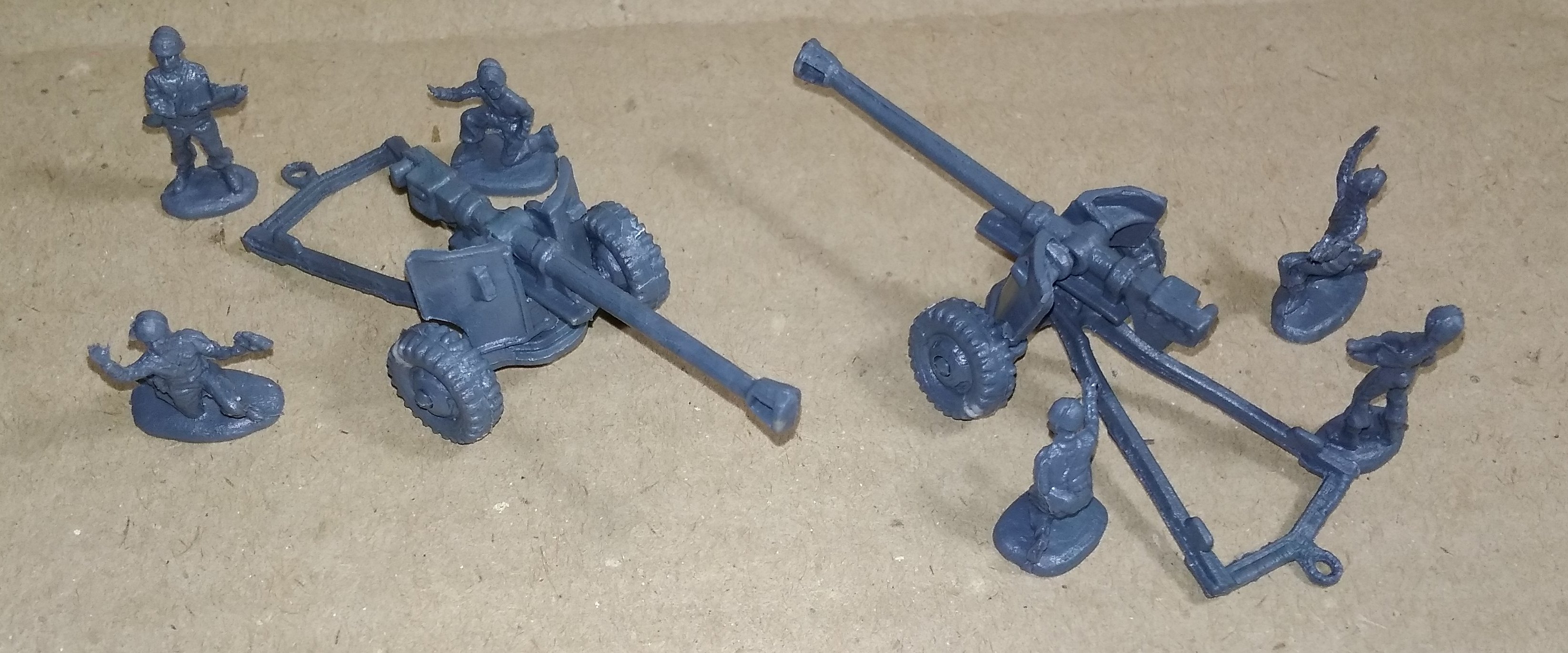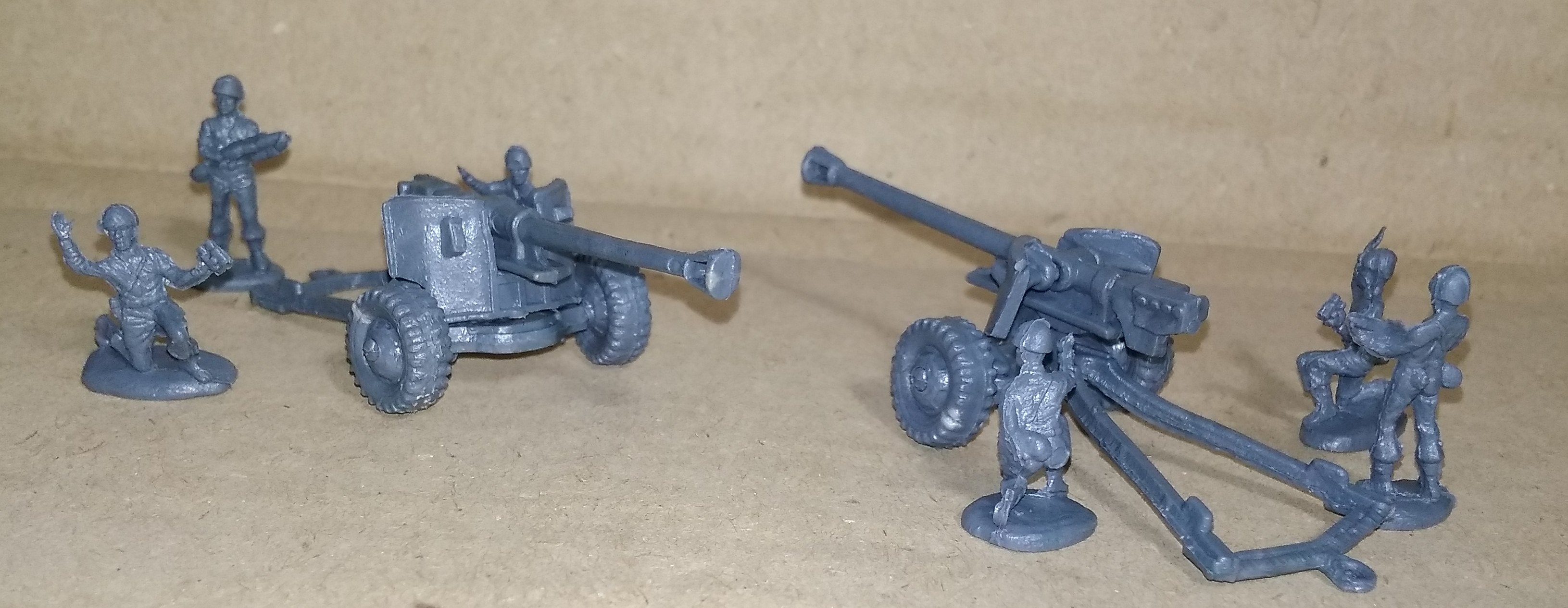 Купили внуку солдатиков, играть. И попалось там среди фигурок 72-го масштаба (25мм) две пушки с расчётами. Фигурки около 20 мм, что прмерно соответствует 87-му масштабу. У пушек стволы поднимаются, колеса вращаются, станины поворачиваются относительно оси колёс. В принципе, если чуть доработать и покрасить, можно ставить на платформу или диараму. Когда игрушка внуку надоест, займусь, если они к тому времени уцелеют.