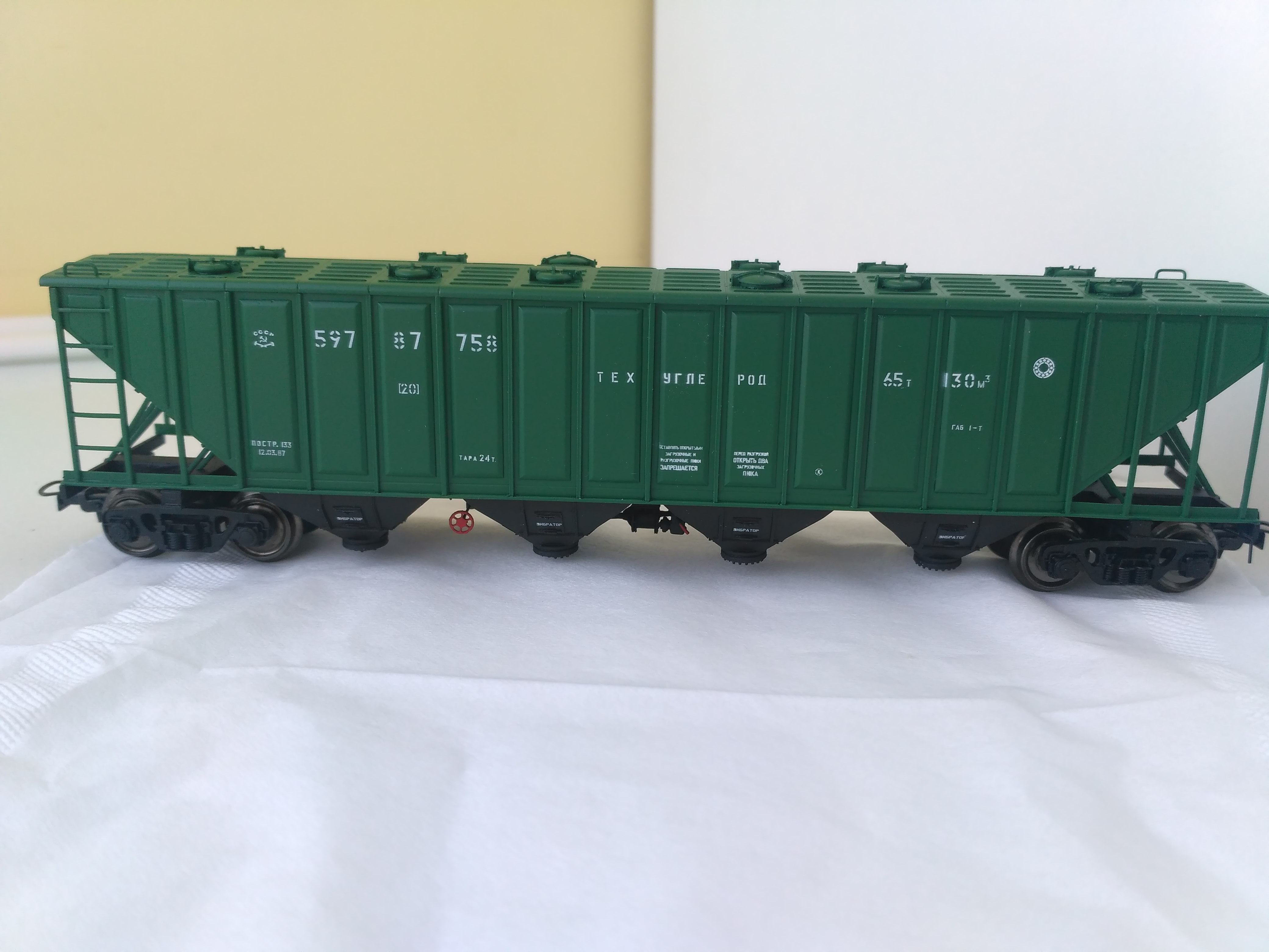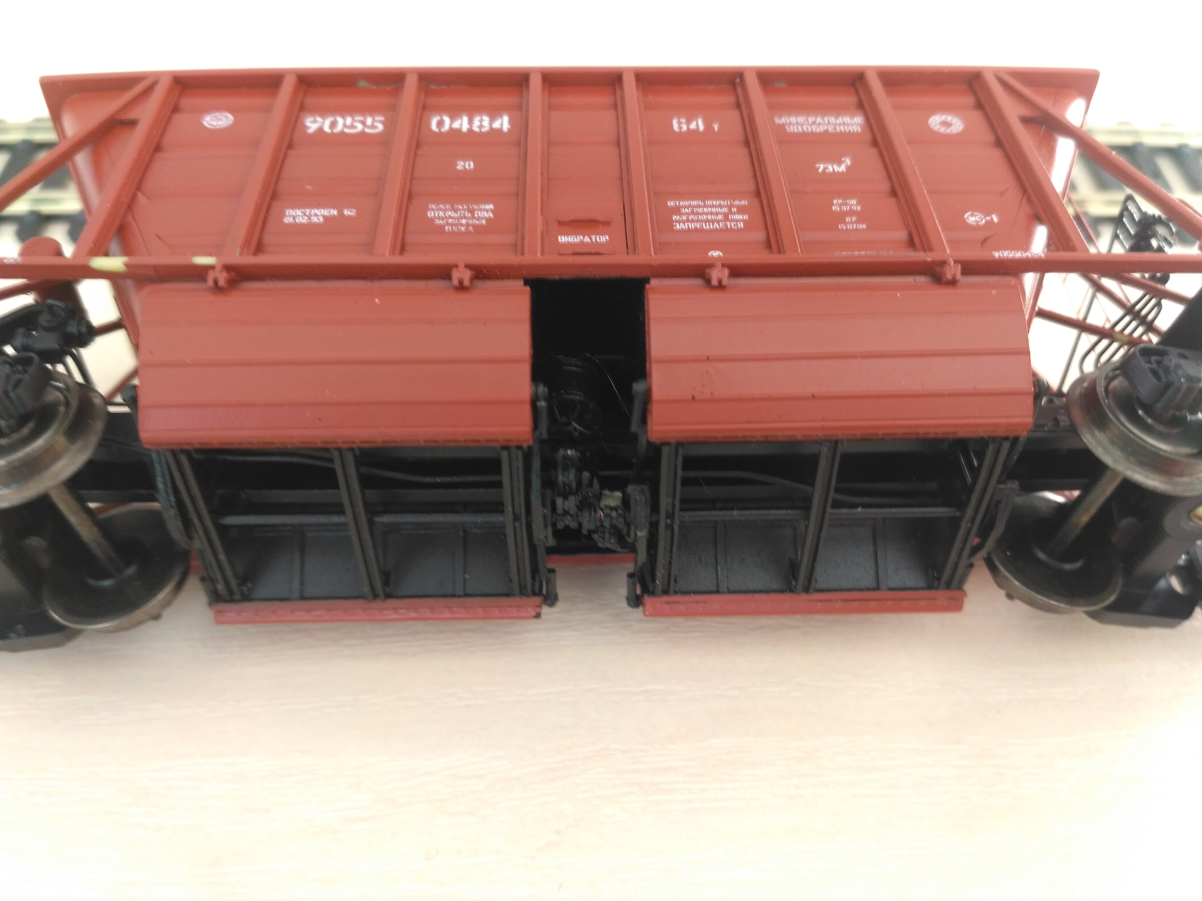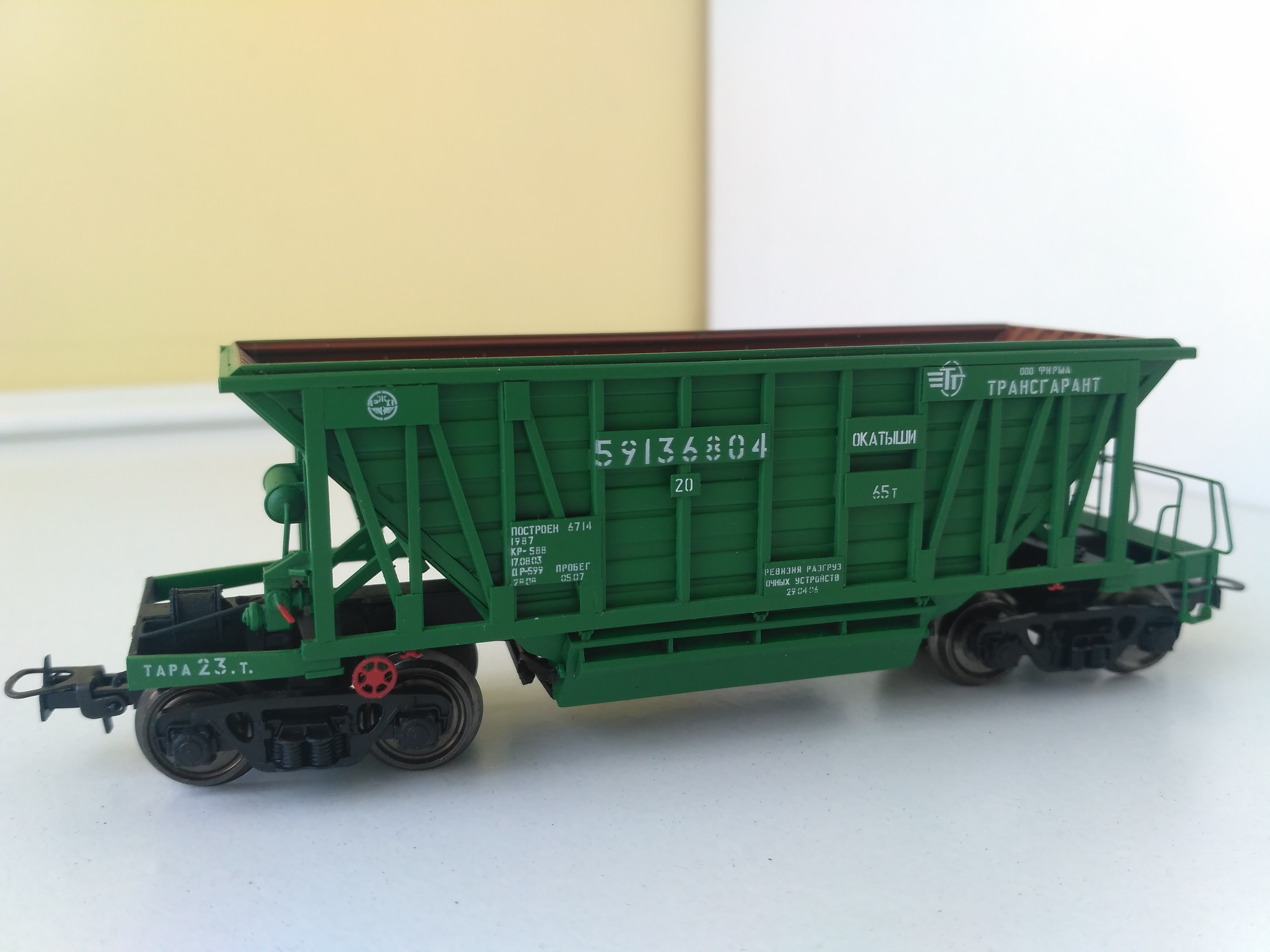 Та же участь постигла и модели вагонов для горячего агломерата и окатышей. Три модификации, неоднократный повтор с рестайлингом. С моей точки зрения вагончик непростой по своей геометрии и тем, что имеет две лицевых поверхности - наружную и внутреннюю при достаточно небольшой толщине стенки для сохранения зрительного восприятия. Подвижных деталей нет , но они богаты многочисленными надписями , нанесенными под трафарет.