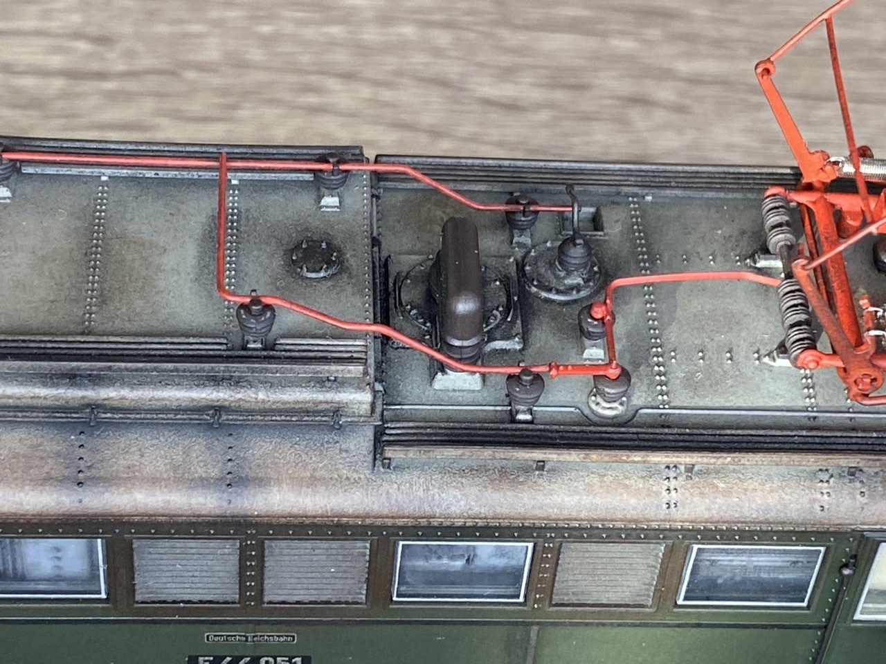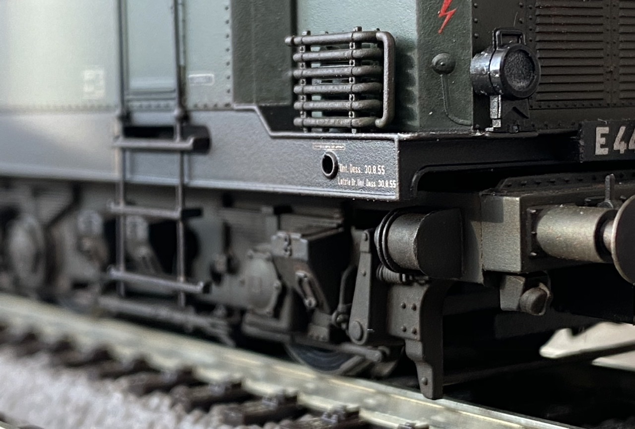 В данном случае, даты всех ревизий на электровозе схожи, видимо по причине того, что в середине 50-ых, практически все локомотивы Е 44, перед выпуском их на дороги Рейсбана, проходили капитальный ремонт. Судя по дате, это как раз такой выпускник.